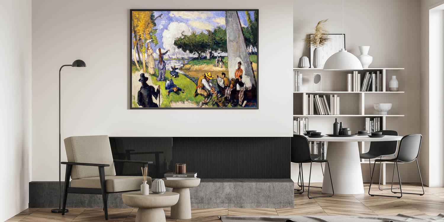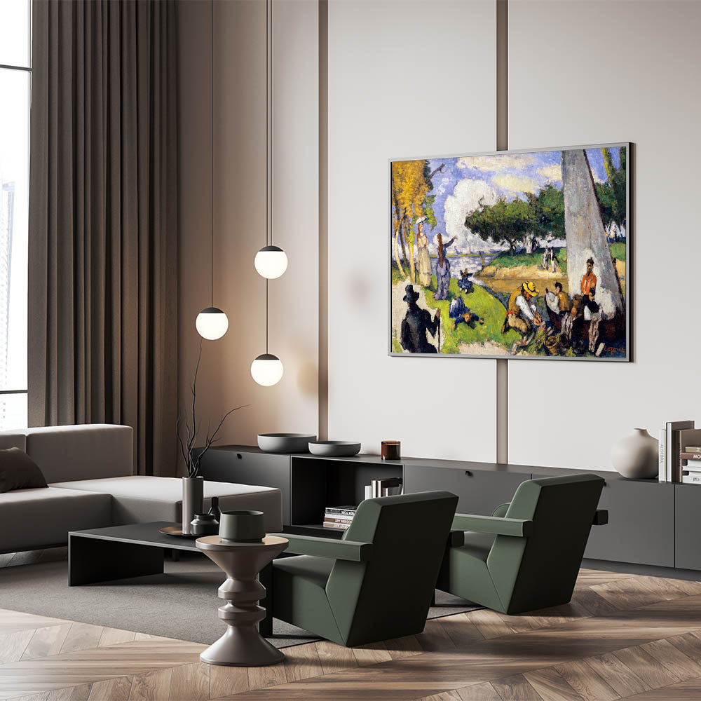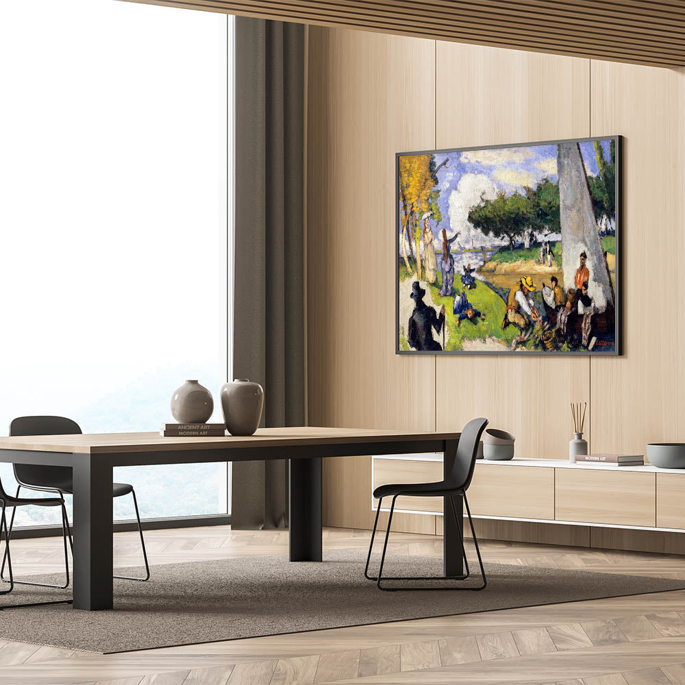 Bring the charm of Impressionism into your home with this stunning wall art inspired by the famous French Impressionist style. This painting beautifully captures a tranquil riverside scene with fishermen and lively figures enjoying a serene day. The artwork’s vibrant colors, fluid brushstrokes, and light-filled ambiance exemplify the essence of Impressionist landscapes.
