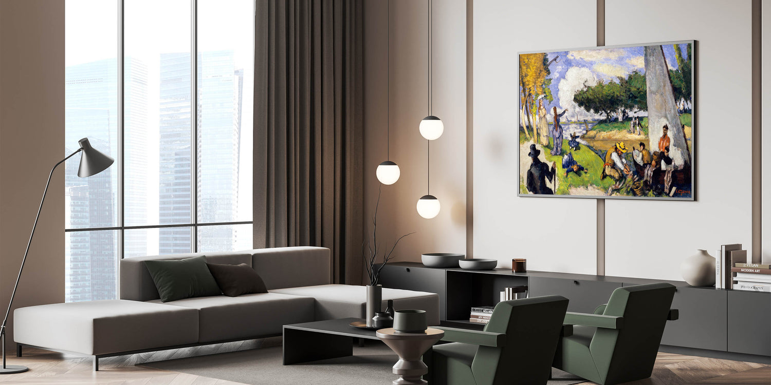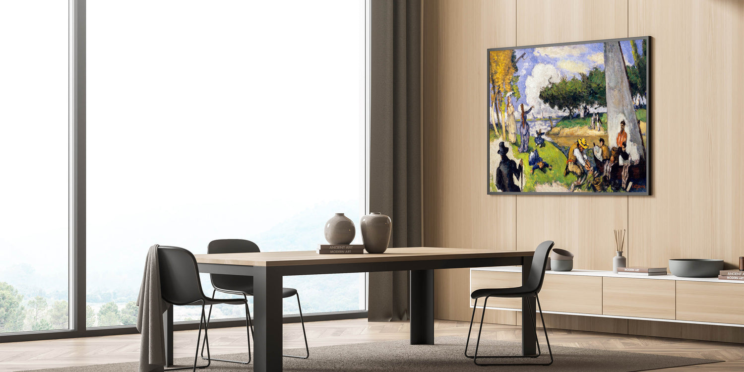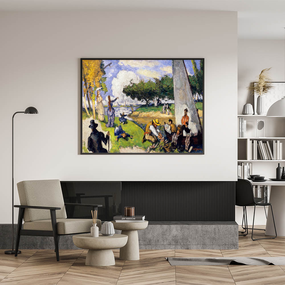Bring the charm of Impressionism into your home with this stunning wall art inspired by the famous French Impressionist style. This painting beautifully captures a tranquil riverside scene with fishermen and lively figures enjoying a serene day. The artwork’s vibrant colors, fluid brushstrokes, and light-filled ambiance exemplify the essence of Impressionist landscapes.