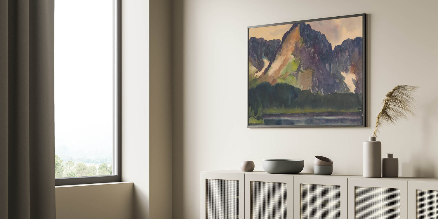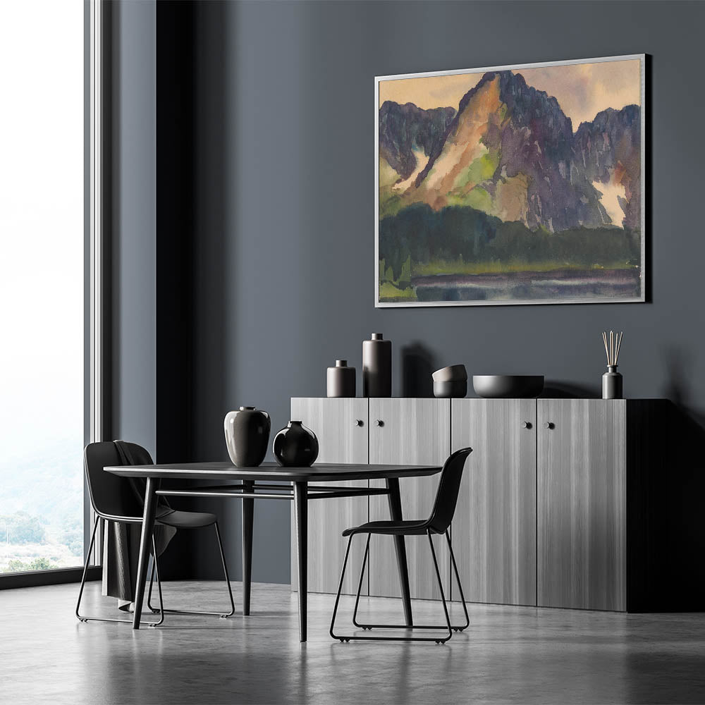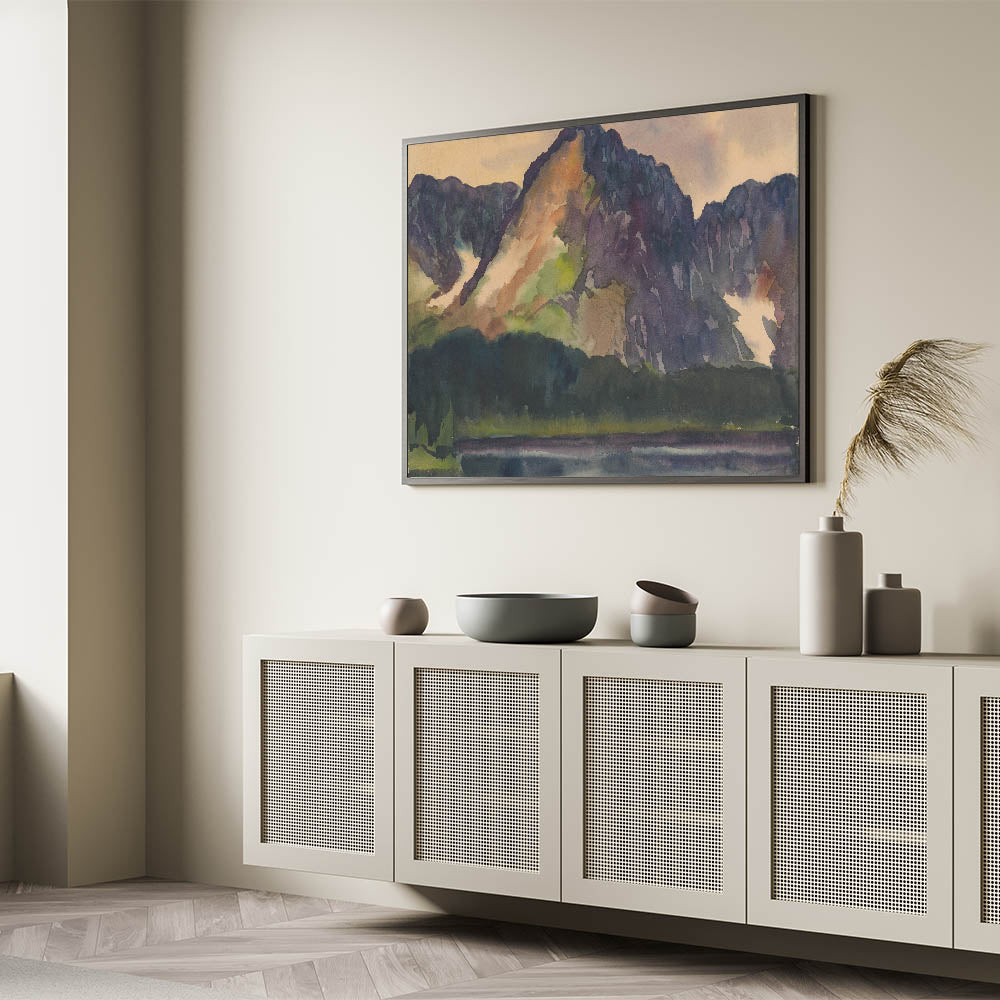 Elevate your space with Rocky Hills Above River by Zolo Palugyay, a captivating watercolor painting that exudes the tranquil beauty of nature. This piece beautifully captures towering rocky hills in hues of violet, green, and gold, set against the reflective calm of a flowing river. The soft interplay of light and shadow creates a dreamlike ambiance, immersing the viewer in a serene mountain retreat.