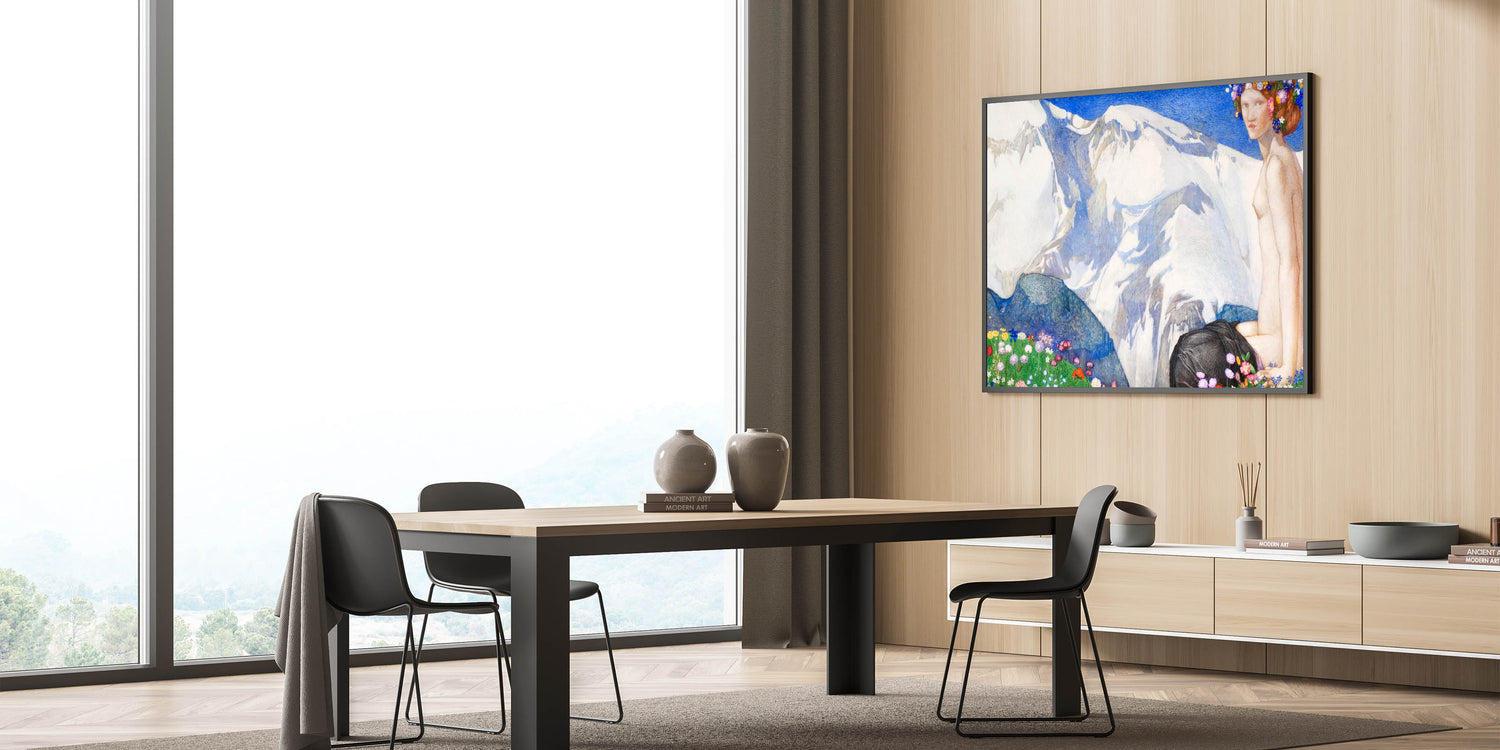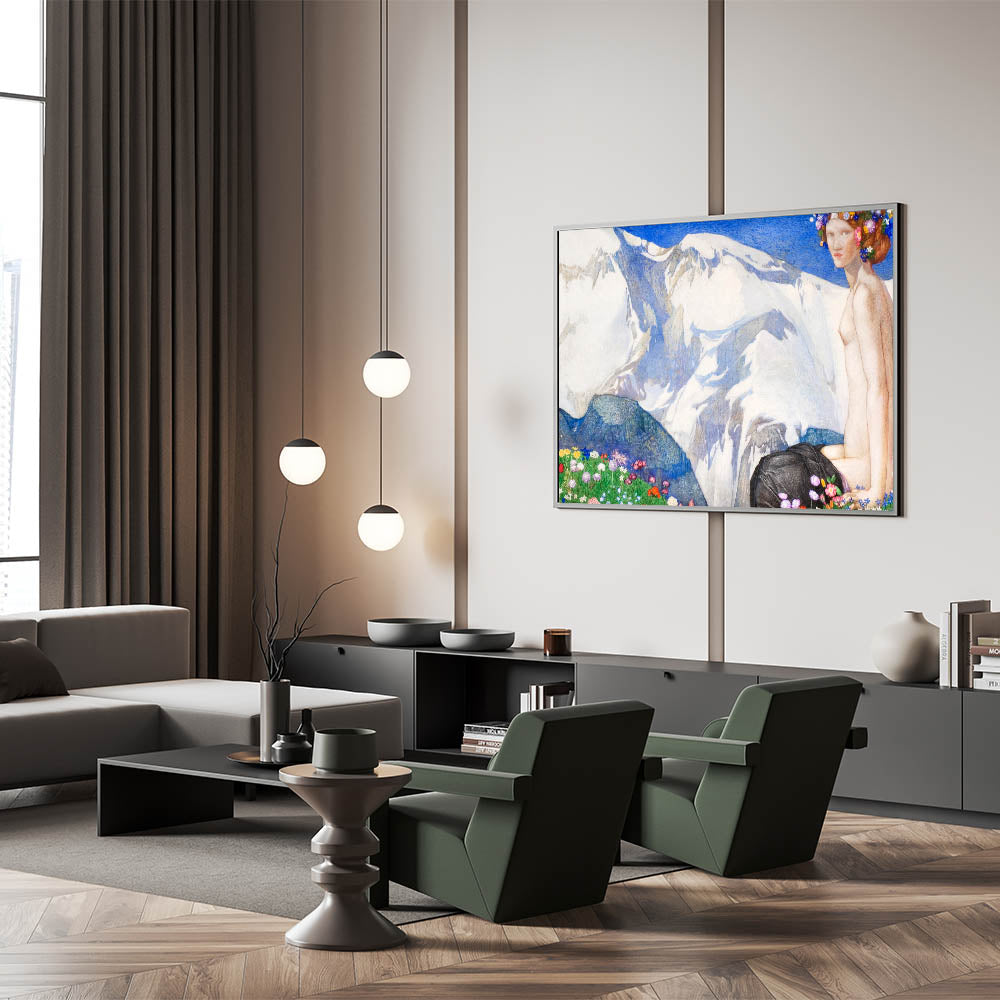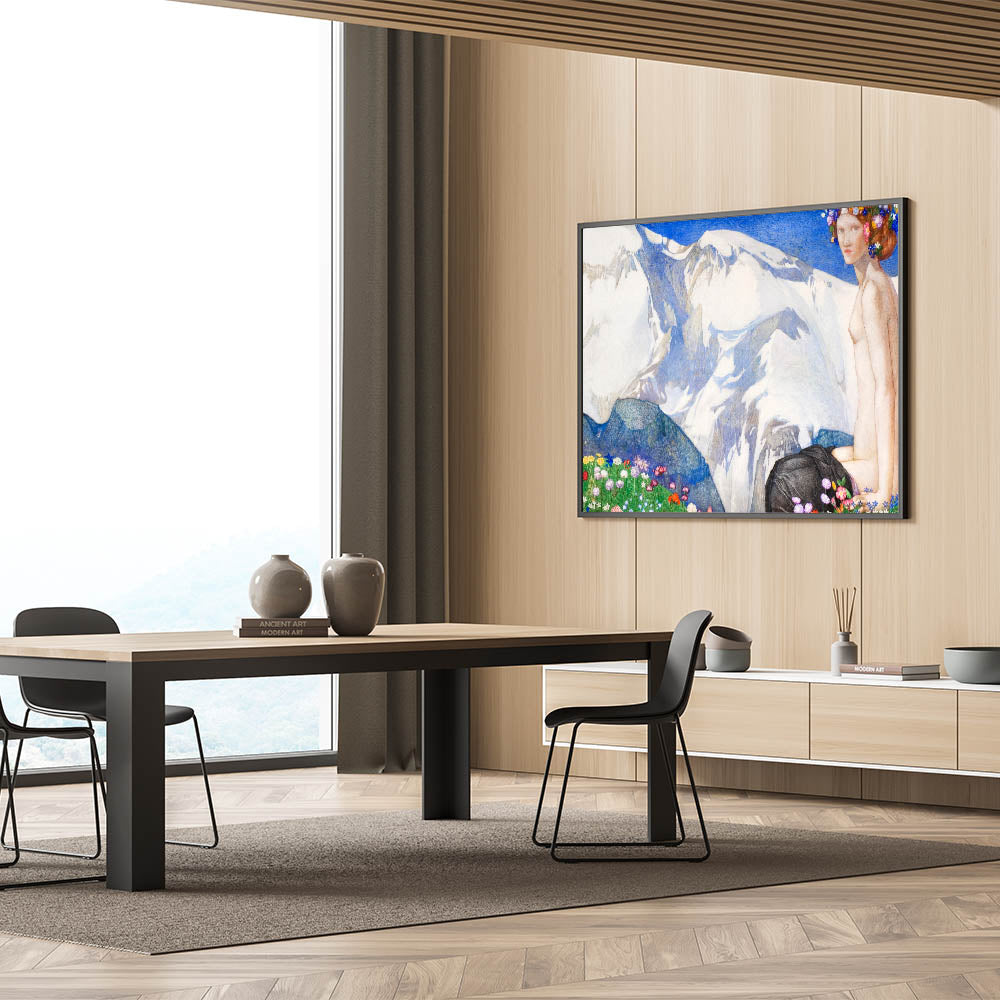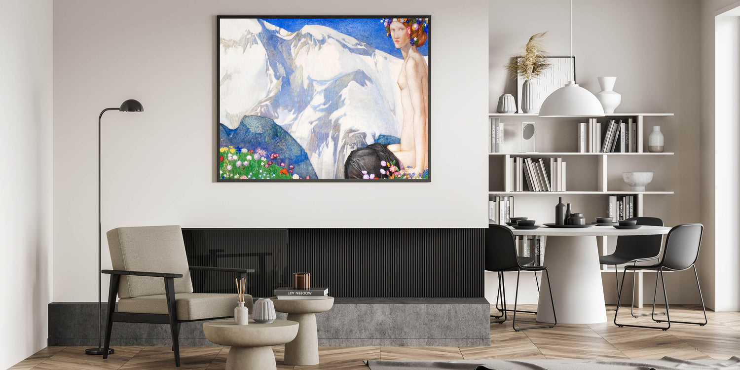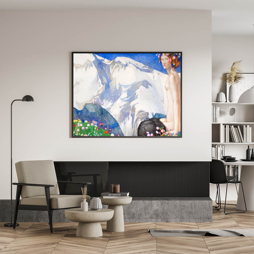 Immerse yourself in the serene beauty of the Alps with this exquisite piece of Modern Wall Art, inspired by Edward Reginald Frampton's "Flora of the Alps." This artwork captures a harmonious blend of majestic mountains, vibrant wildflowers, and a serene figure adorned with a floral crown. Ideal for adding a dreamy, natural touch to contemporary decor, this piece brings the beauty and tranquility of the mountains into any space.