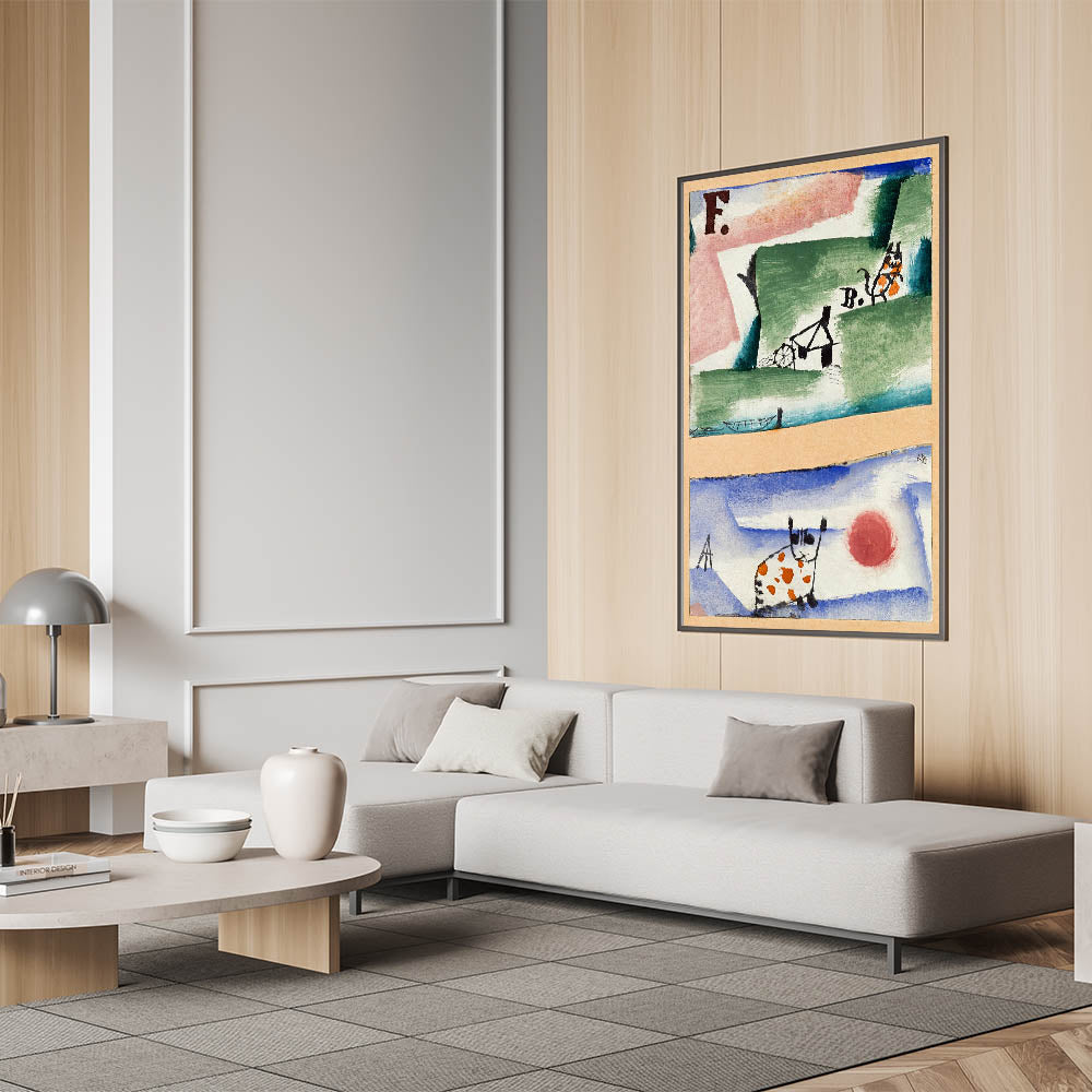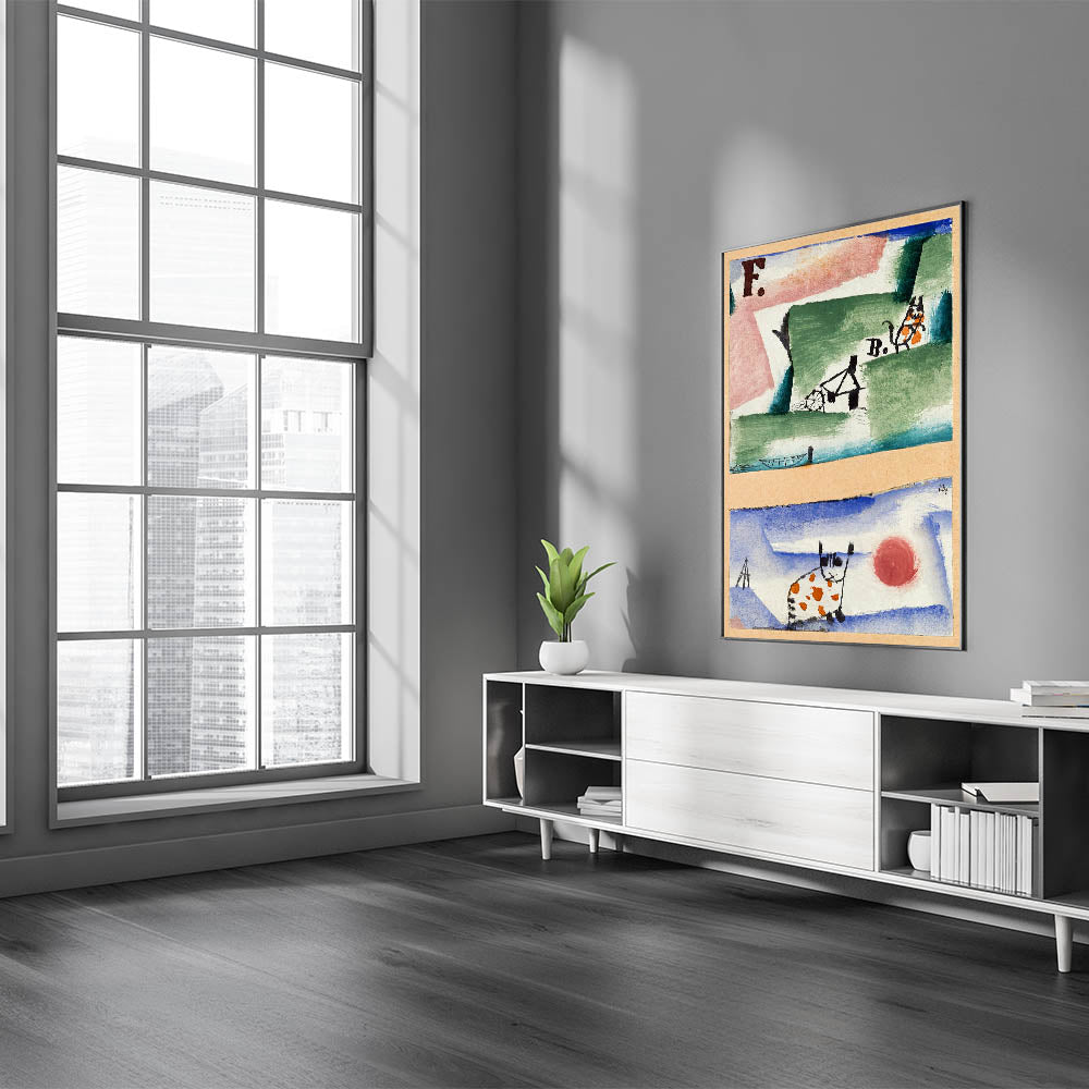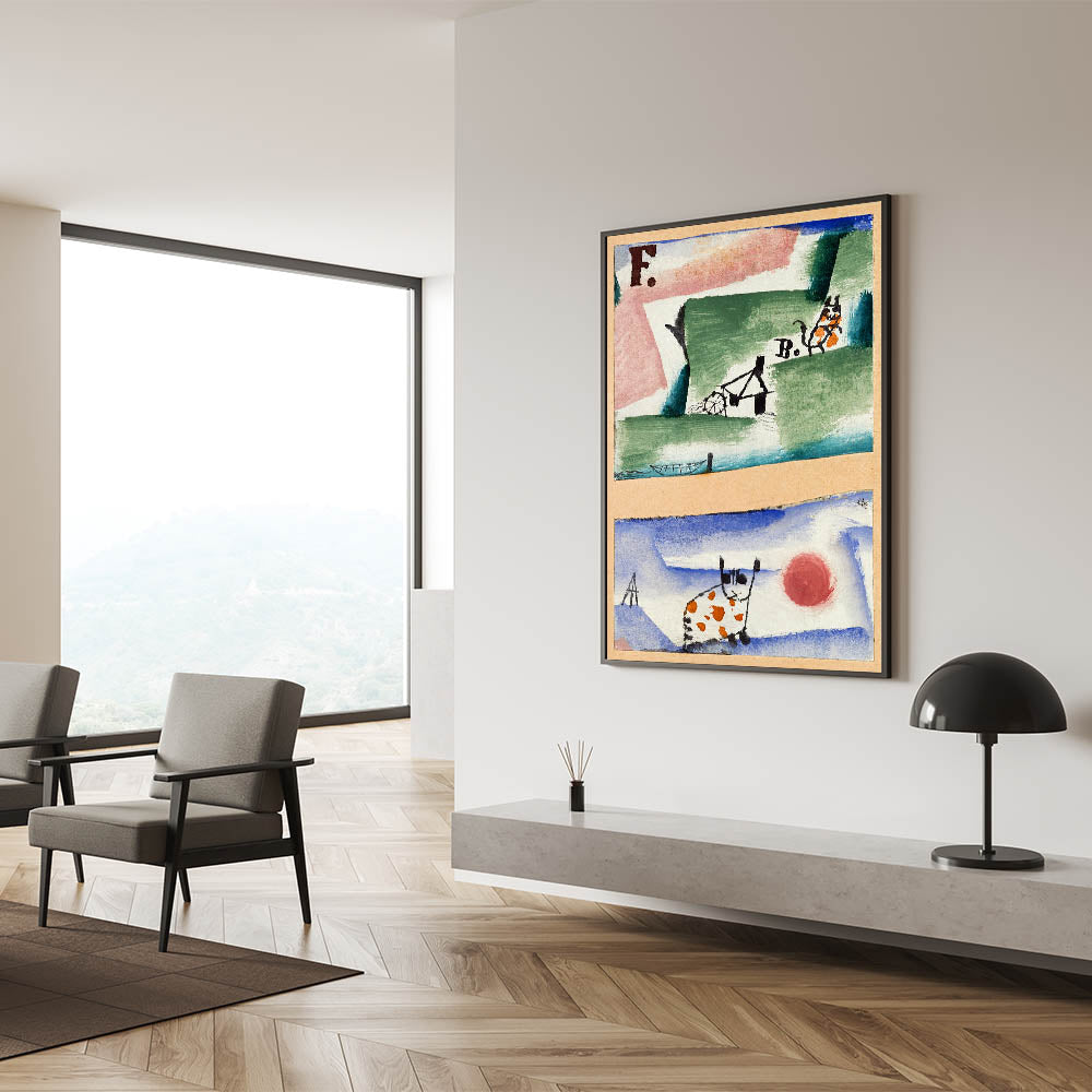 Inject charm and creativity into your space with this whimsical modern wall art inspired by Paul Klee's playful abstract style. Featuring a blend of earthy greens, sky blues, and lively orange accents, this artwork showcases unique depictions of cats and surreal landscapes. The imaginative composition and vibrant palette make it a delightful addition to contemporary spaces, blending fun with sophistication.