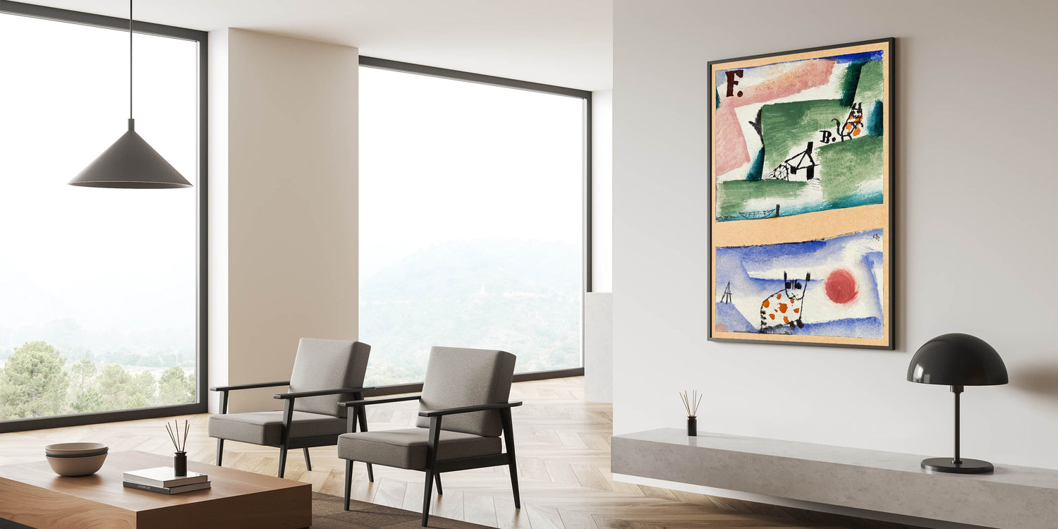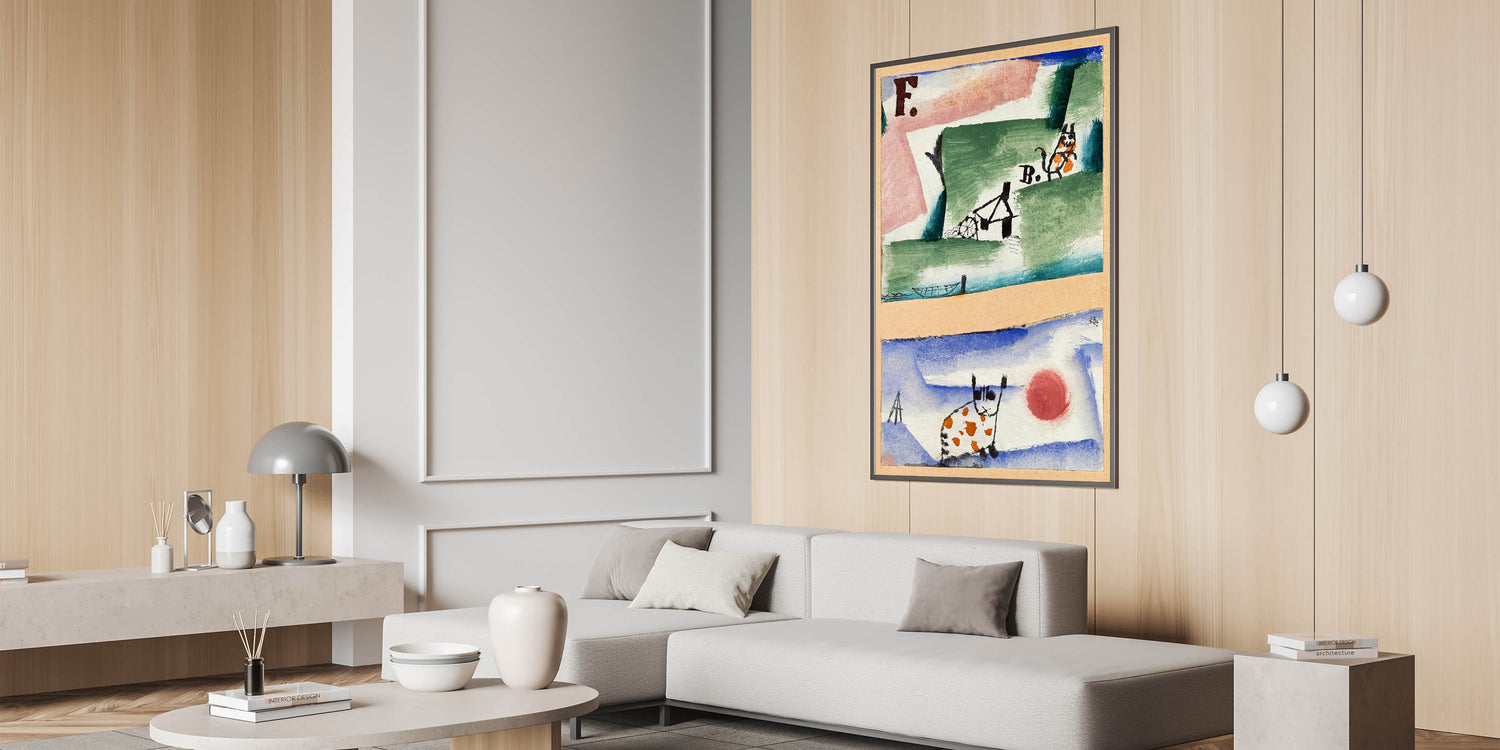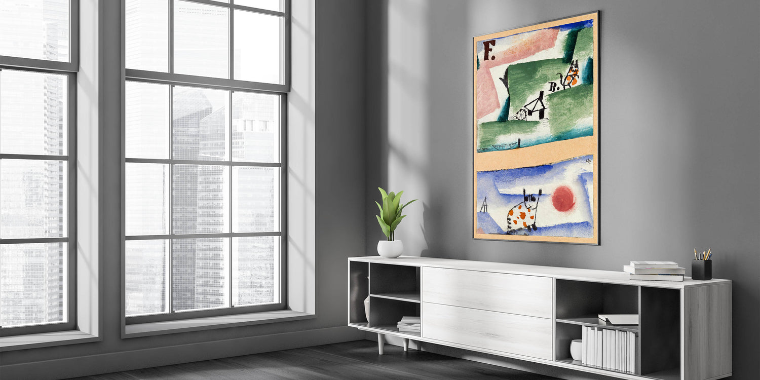 Inject charm and creativity into your space with this whimsical modern wall art inspired by Paul Klee's playful abstract style. Featuring a blend of earthy greens, sky blues, and lively orange accents, this artwork showcases unique depictions of cats and surreal landscapes. The imaginative composition and vibrant palette make it a delightful addition to contemporary spaces, blending fun with sophistication.