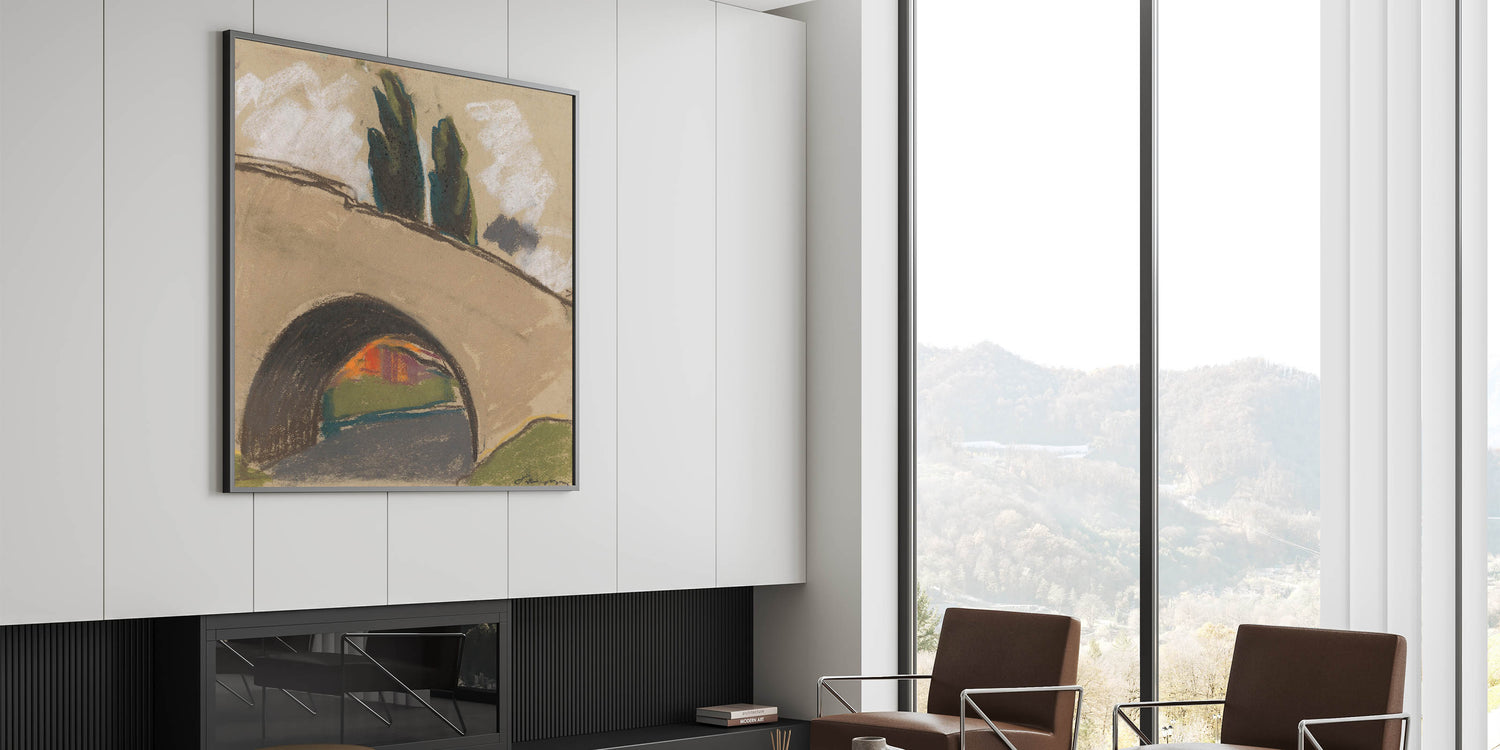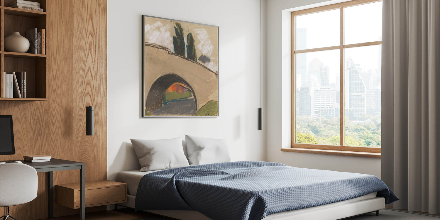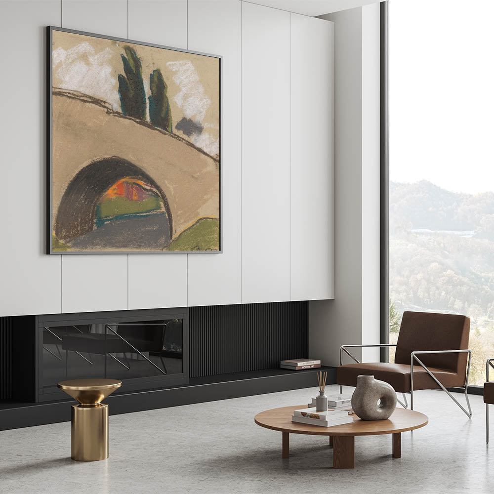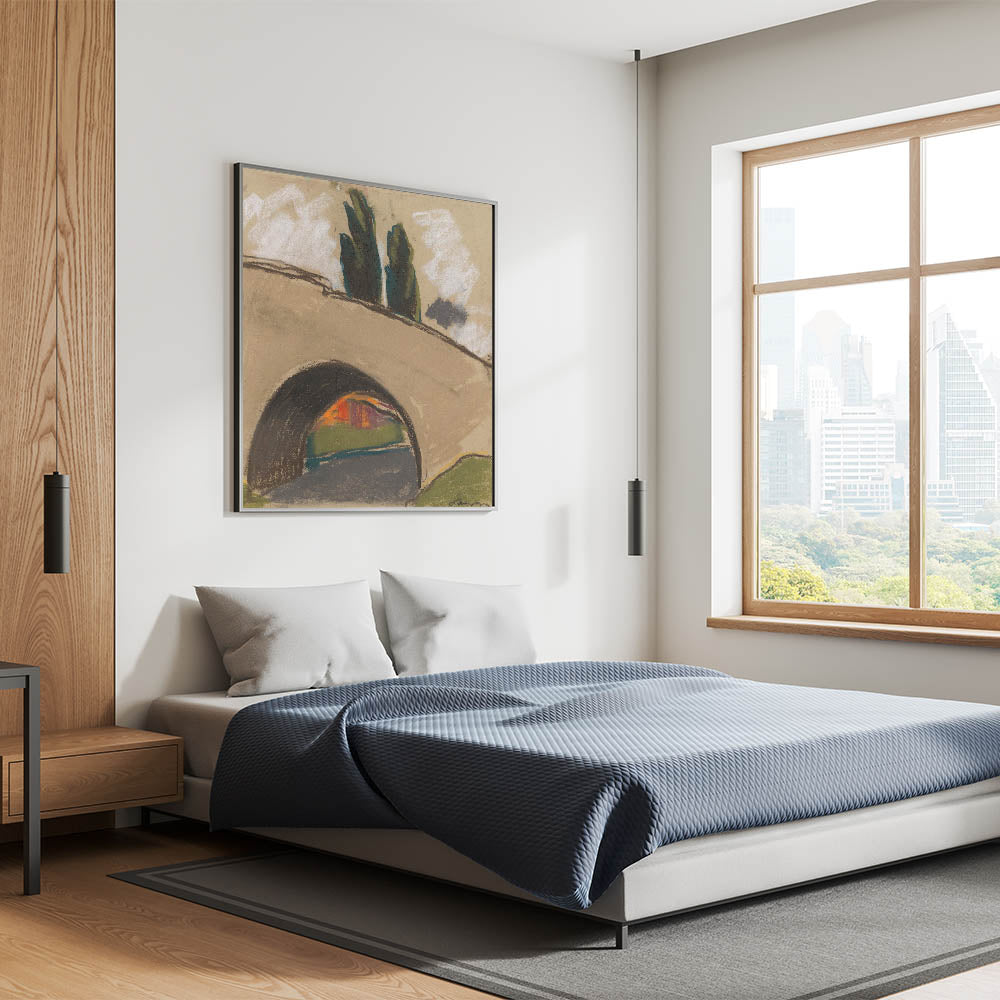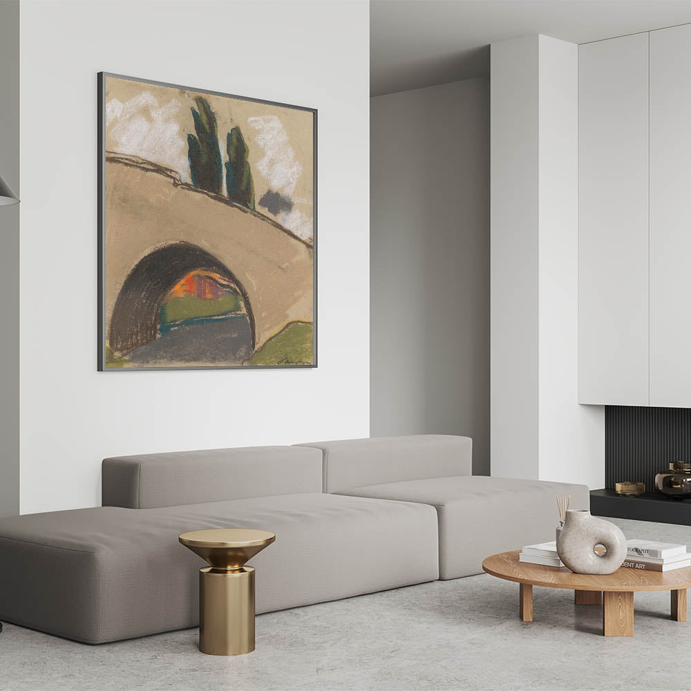 Transform your living space with Zolo Palugyay's Village Bridge Over a River, a stunning modern artwork that blends abstract and natural elements in a harmonious composition. This piece captures the charm of rural landscapes with its earthy tones and minimalist design. The arching bridge leads the eye to a vibrant hint of color beyond, symbolizing the hidden beauty of nature. Palugyay's bold use of pastels and simplified forms creates a serene yet dynamic visual effect, making this piece a perfect addition to any modern art collection.
