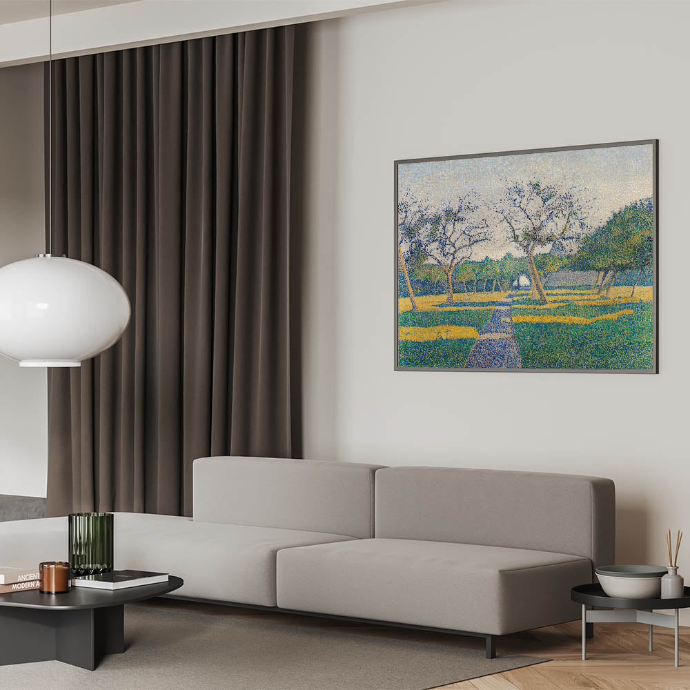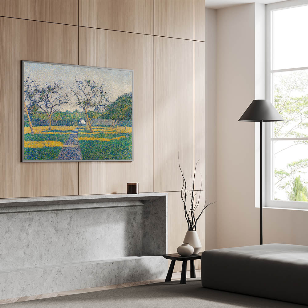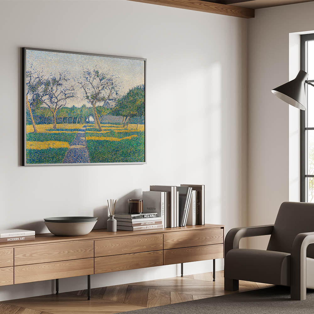 Add a touch of elegance and artistry to your space with Alfred William Finch’s "Orchard at La Louvière" (1890). This stunning pointillist masterpiece depicts a peaceful orchard bathed in sunlight, with meticulous dots of vibrant color creating a serene and textured landscape. Finch’s use of light and shadow showcases the beauty of nature in the Impressionist style.