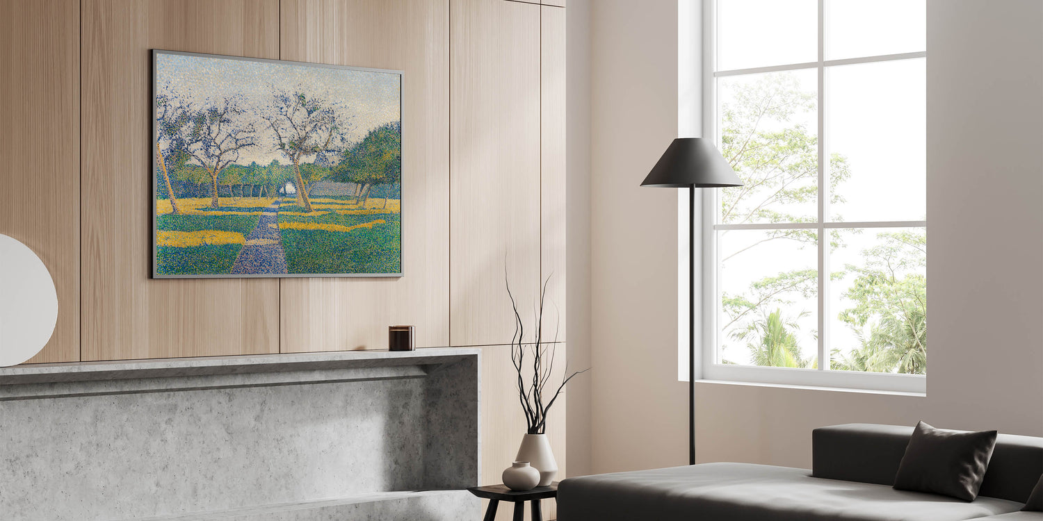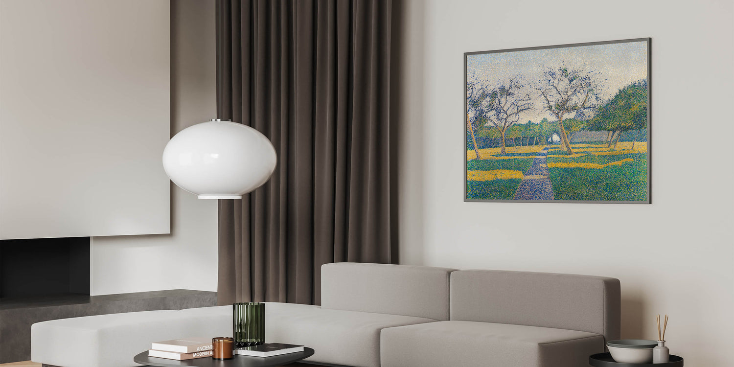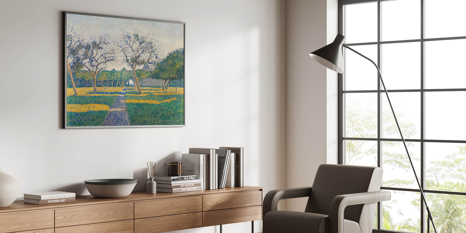 Add a touch of elegance and artistry to your space with Alfred William Finch’s "Orchard at La Louvière" (1890). This stunning pointillist masterpiece depicts a peaceful orchard bathed in sunlight, with meticulous dots of vibrant color creating a serene and textured landscape. Finch’s use of light and shadow showcases the beauty of nature in the Impressionist style.