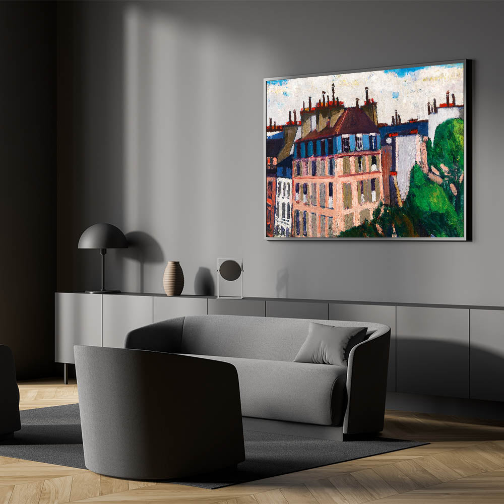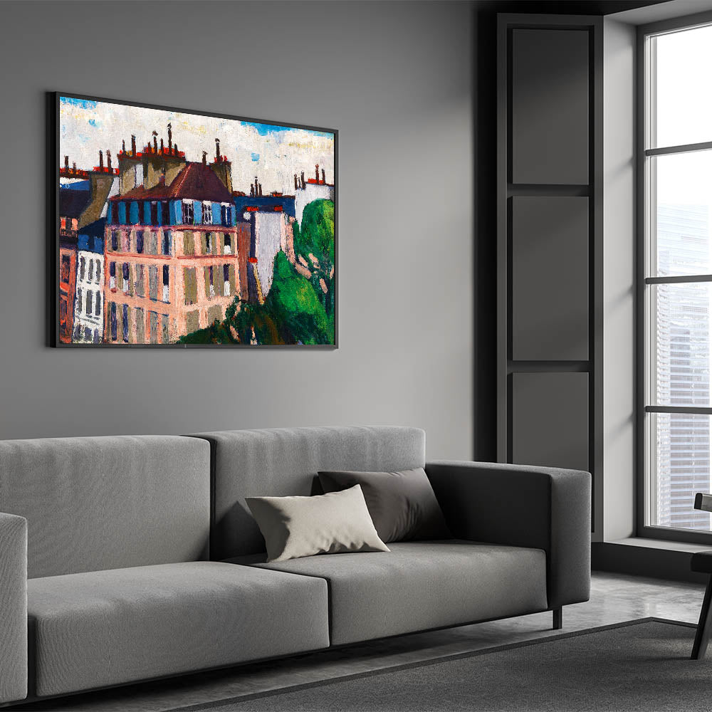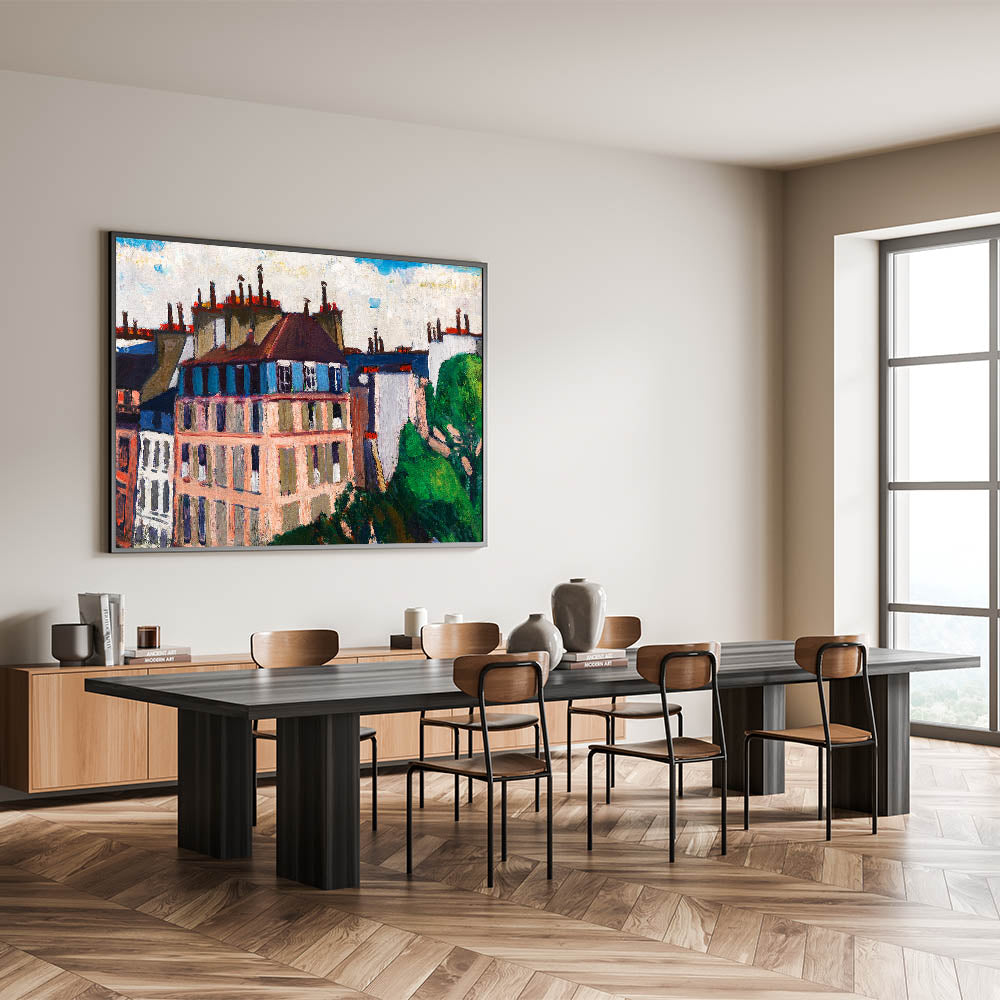 Capture the charm of Parisian architecture with "Rooftops, Paris," a vibrant piece of modern wall art by Henry Lyman Sayen. This stunning cityscape features a dynamic composition of colorful rooftops, lush greenery, and a crisp blue sky, creating an artwork that radiates energy and sophistication. Perfect for trendy home decor, it brings the allure of urban landscapes into your space.