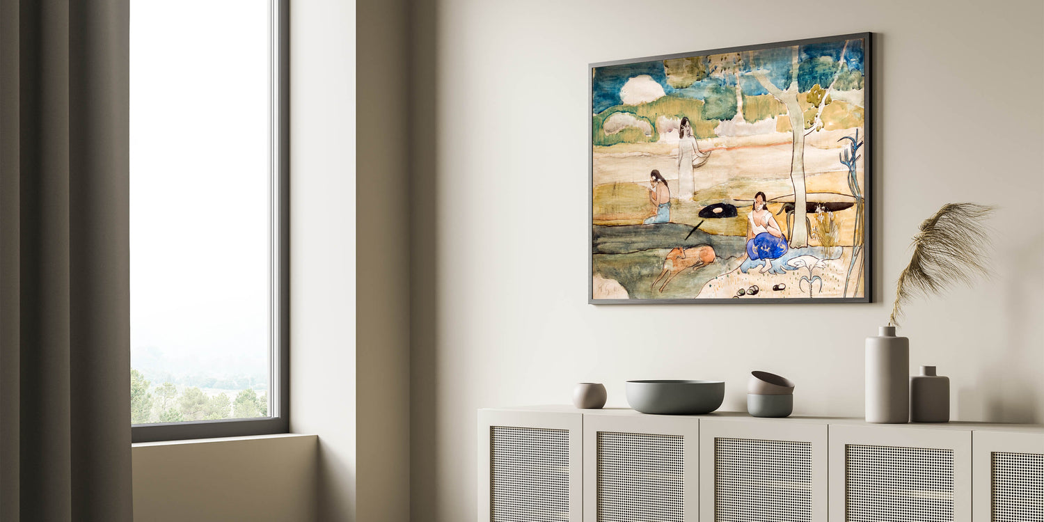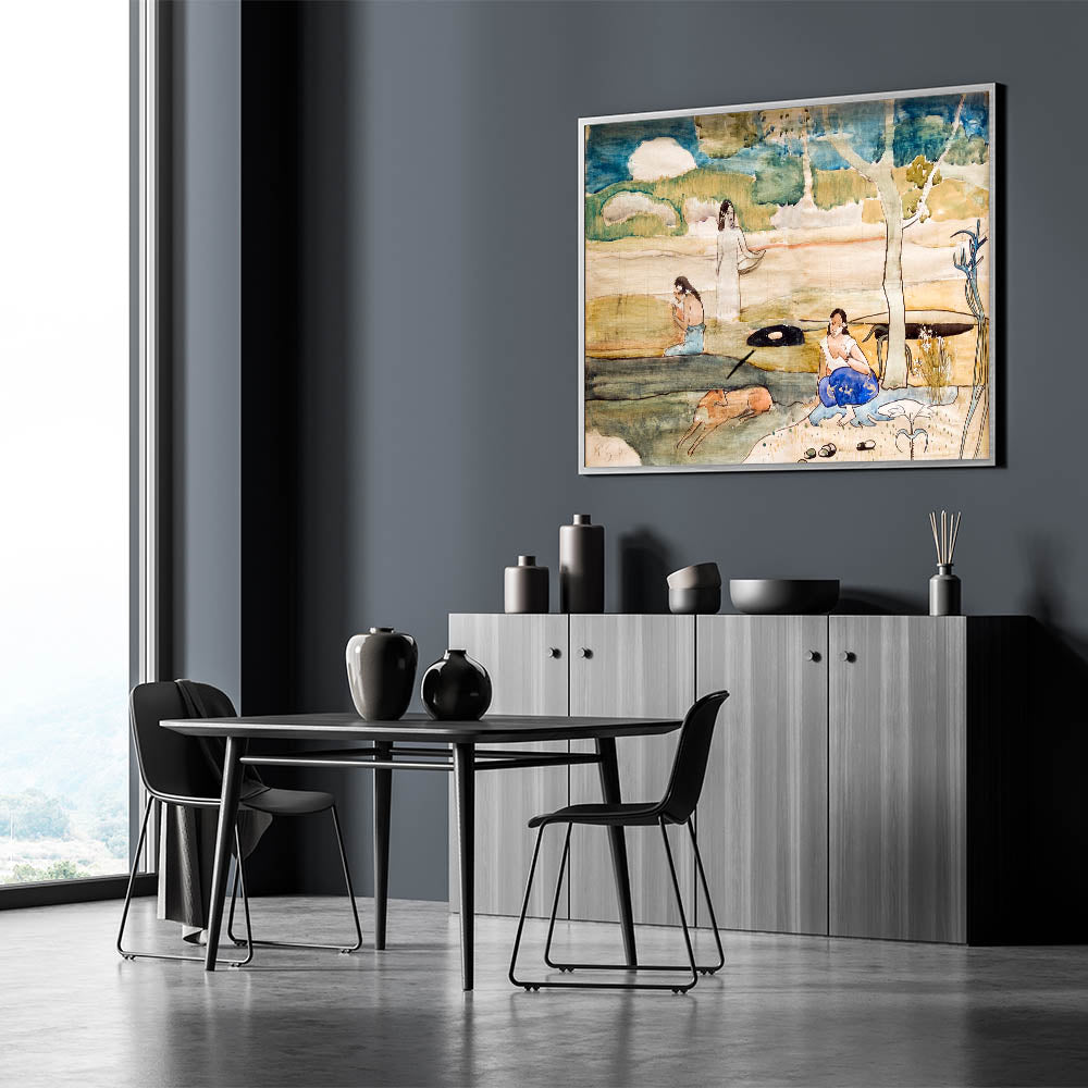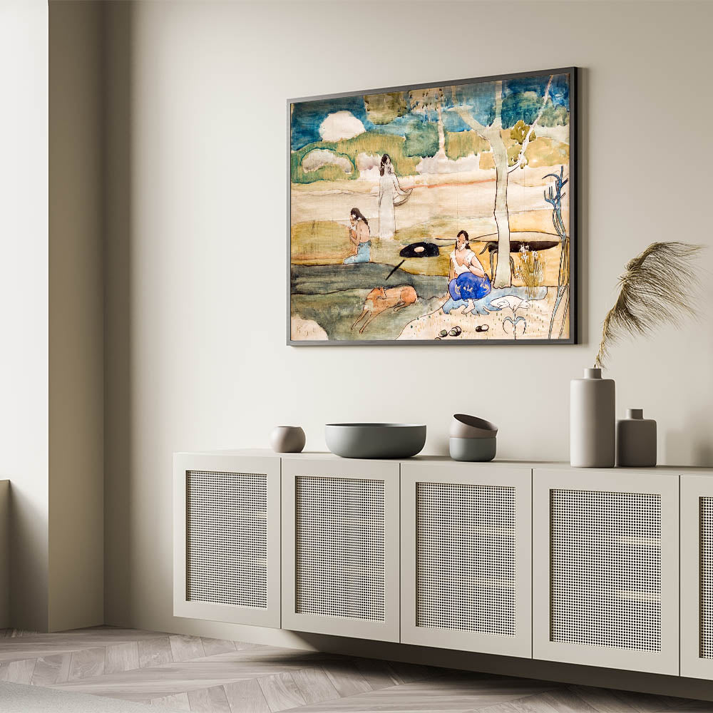 Transport yourself to the serene landscapes of the South Pacific with "Tahiti Study," a captivating piece of modern wall art by Paul Gauguin. This delicate watercolor captures the peaceful essence of life in Tahiti, featuring soft, flowing lines and a harmonious blend of natural tones. Perfect for trendy home decor, this artwork evokes tranquility and exotic charm, making it an ideal addition to your living space.