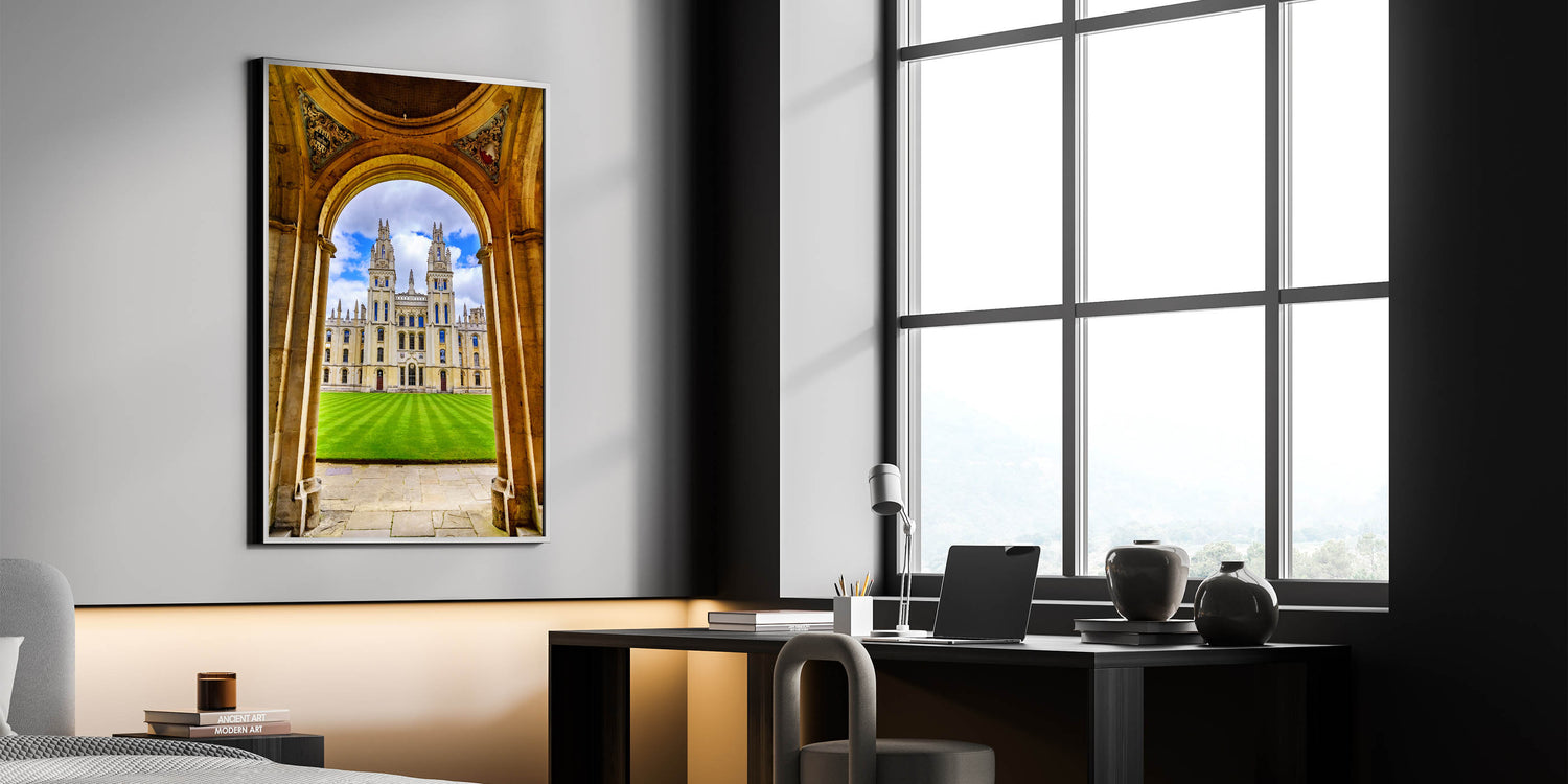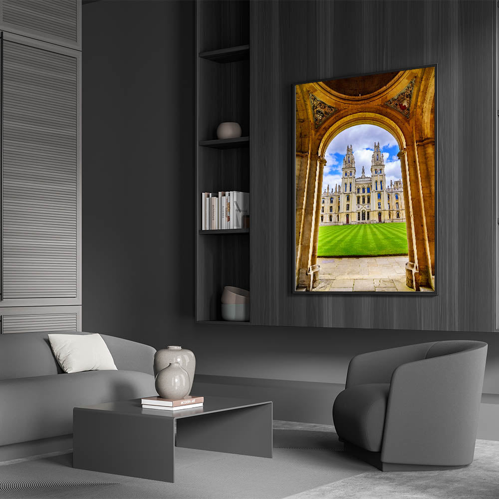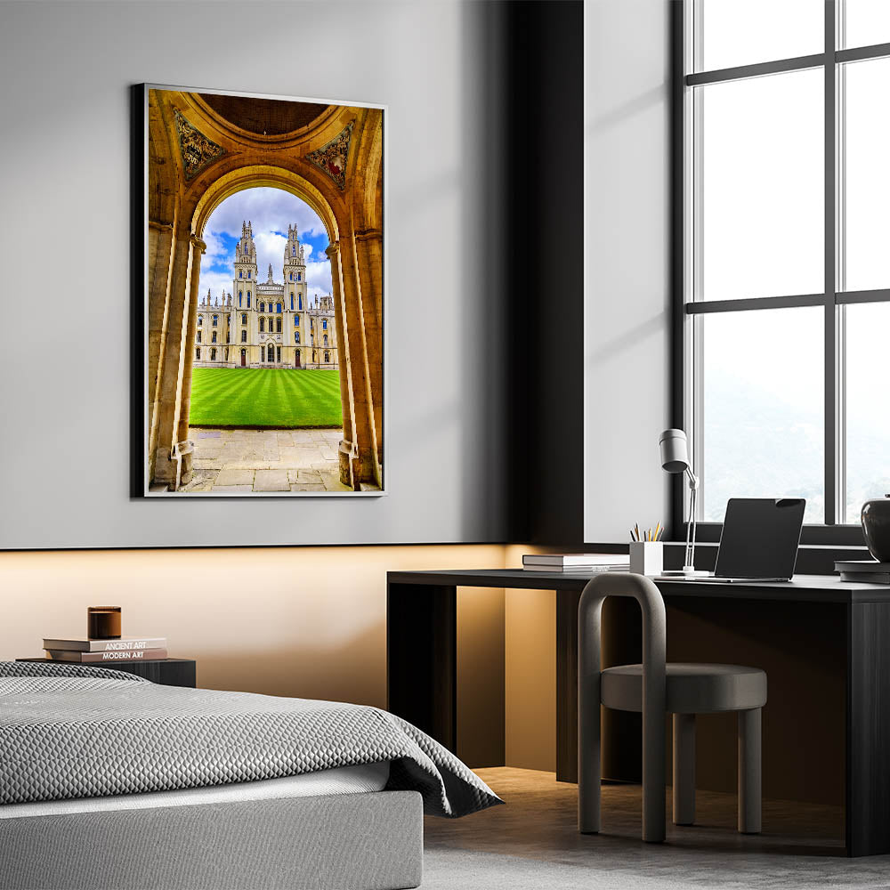 Capture the timeless beauty of Oxford with this stunning wall art, showcasing an iconic view of one of the city’s most renowned university landmarks. This striking piece, framed by an intricate archway, invites viewers to step into the heart of Oxford and admire its classic architecture set against a brilliant blue sky.