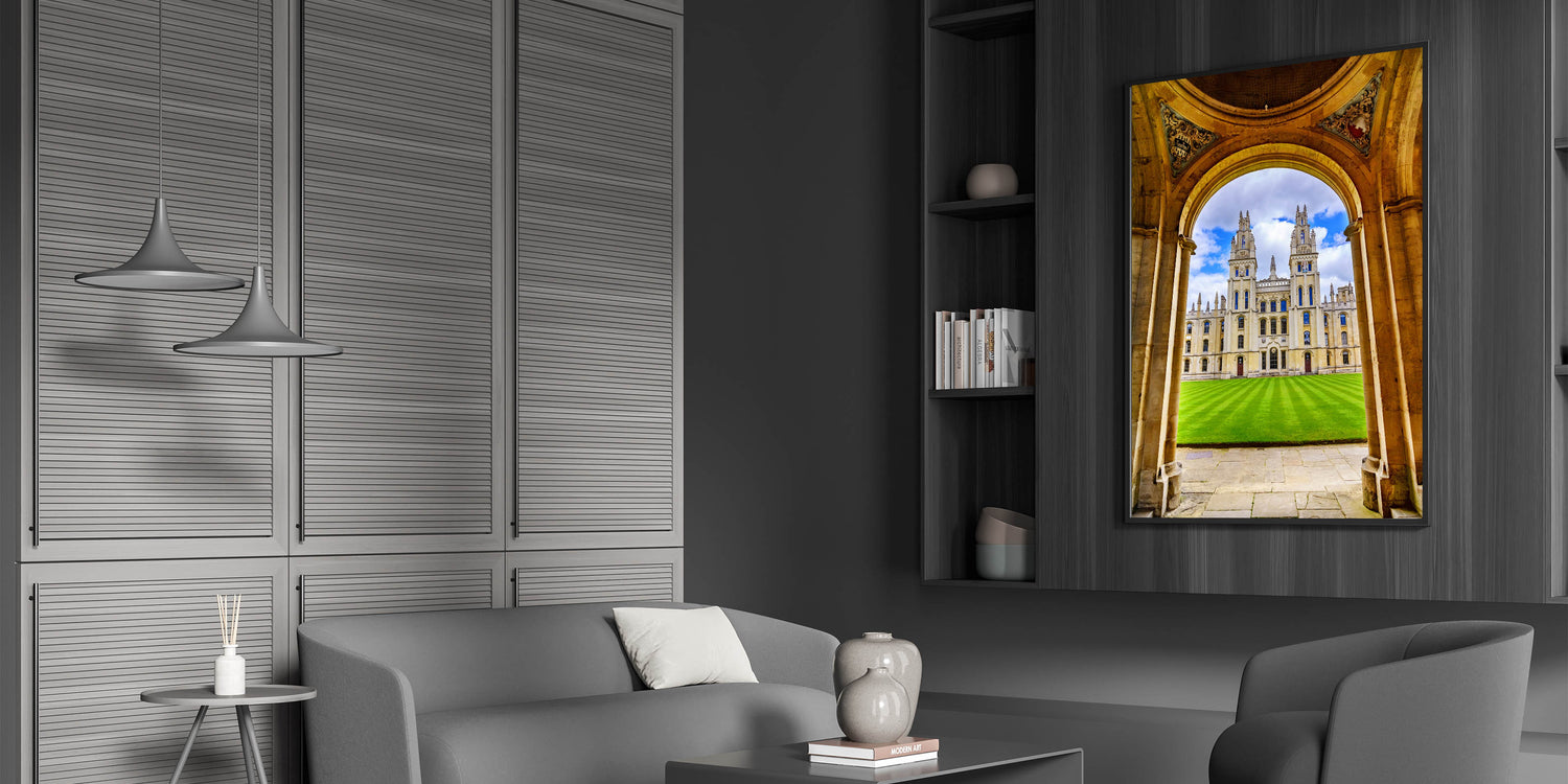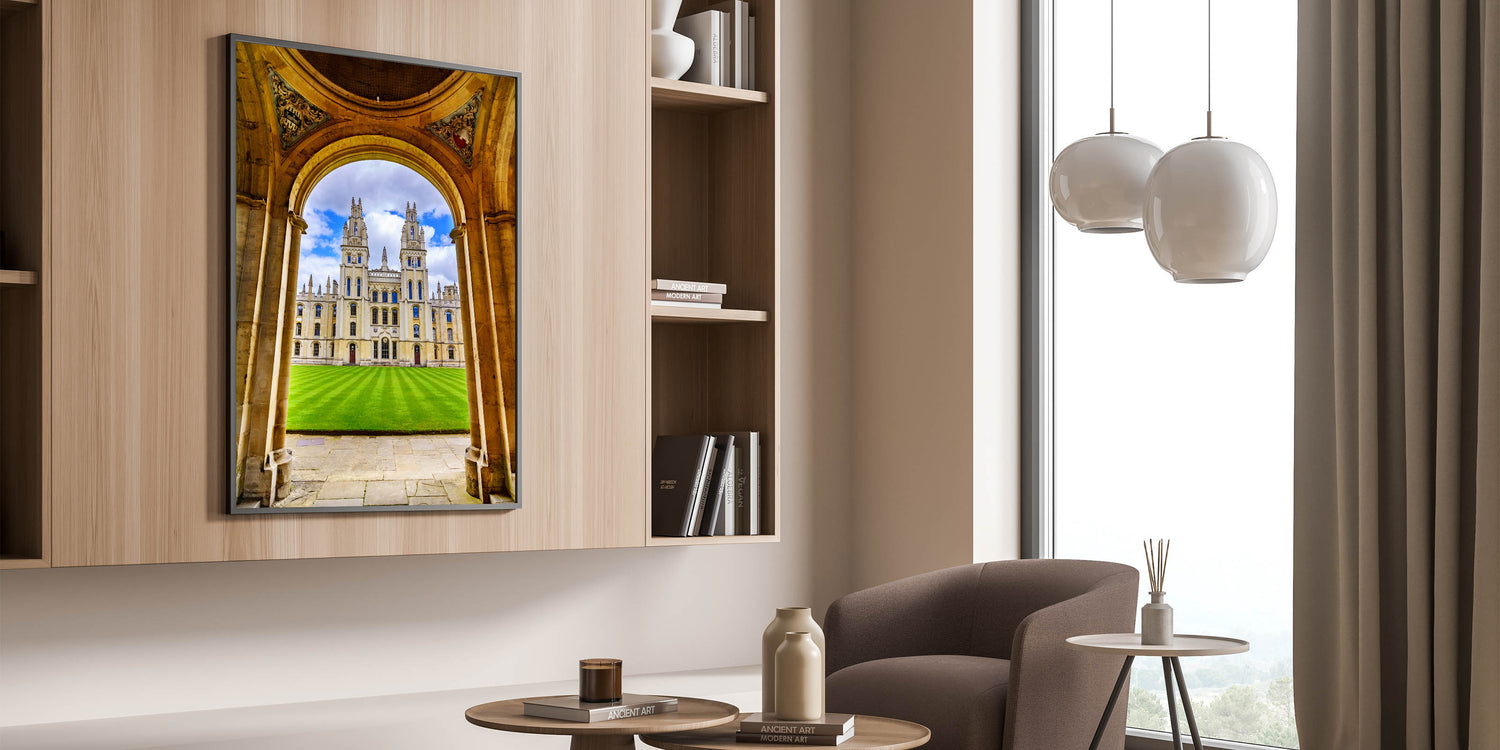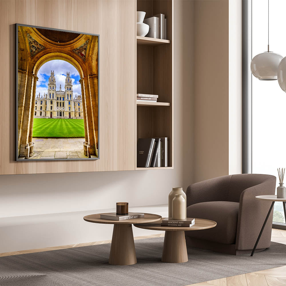 Capture the timeless beauty of Oxford with this stunning wall art, showcasing an iconic view of one of the city’s most renowned university landmarks. This striking piece, framed by an intricate archway, invites viewers to step into the heart of Oxford and admire its classic architecture set against a brilliant blue sky.