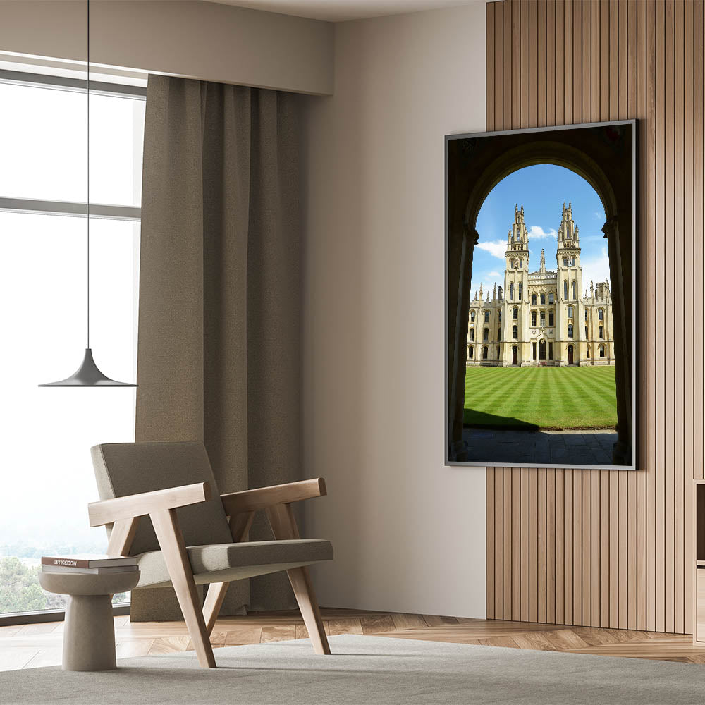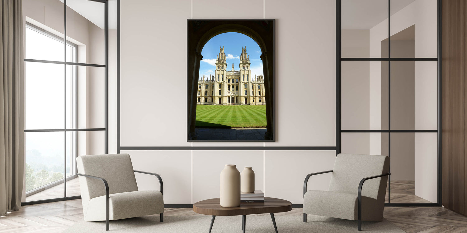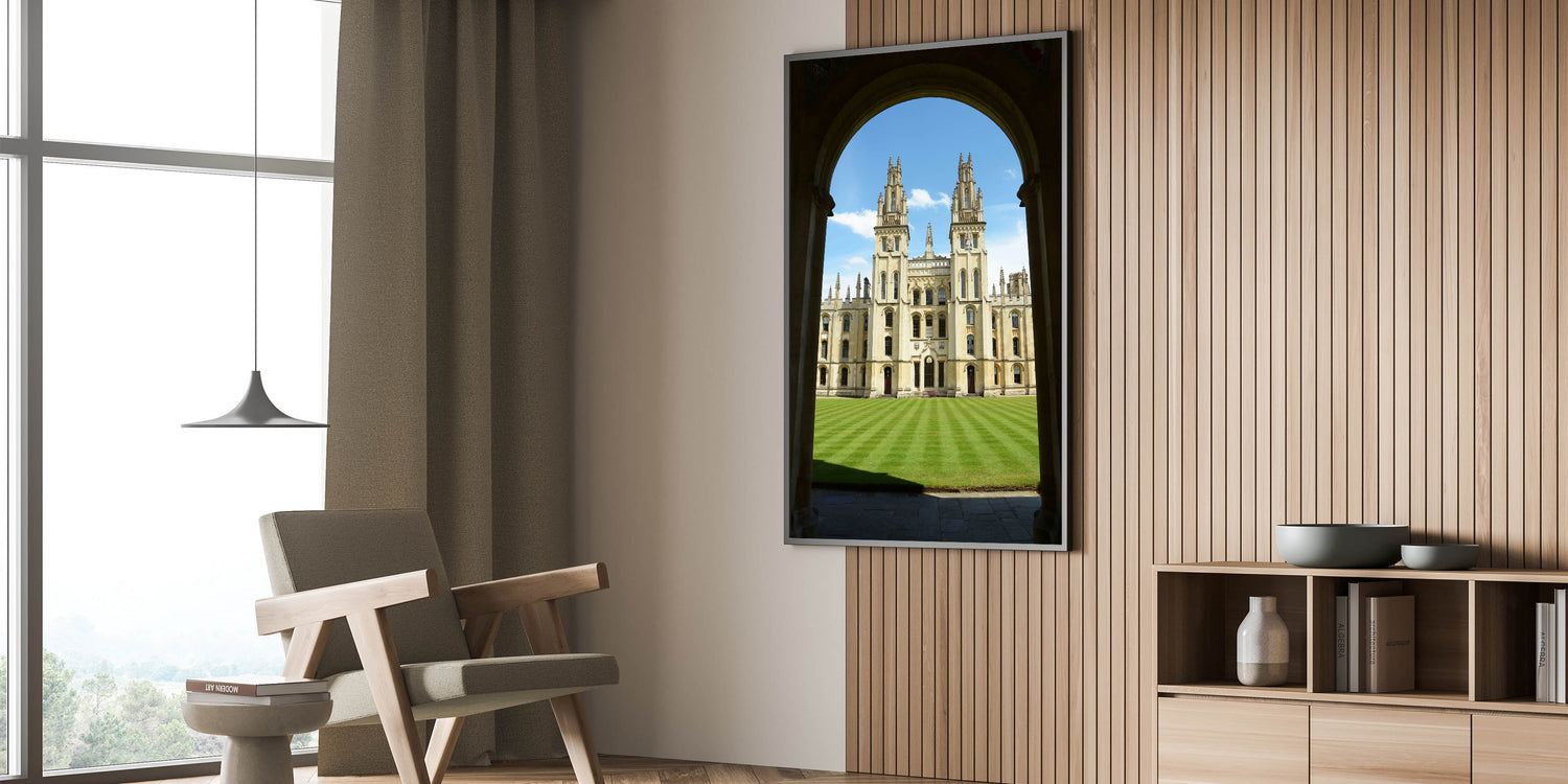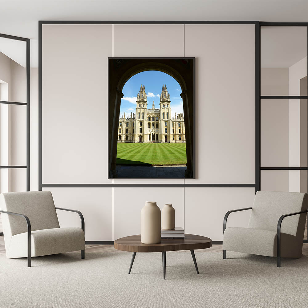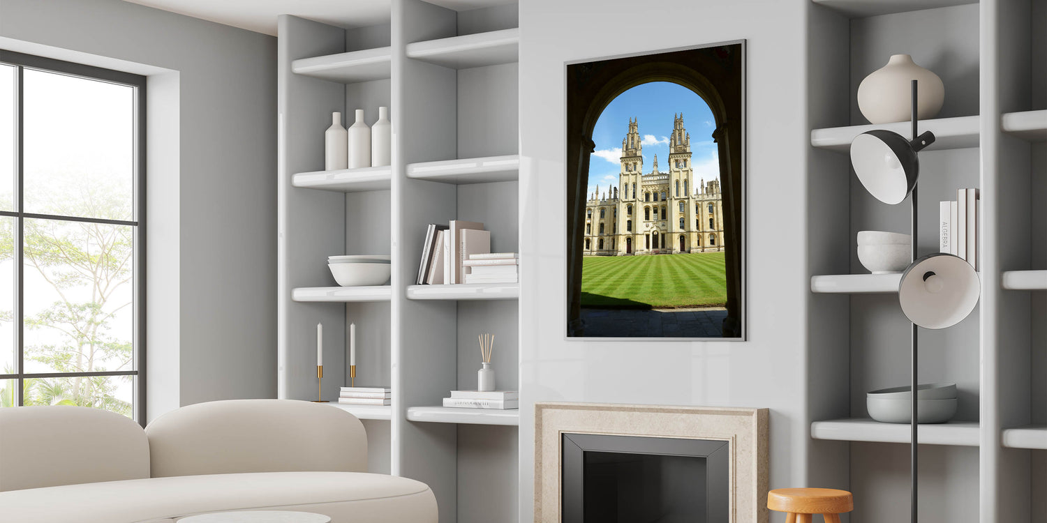 Bring a piece of historic Oxford into your home with this stunning wall art, featuring one of the city's most iconic university buildings. This breathtaking image captures the essence of Oxford’s majestic architecture framed by a graceful archway, highlighting the grandeur of the University of Oxford.