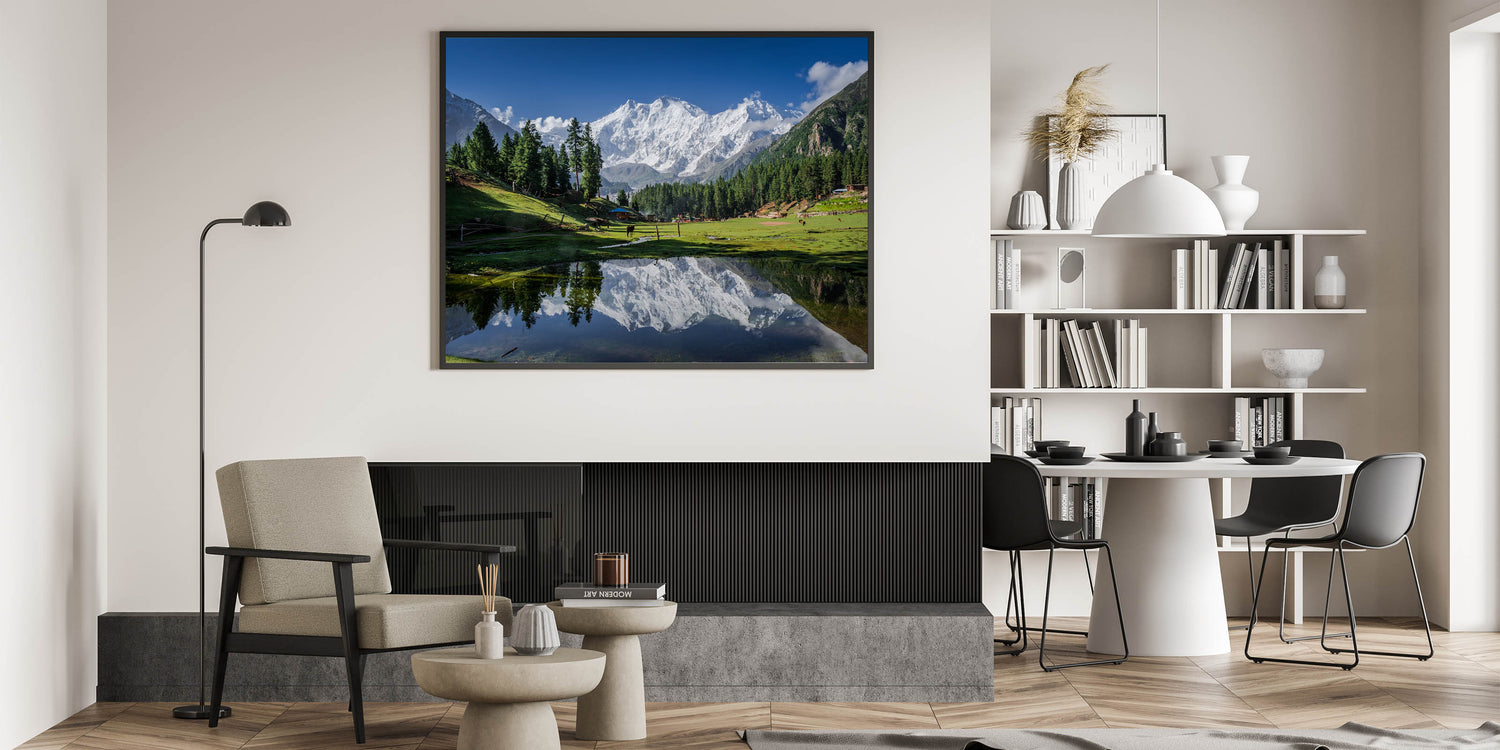 Immerse yourself in the serene beauty of Northern Pakistan with this stunning wall art of Nanga Parbat, one of the highest mountains in the world. The crystal-clear reflection of the snow-capped peak in the tranquil water below creates a breathtaking visual that captures the heart of Pakistan's natural wonders. This high-quality print is perfect for nature lovers and anyone looking to bring a sense of peace and grandeur into their living or workspace.