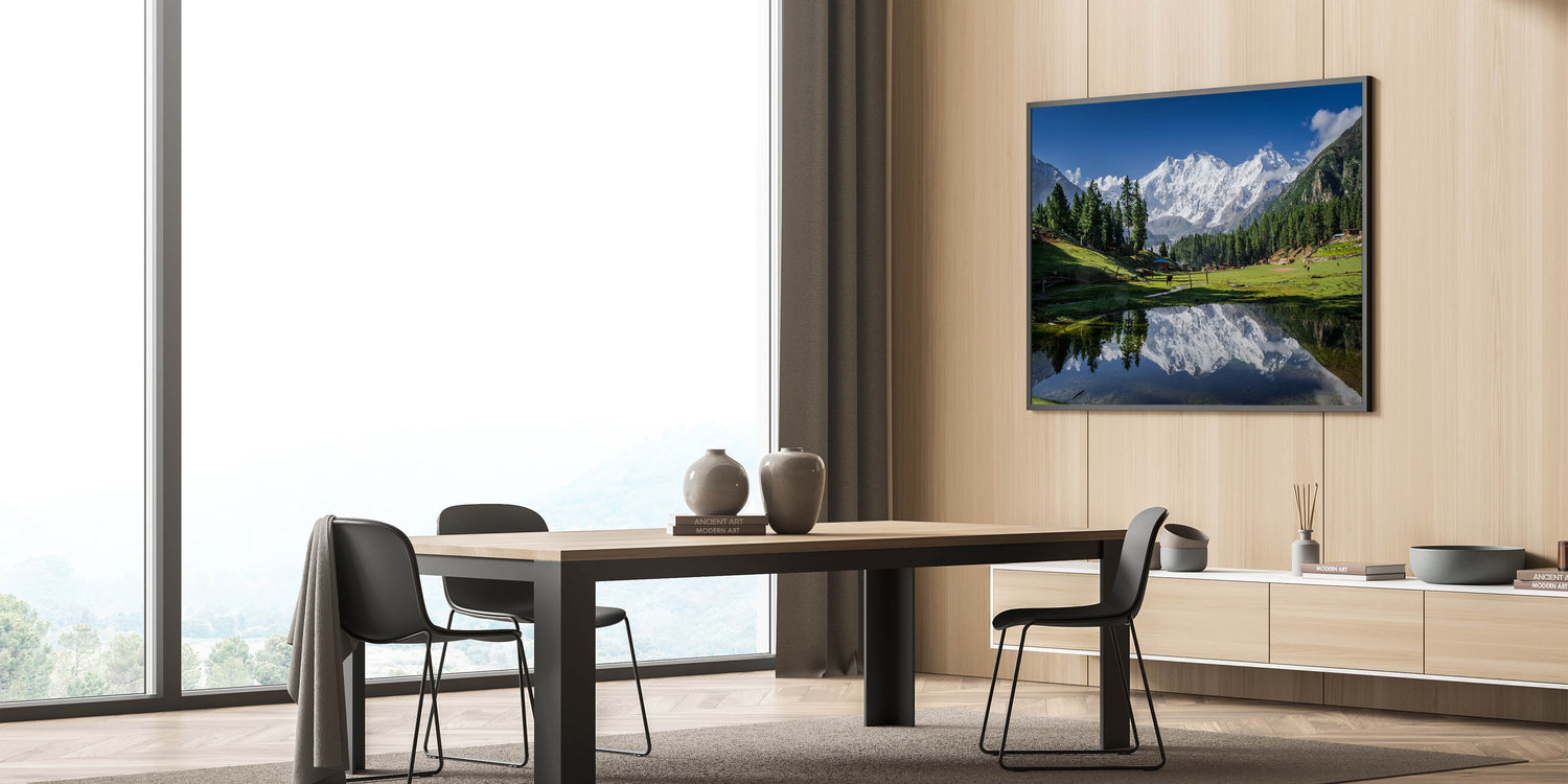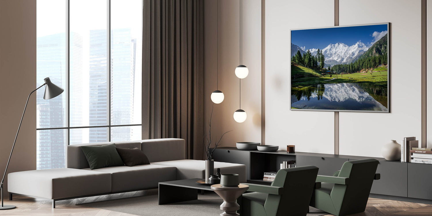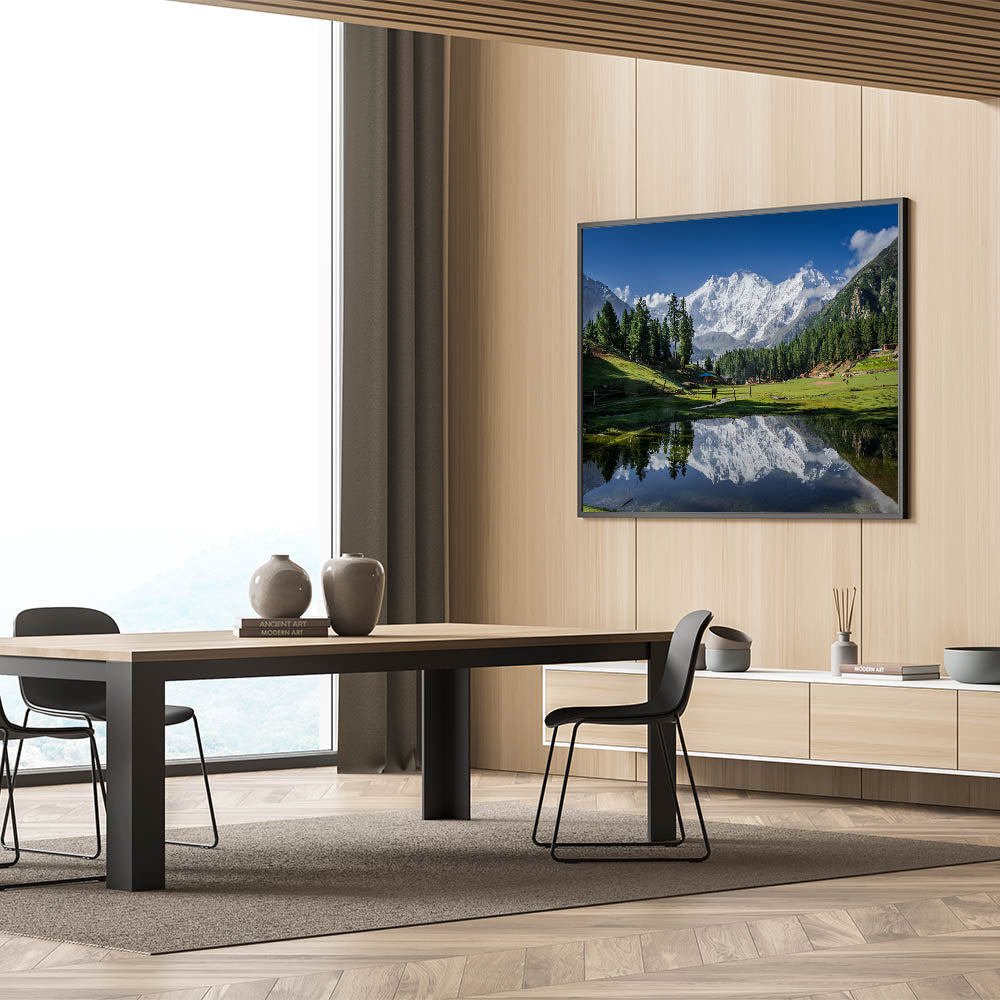 - High-Definition Print Quality: Meticulously detailed prints that beautifully capture the contrast between the green valley, majestic mountains, and serene reflection.