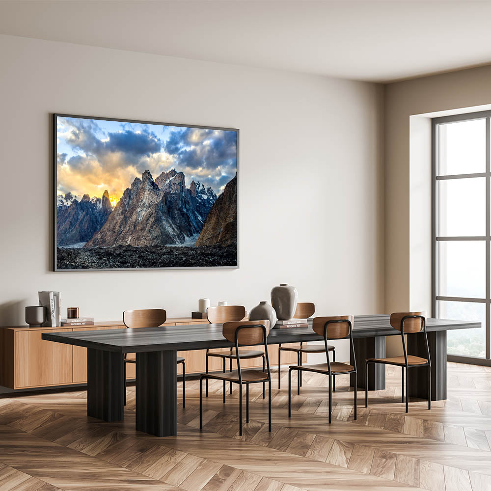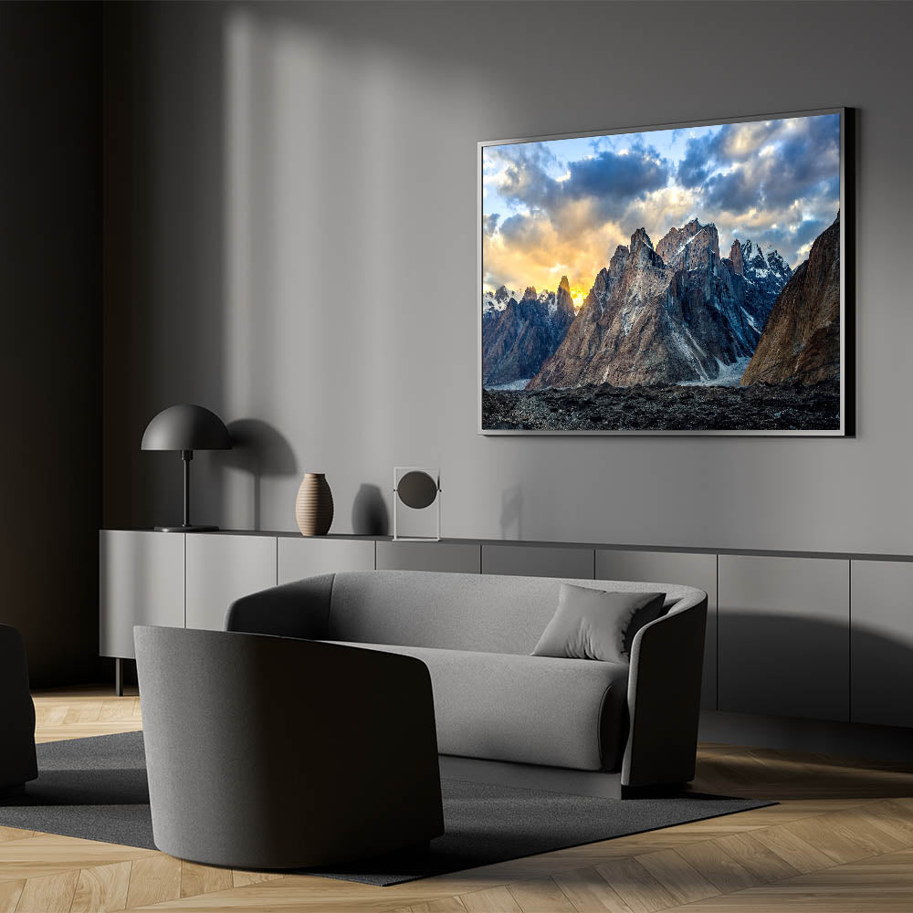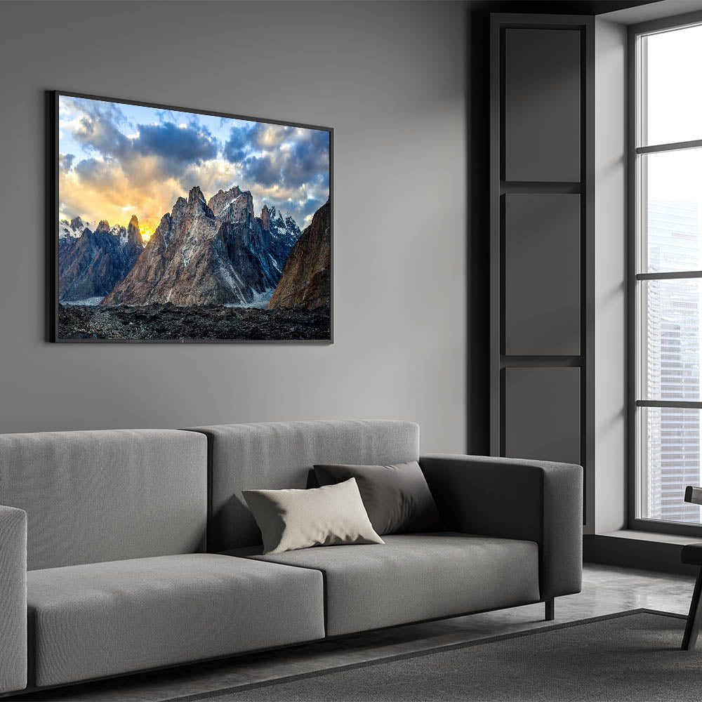 Witness the grandeur of the Karakoram peaks illuminated by the glow of a stunning sunset with this beautiful wall art. The jagged rock formations stand tall against the vibrant sky as the last rays of sunlight break through the mountains. This high-quality print captures the rugged beauty of Northern Pakistan’s mountain ranges, bringing a sense of adventure and natural wonder into your home or office.