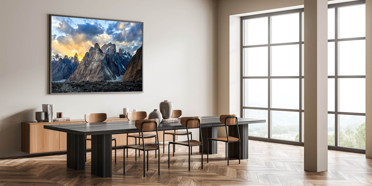 • Vivid Print Quality: The colors and details of the mountains and sky are vividly portrayed, creating a dynamic and immersive visual experience.