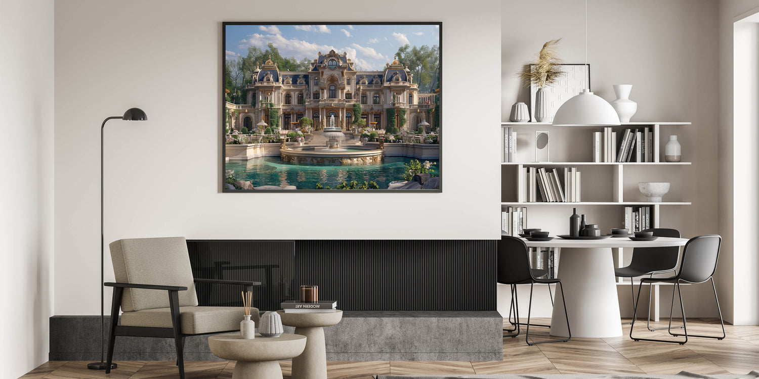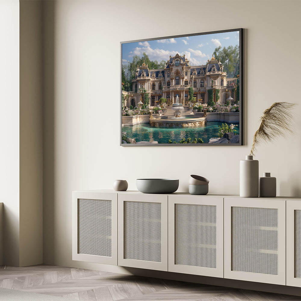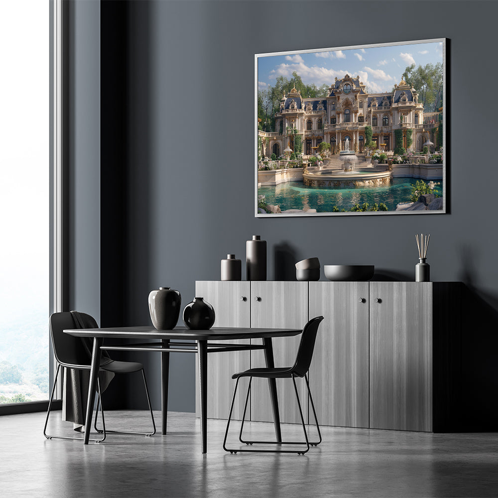 Enhance your home or office with this luxurious French chateau art print, perfect for creating a sophisticated and elegant atmosphere in any room.