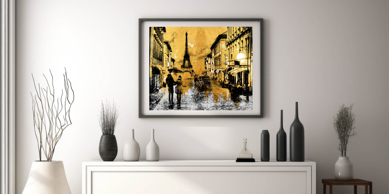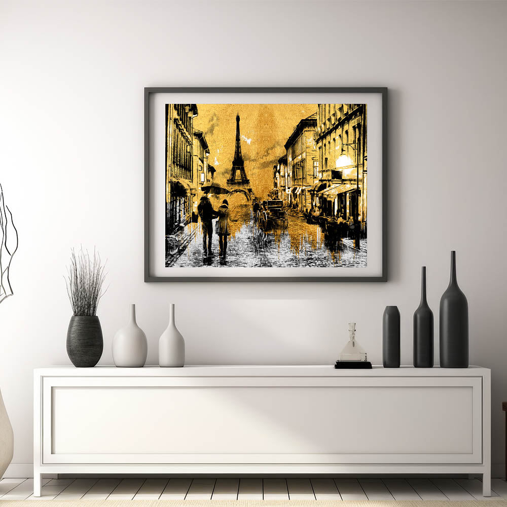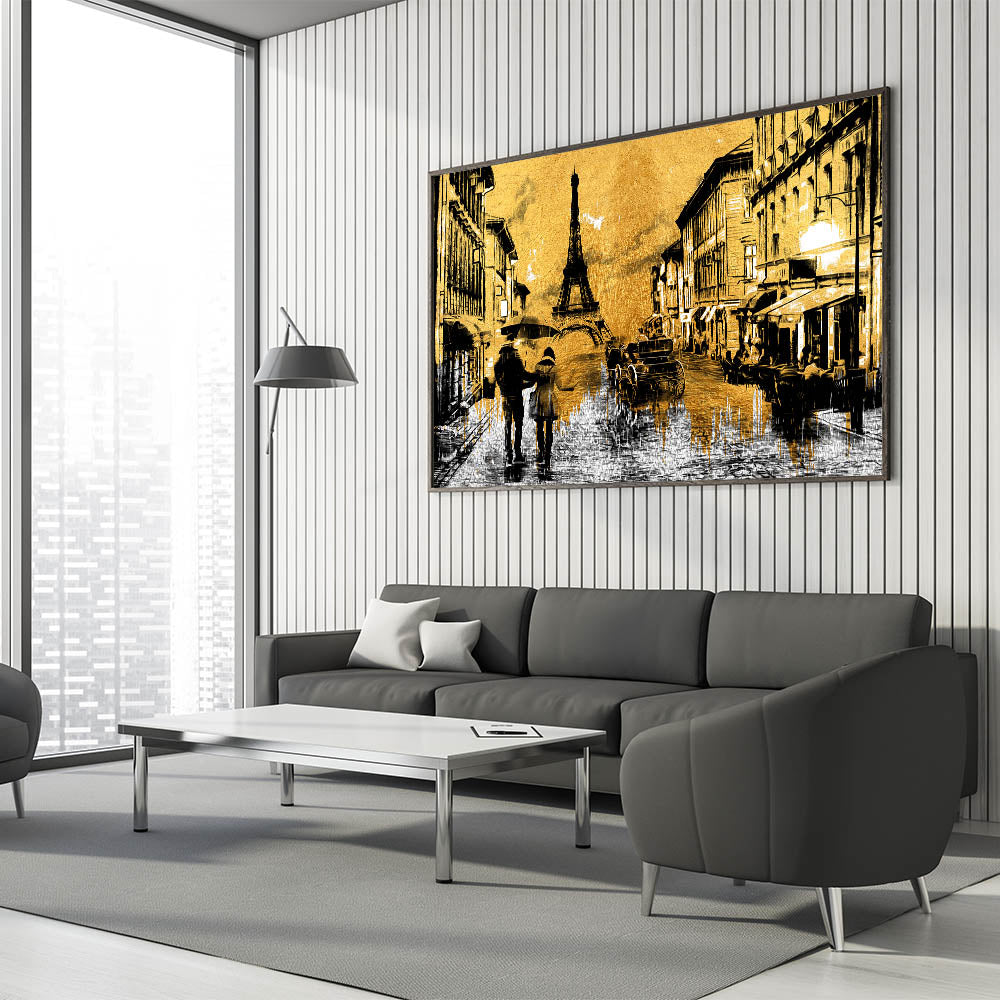 This captivating French wall decor captures a romantic Parisian street scene with the Eiffel Tower, masterfully rendered in striking gold and black tones. The texture and depth of the golden background create a luxurious feel, while the black elements bring contrast and drama to the scene. This high-quality Paris artwork is perfect for adding a bold statement piece to any room. Available in various formats, such as stretched canvas, framed canvas, and acrylic glass, this unique take on Parisian elegance is a timeless addition to your decor.