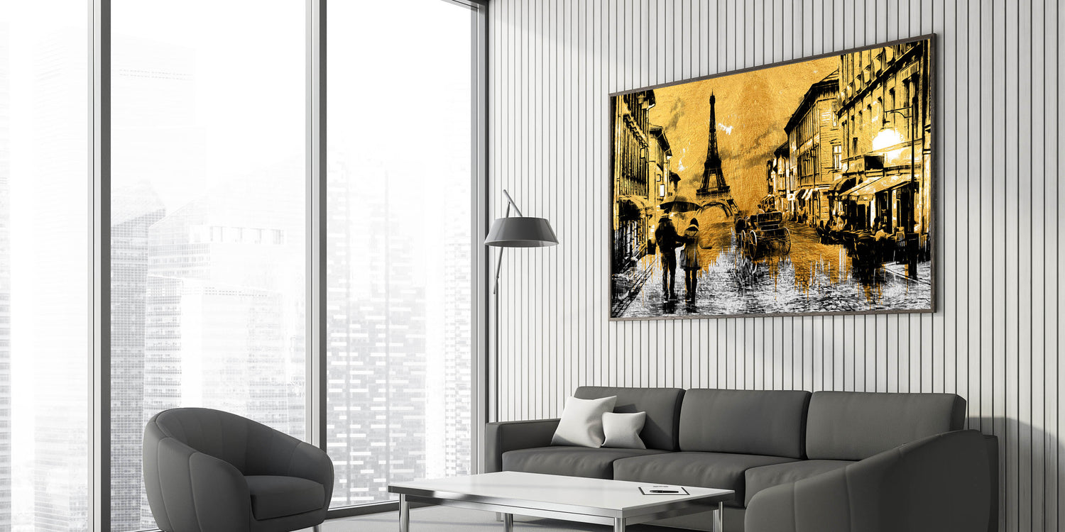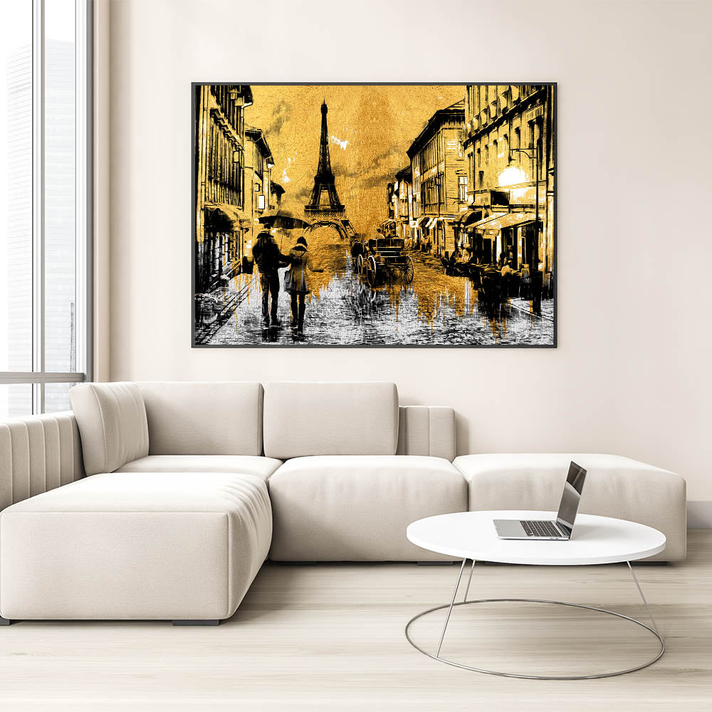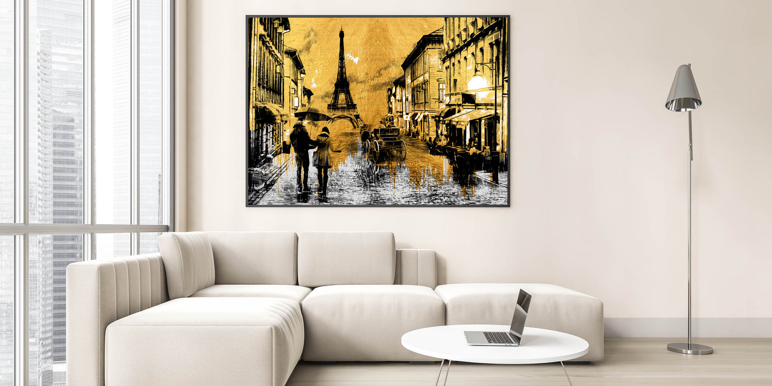 This captivating French wall decor captures a romantic Parisian street scene with the Eiffel Tower, masterfully rendered in striking gold and black tones. The texture and depth of the golden background create a luxurious feel, while the black elements bring contrast and drama to the scene. This high-quality Paris artwork is perfect for adding a bold statement piece to any room. Available in various formats, such as stretched canvas, framed canvas, and acrylic glass, this unique take on Parisian elegance is a timeless addition to your decor.