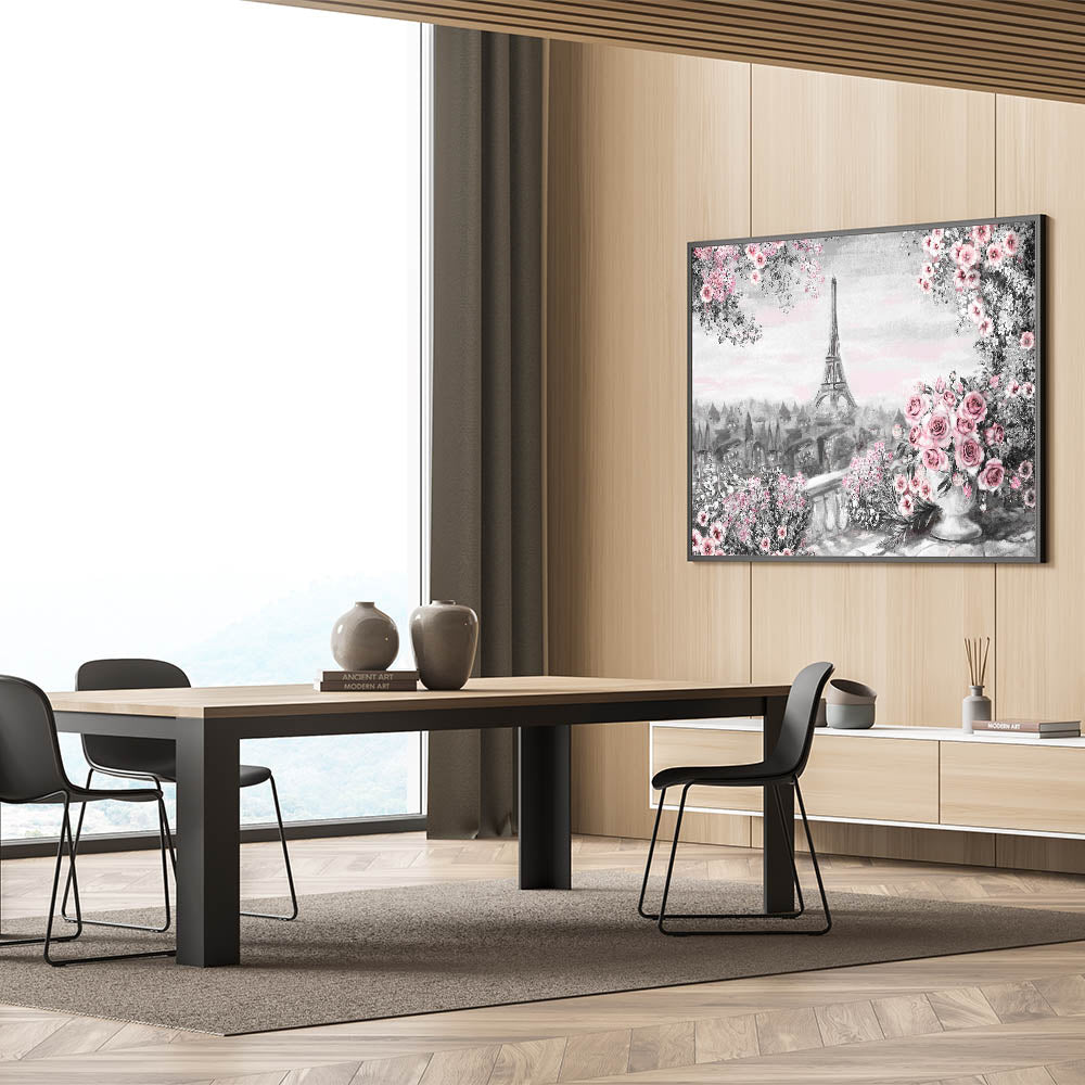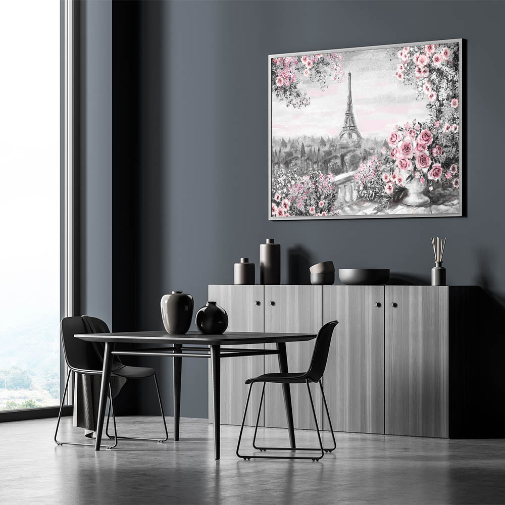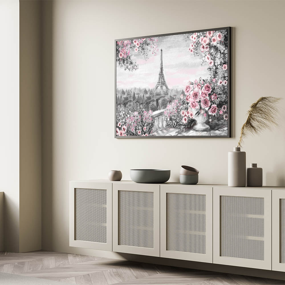 Enhance your space with this elegant Paris canvas print, showcasing a romantic Parisian cityscape framed by a beautiful rose-filled garden. The soft pink roses contrast against the grayscale background of Paris, highlighting the timeless charm of the Eiffel Tower art. This delicate combination of flowers and iconic scenery brings a feeling of tranquility and sophistication to any room.