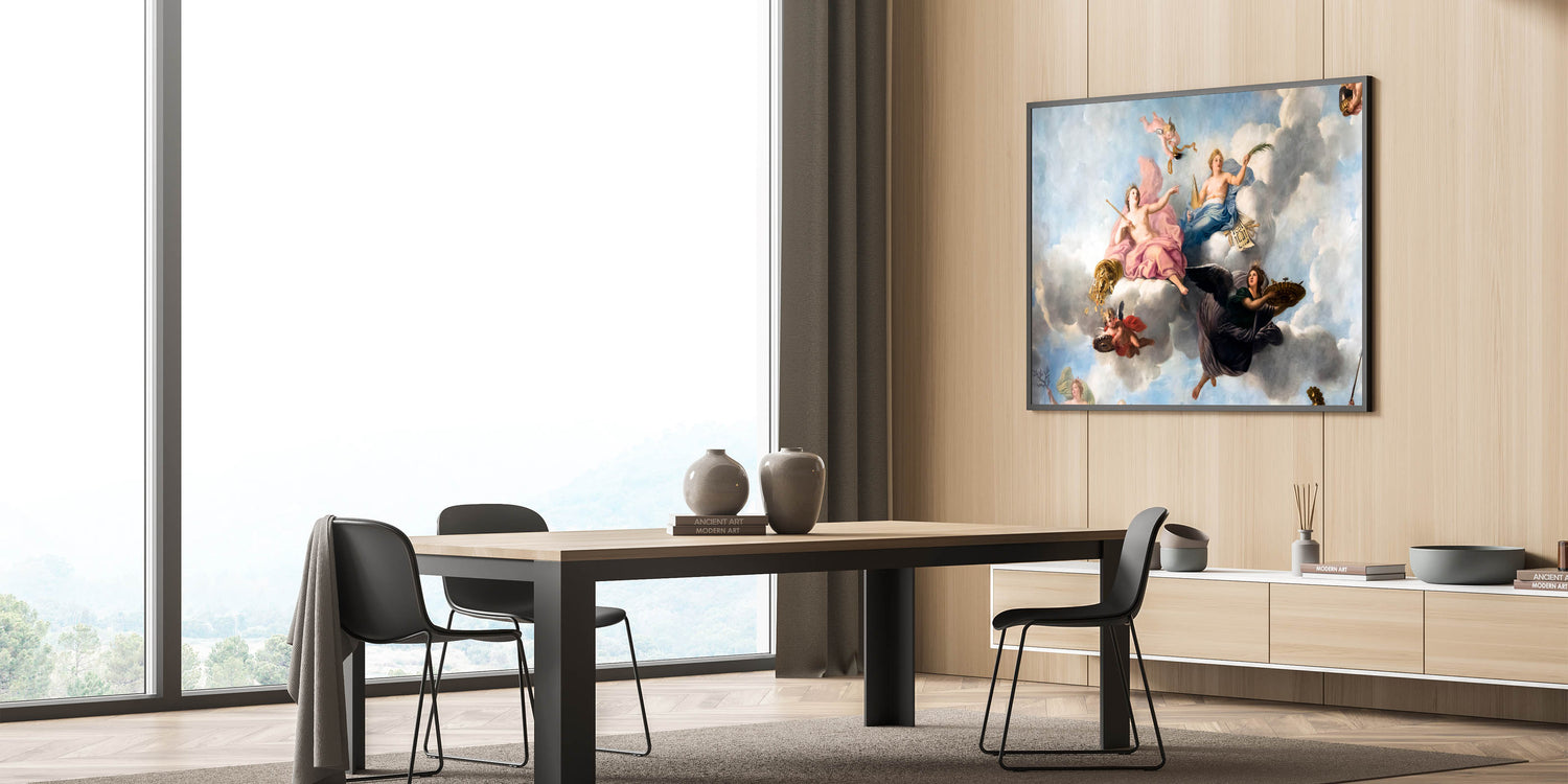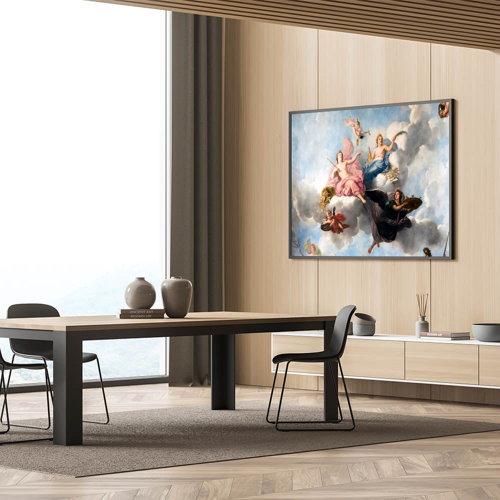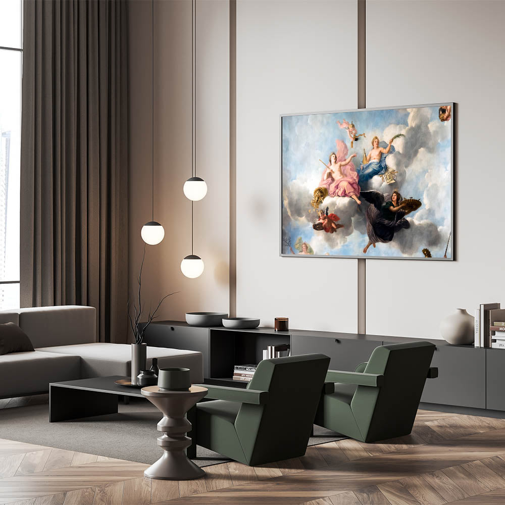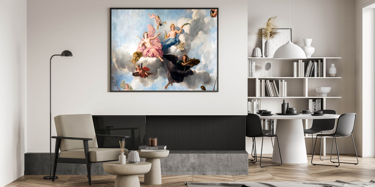 Enhance your space with this stunning French wall decor showcasing an exquisite Parisian Baroque ceiling painting. Featuring cherubs and soft pastel hues, this artwork captures the elegance and grandeur of historical French artistry. This piece is perfect for creating a romantic atmosphere in any room, and it brings a touch of Parisian charm into your home. Available as high-quality Paris canvas prints, framed canvas, and acrylic glass, this beautiful Paris artwork is a timeless addition to any decor.