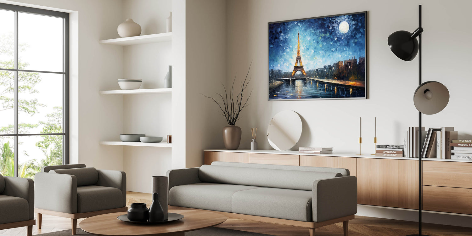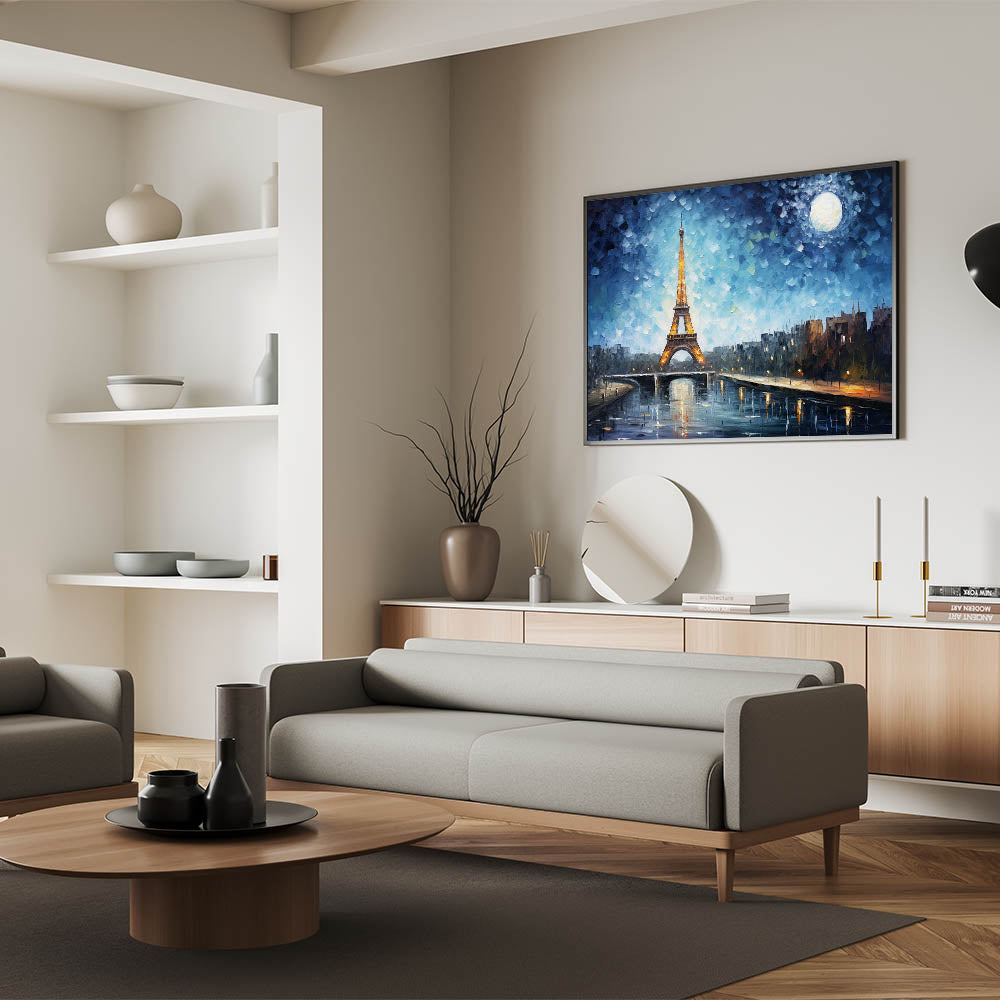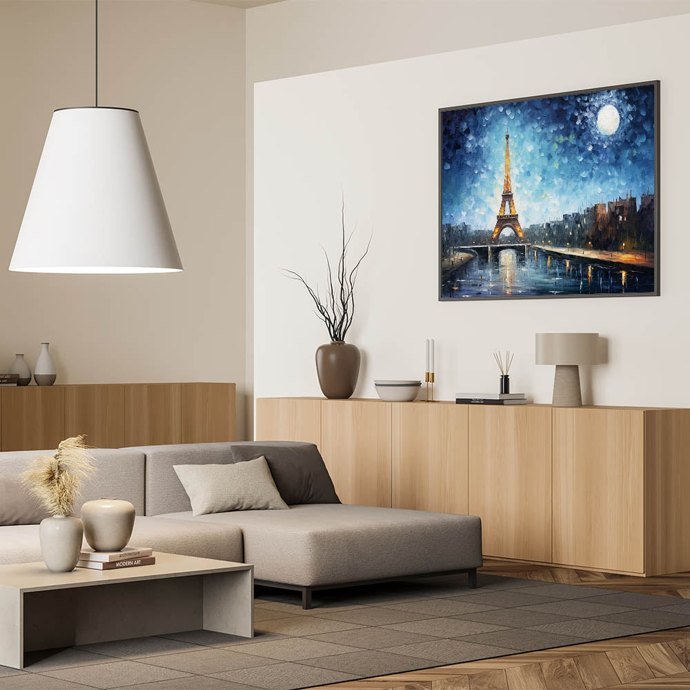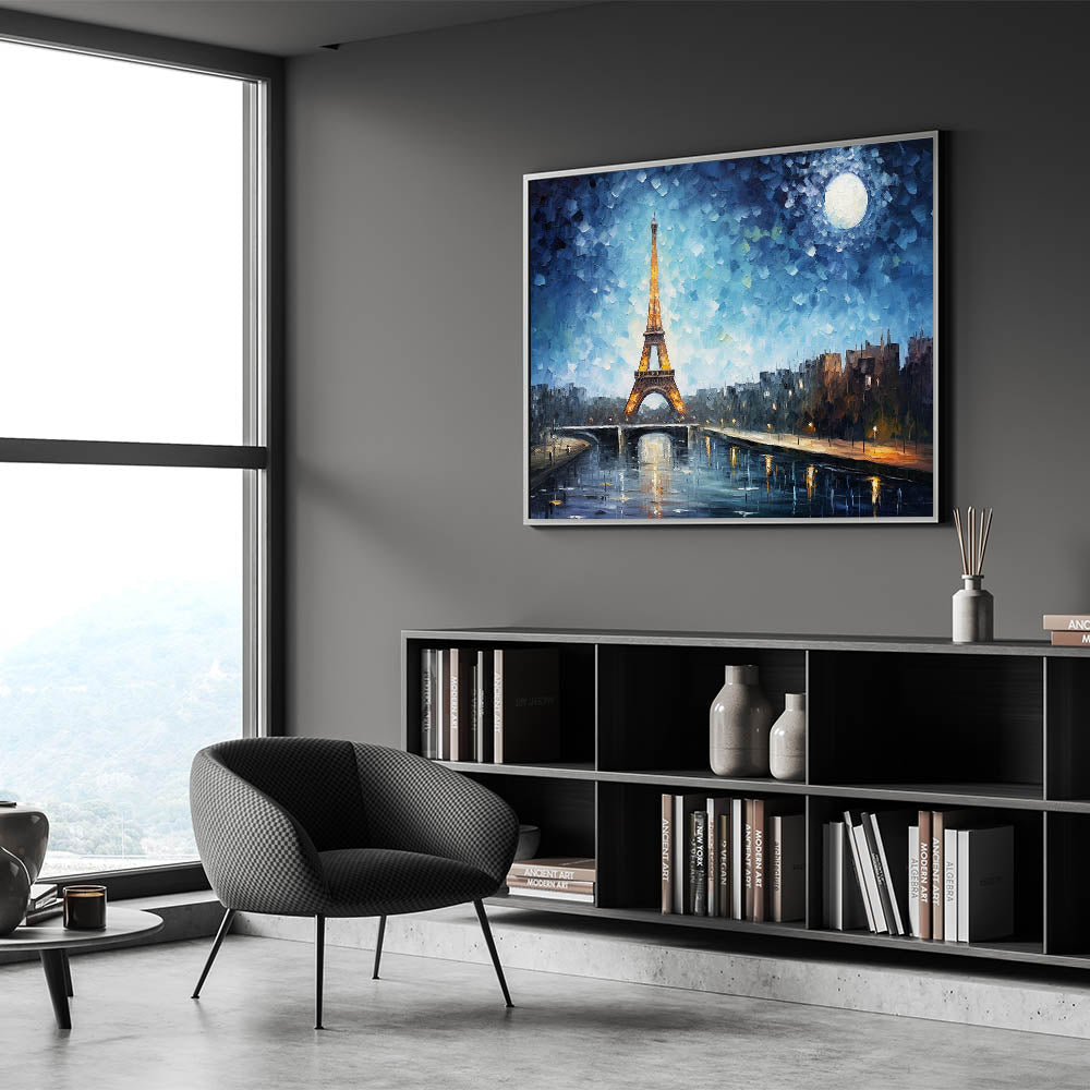 - Stunning Eiffel Tower art under a moonlit sky, ideal for adding a touch of magic to your space.