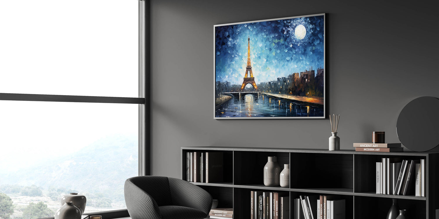 This beautiful Parisian cityscape painting is perfect for anyone seeking a touch of elegance and romance in their home. The deep colors and iconic imagery make it a striking addition to any space, transporting you to the moonlit streets of Paris with every glance.