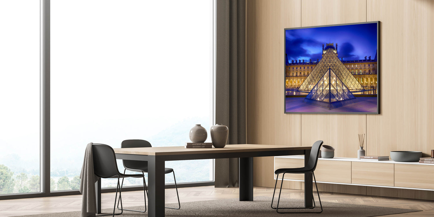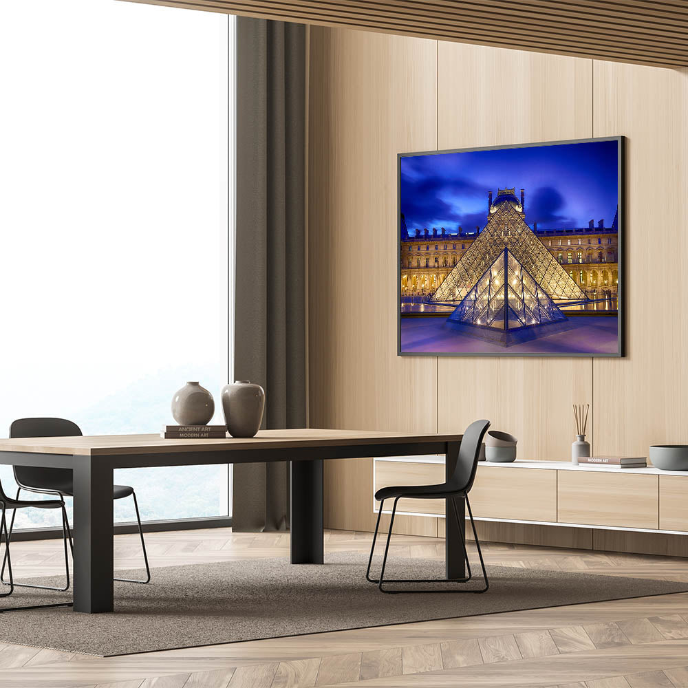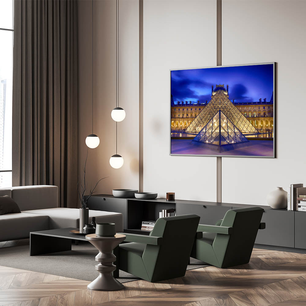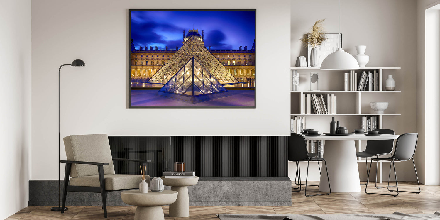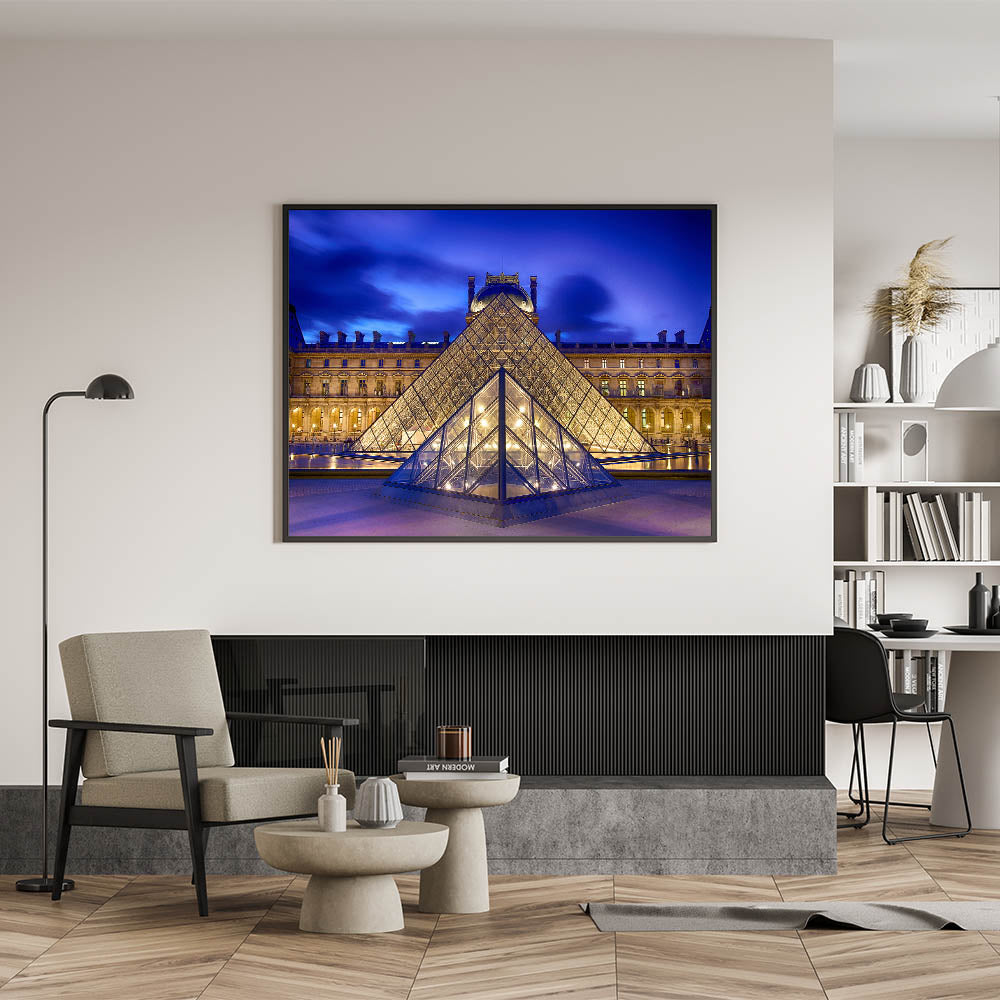 This beautiful Paris canvas print captures the iconic Louvre Pyramid at night, illuminated against a stunning deep blue sky. Perfect for adding a touch of elegance to any space, this artwork combines the modern architecture of the glass pyramid with the historic grandeur of the Louvre. The vibrant colors and sharp details make this high-quality Paris print an excellent addition to any home or office decor. Available in a variety of formats including framed canvas, acrylic glass, and stretched canvas, this artwork offers versatility and style.