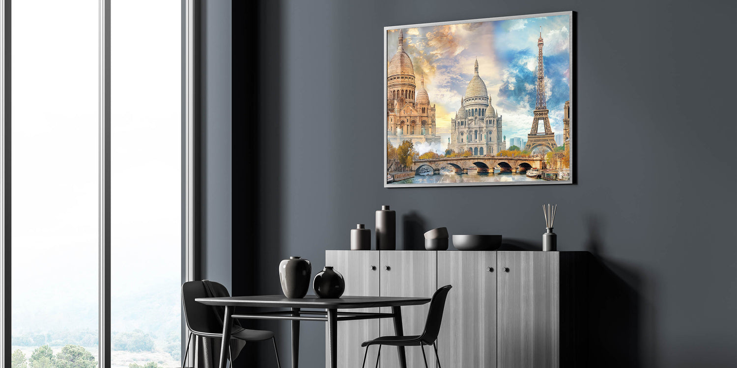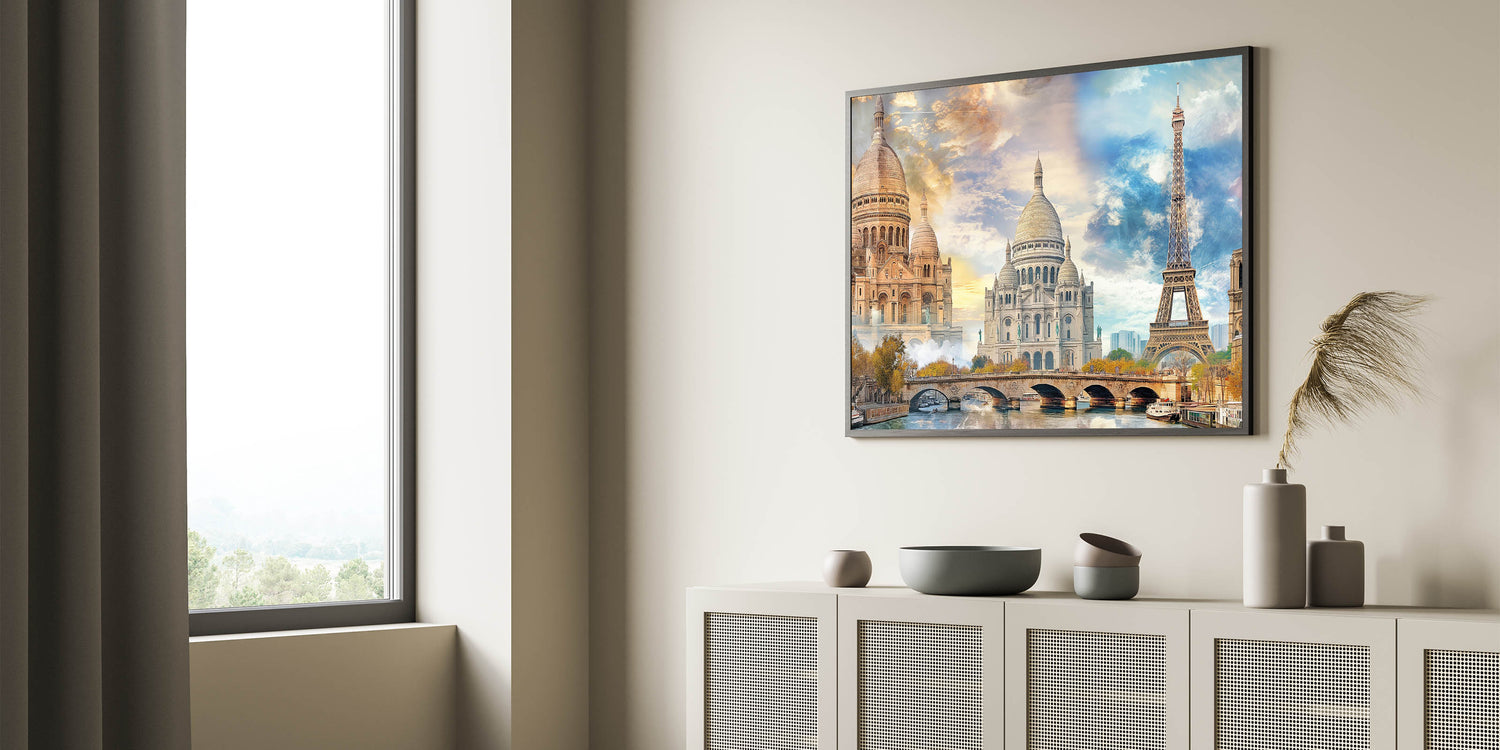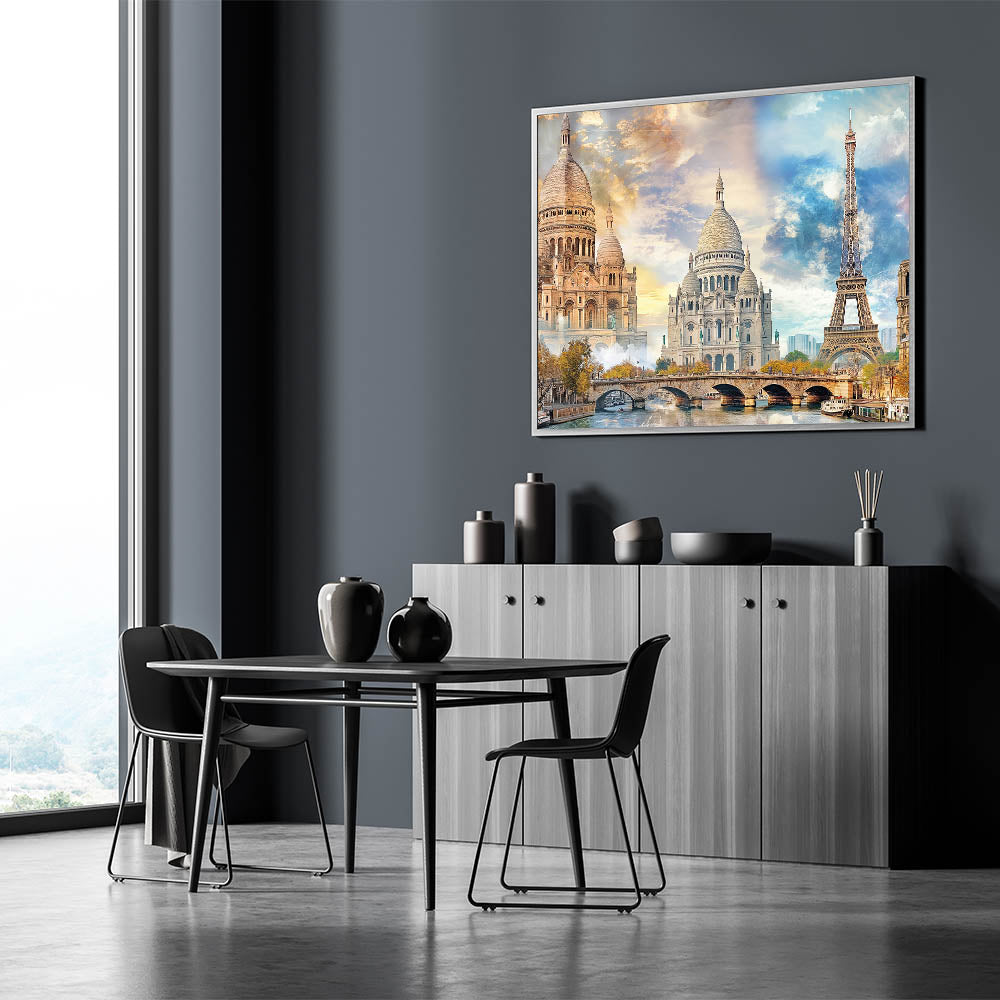Immerse yourself in the romance and beauty of Paris with this captivating artwork featuring the iconic Eiffel Tower and Sacré-Cœur. This beautiful Paris canvas print offers a stunning combination of Parisian architecture and scenic views, perfect for anyone who loves French wall decor. With soft pastel tones and detailed imagery, this high-quality Paris artwork will add a sophisticated touch to any room.