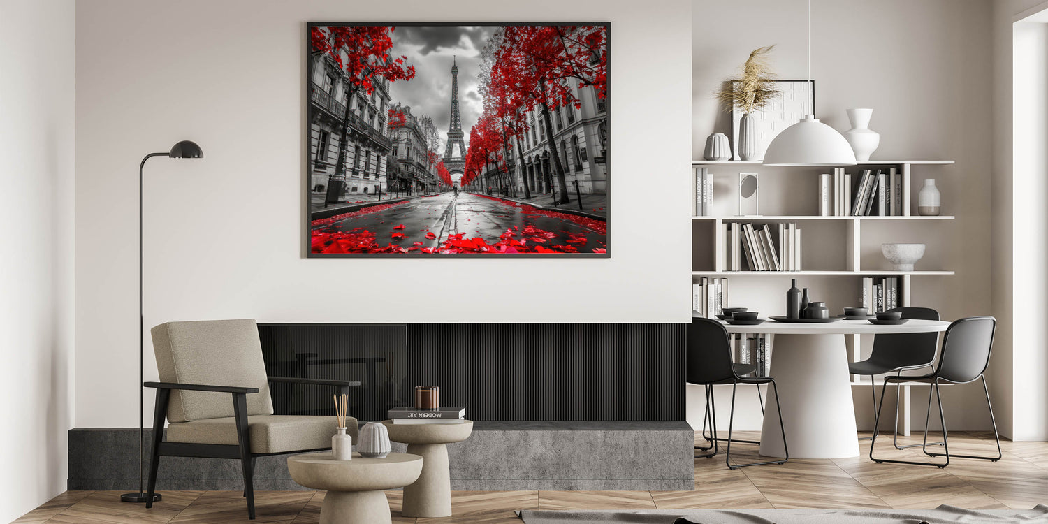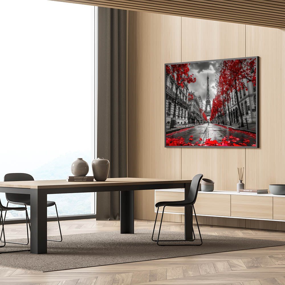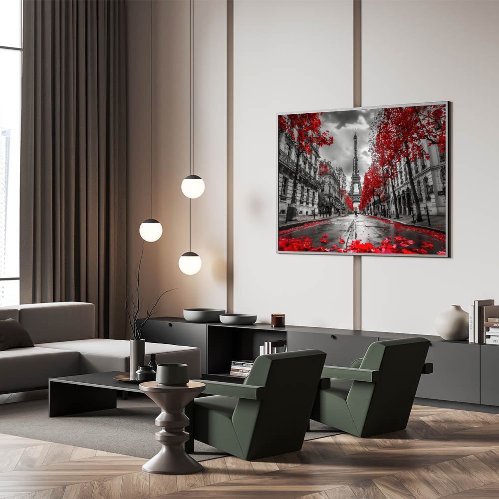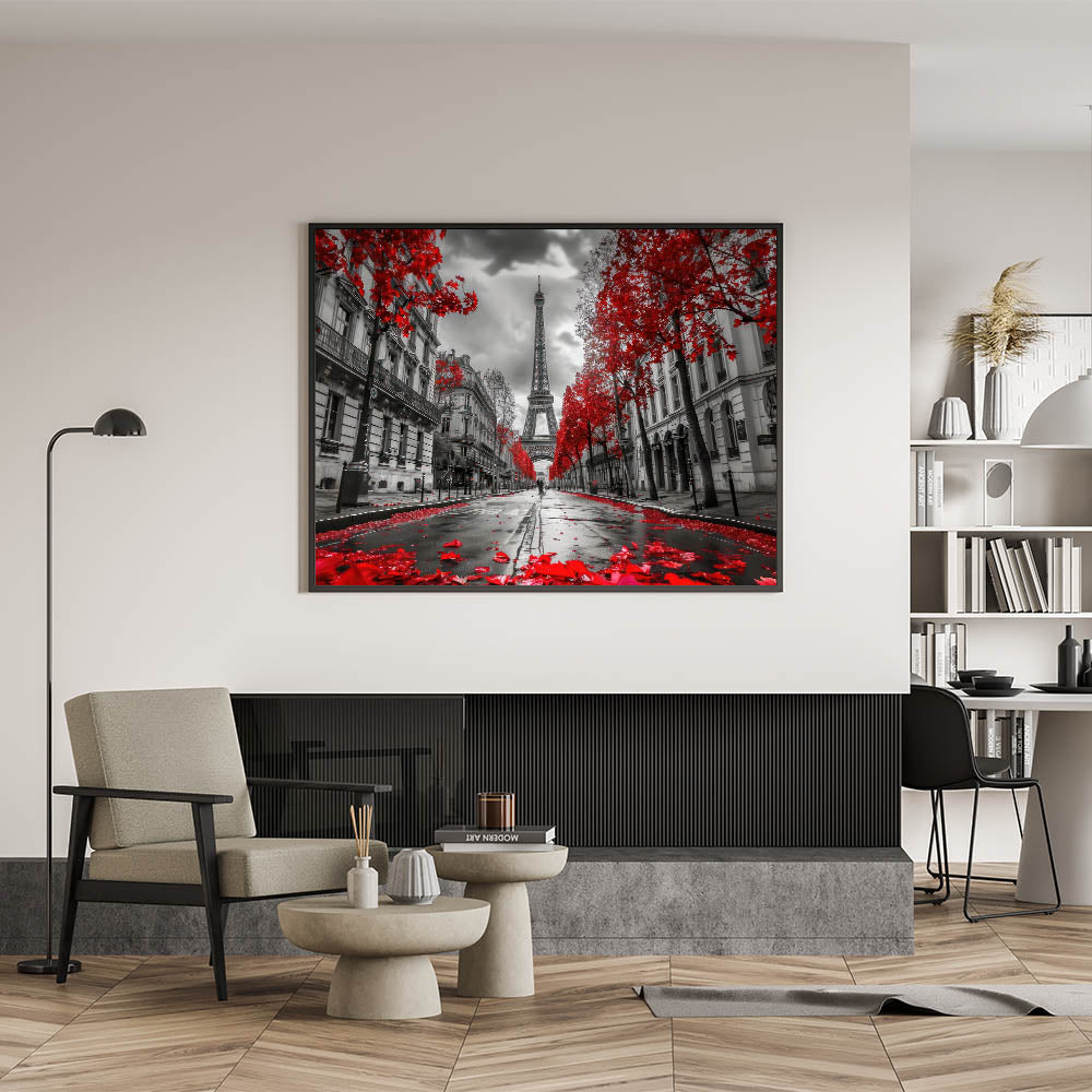 Add a touch of romance to your space with this striking Eiffel Tower art. Capturing the iconic Parisian street lined with red trees and set against a dramatic gray sky, this beautiful Paris artwork embodies the elegance and allure of the French capital. Perfect for anyone looking to elevate their decor, this high-quality Paris print will transform any room into a romantic Parisian escape.