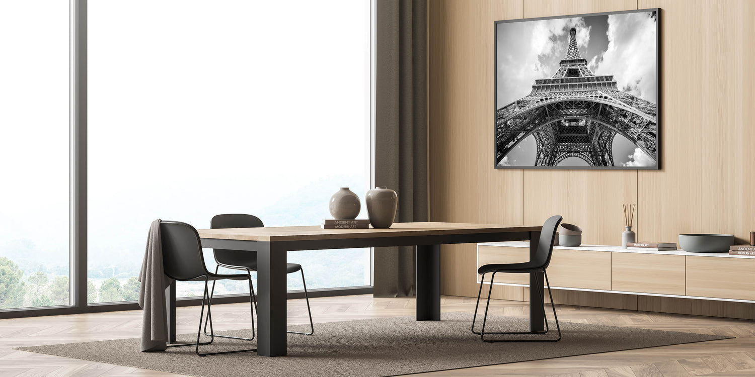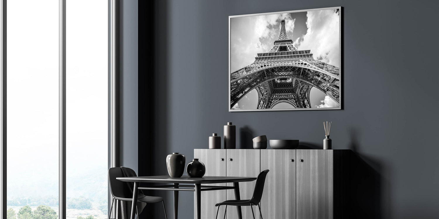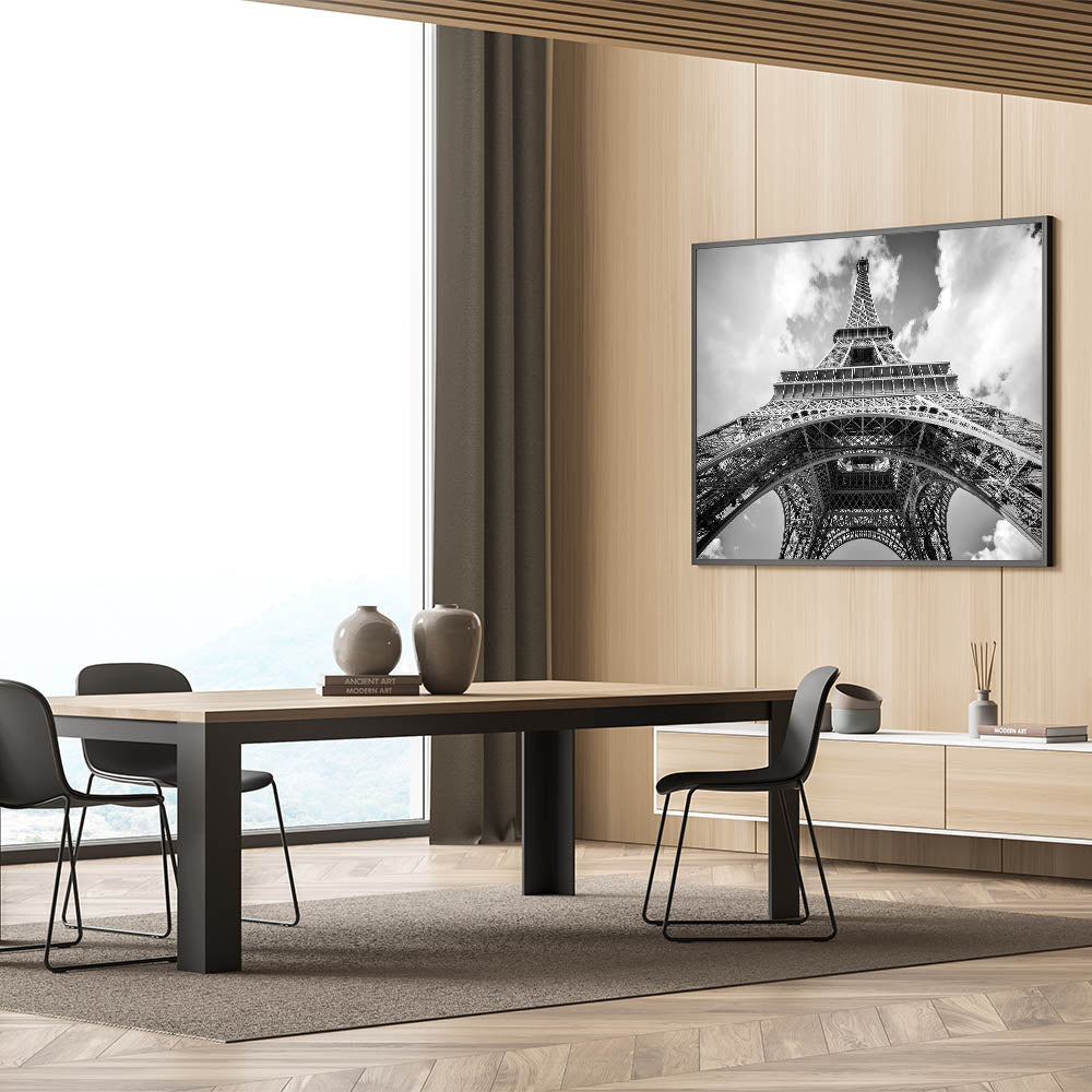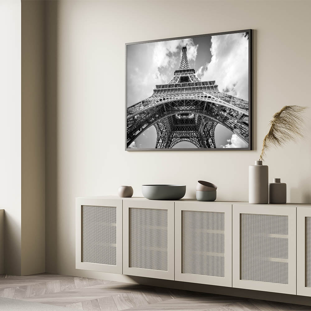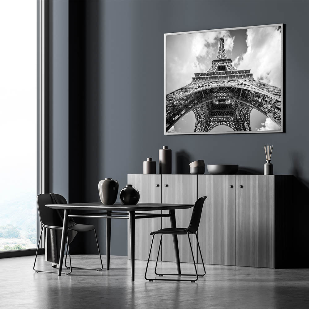 This striking Paris canvas print captures the grandeur of the Eiffel Tower from a unique perspective, creating an unforgettable visual impact. The monochrome palette enhances the architectural beauty of this iconic structure, making it the perfect addition to any modern or classic interior. The use of black and white photography gives this Paris cityscape a timeless, elegant feel.