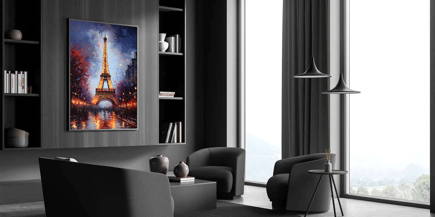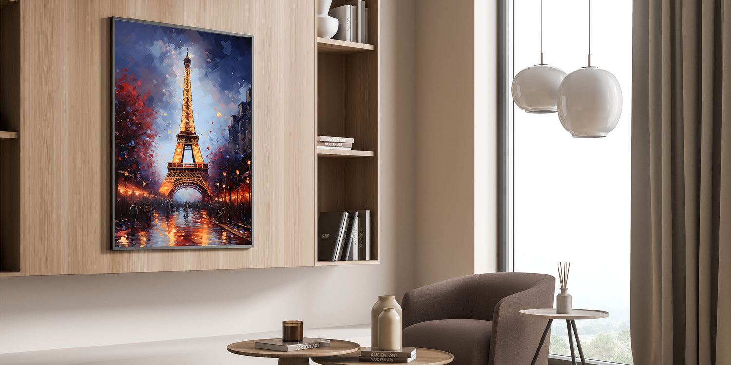 - A stunning depiction of the Eiffel Tower with glowing lights, perfect for French wall décor.