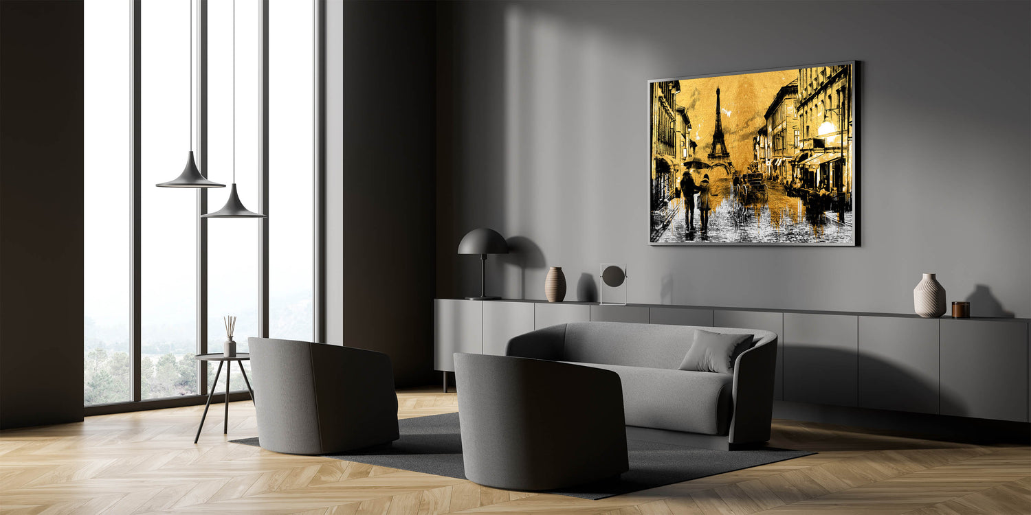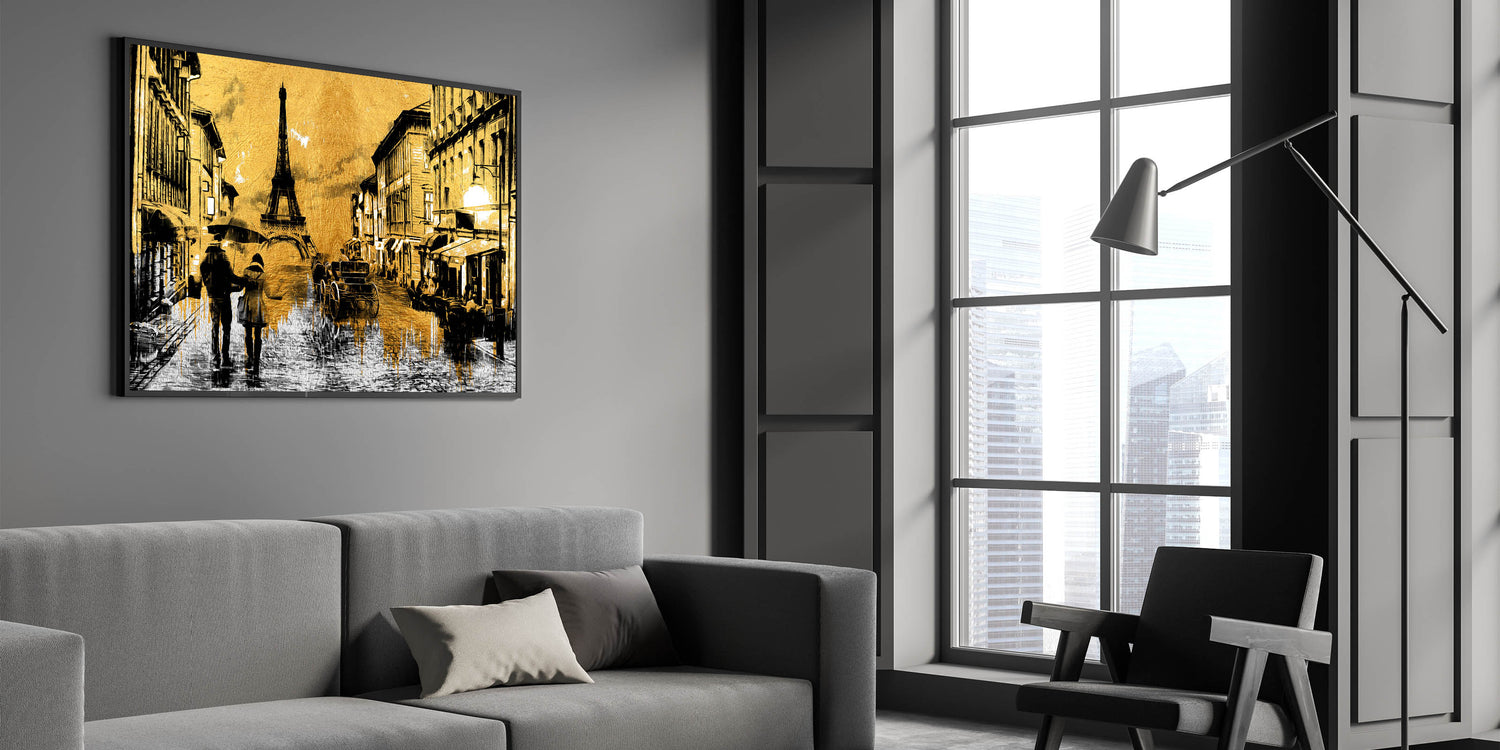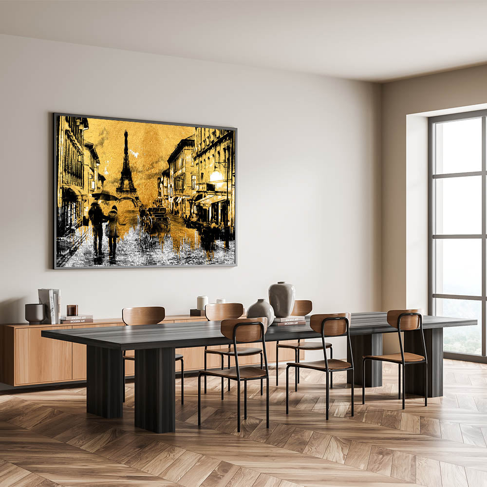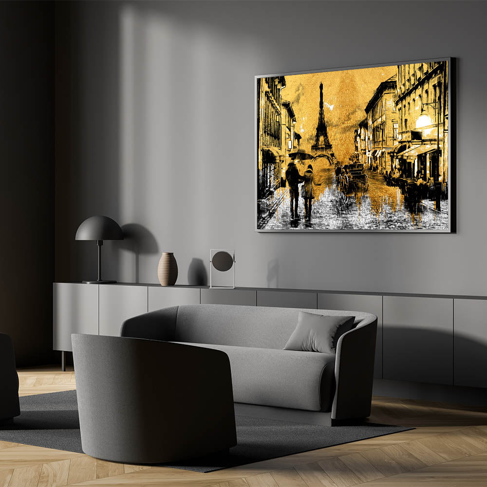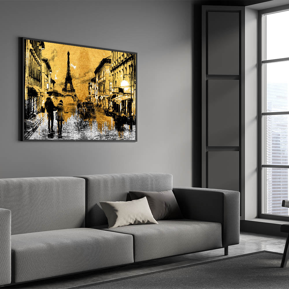 This bold Paris wall art showcases a beautiful street scene with the Eiffel Tower, dramatically rendered in a striking gold and black contrast. The textured gold background creates a rich, luxurious feel, while the black detailing of the Parisian street adds depth and character. Perfect for those who appreciate modern and artistic takes on classic landmarks, this high-quality Paris print is available in a variety of formats, including framed canvas, acrylic glass, and stretched canvas.
