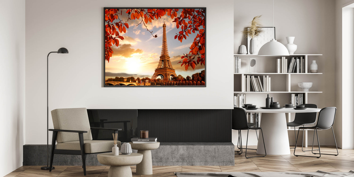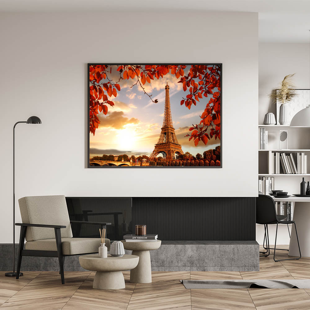 Bring a touch of Parisian charm into your space with this beautiful Paris artwork. Featuring the iconic Eiffel Tower framed by vibrant autumn leaves, this piece captures the enchanting beauty of Paris in the fall. The warm hues of the sunset sky add a romantic and captivating atmosphere to this Paris canvas print.