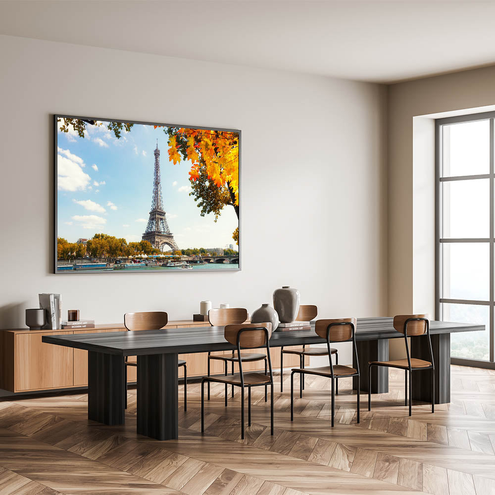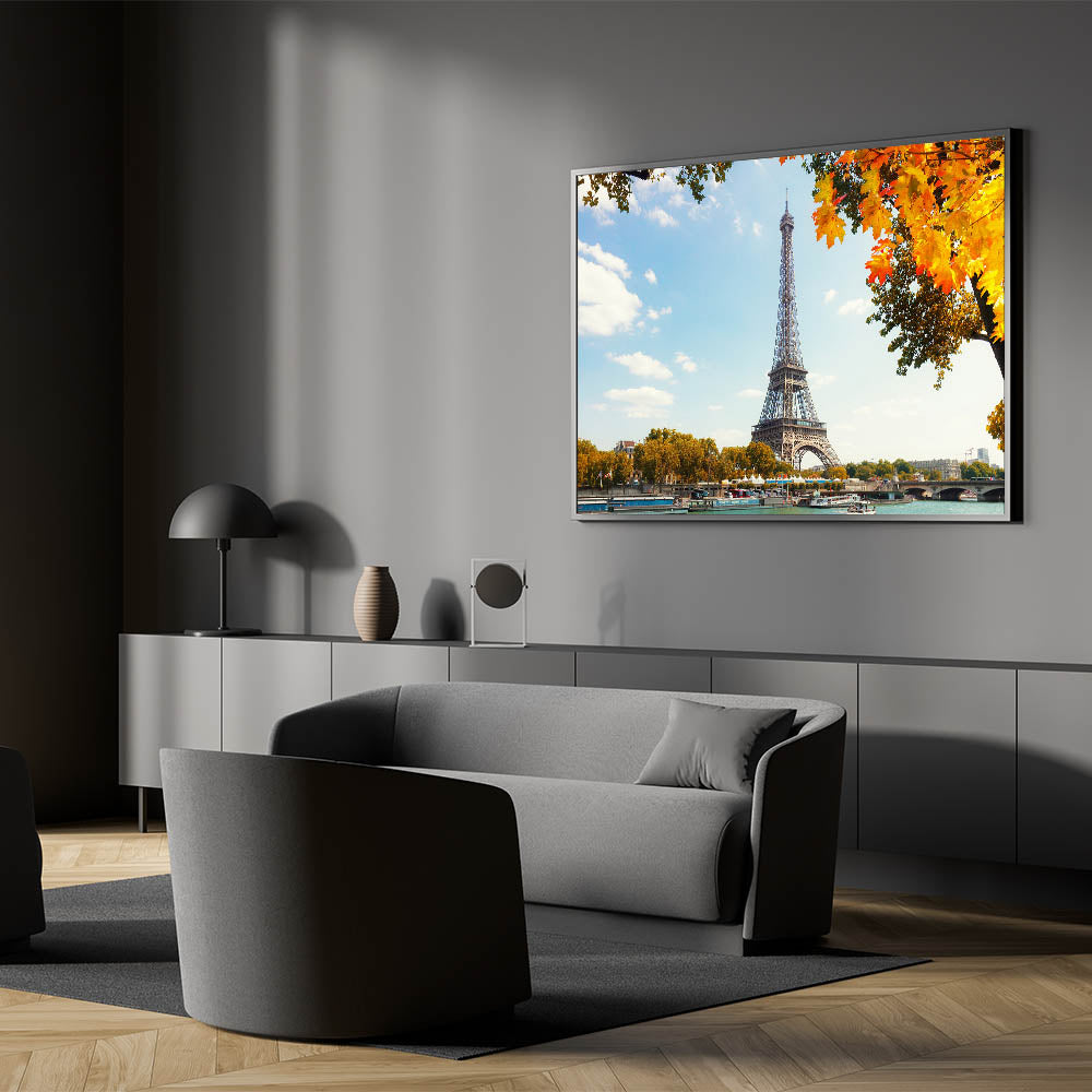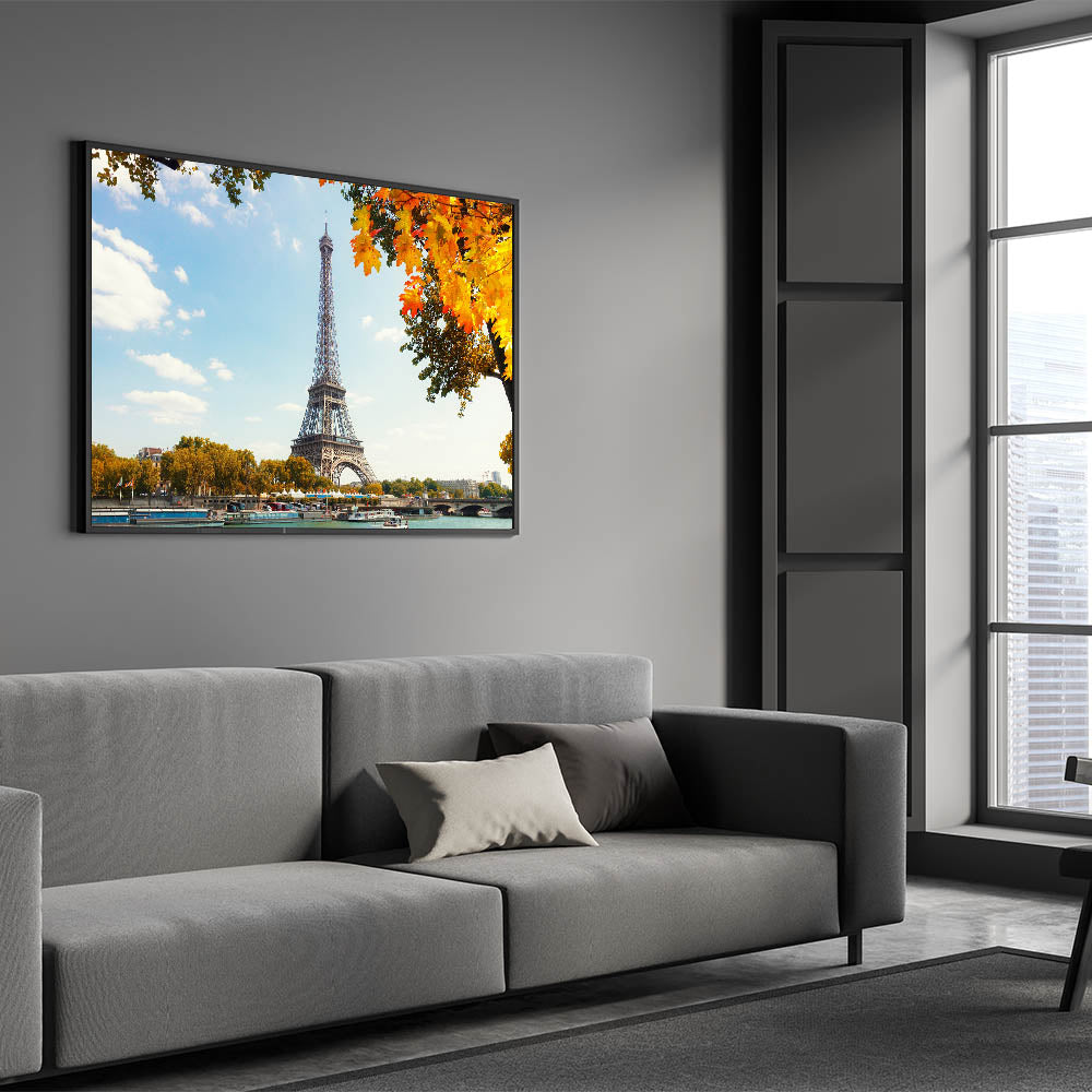 This picturesque Paris canvas print captures the stunning beauty of autumn in the city of love, featuring the Eiffel Tower rising against a bright, blue sky. The vibrant fall leaves frame the scene beautifully, while the Seine River flows below, creating a peaceful and captivating atmosphere. This piece brings together the best of Paris cityscape and nature, offering a timeless view of the Eiffel Tower during the fall.