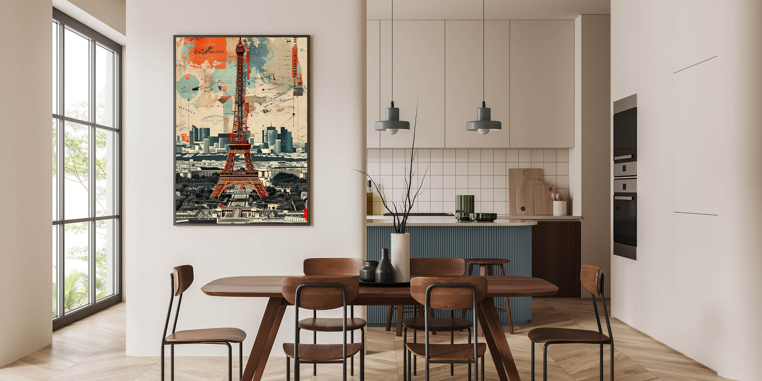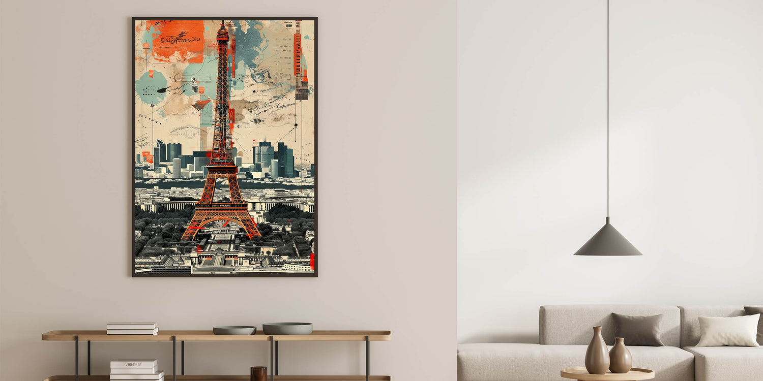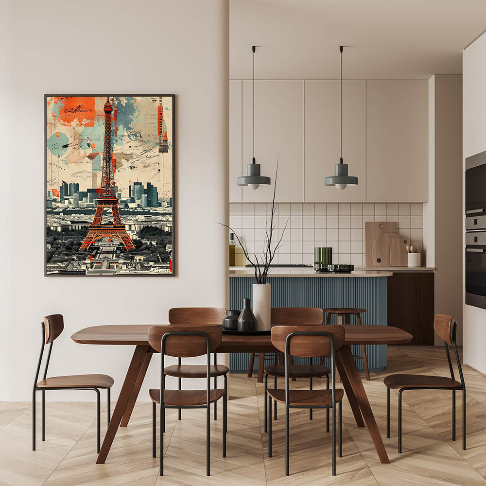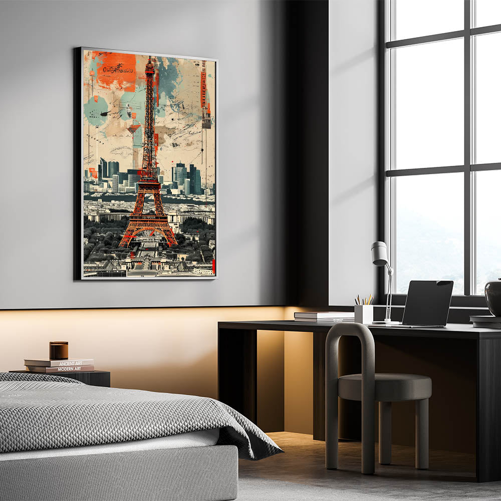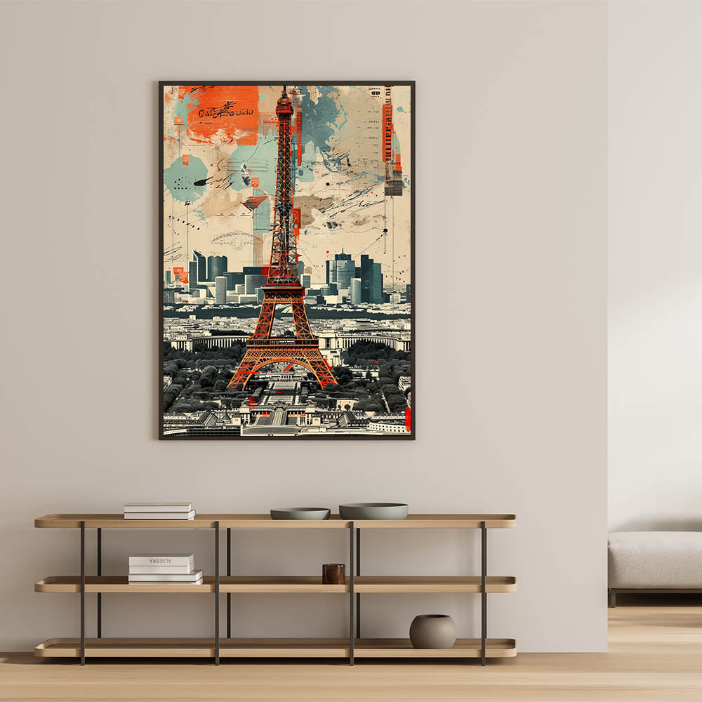This bold Paris wall art brings a modern twist to the iconic Eiffel Tower, blending urban elements with abstract details. The vibrant reds, oranges, and soft teal hues layered with architectural sketches and patterns create a dynamic, contemporary interpretation of the Paris cityscape. This canvas print is perfect for those looking to add a statement piece to their décor, combining the elegance of the Eiffel Tower with modern, artistic flair.