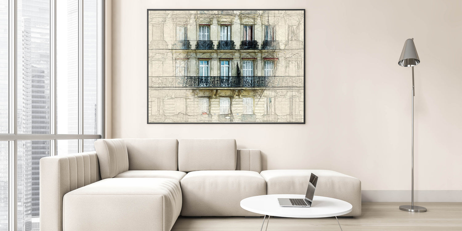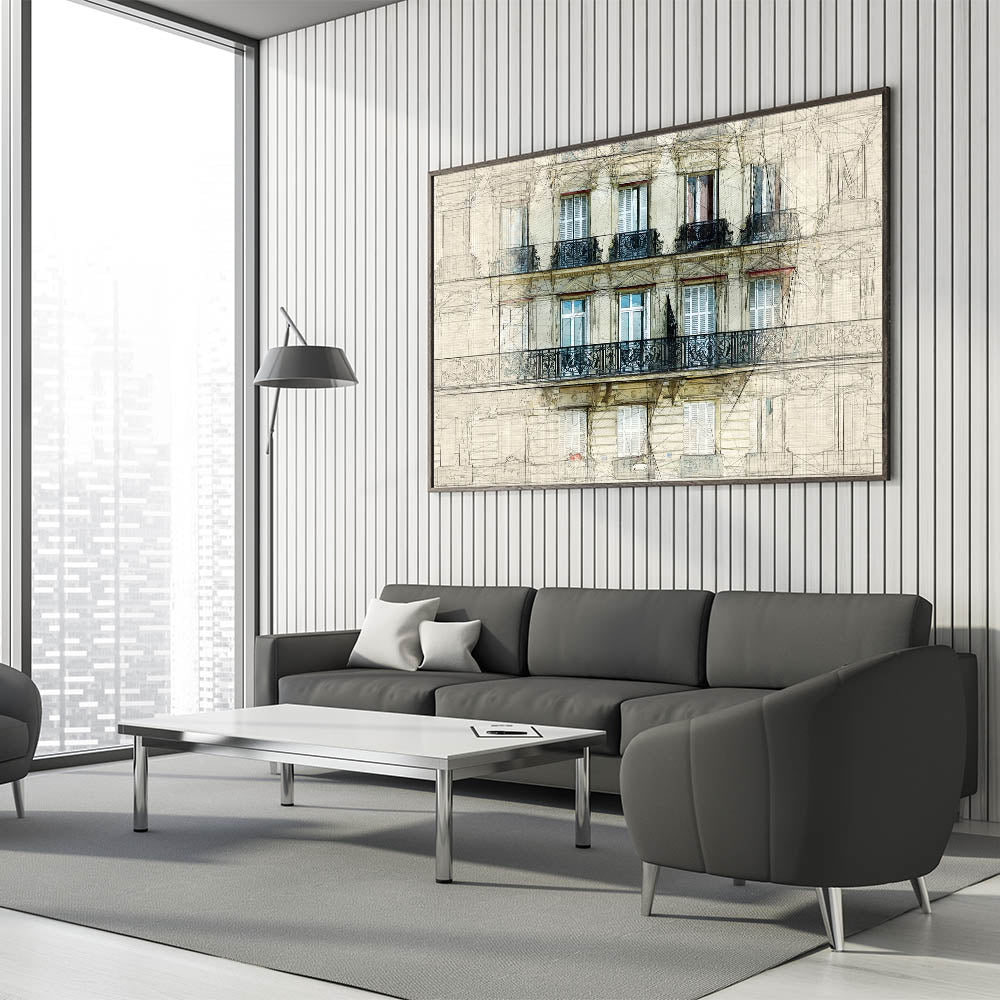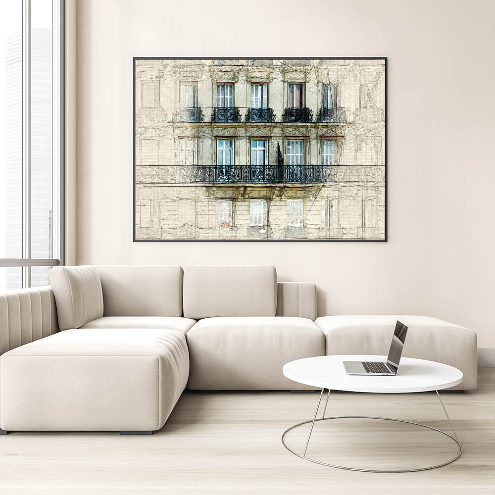 This stunning Paris canvas print blends the elegance of Parisian architecture with the creative flair of a hand-drawn sketch. The intricate details of a classic Parisian balcony are brought to life with a unique combination of pencil lines and soft colors. This architectural art print captures the charm and sophistication of Paris, making it a perfect addition to any modern or classic decor.