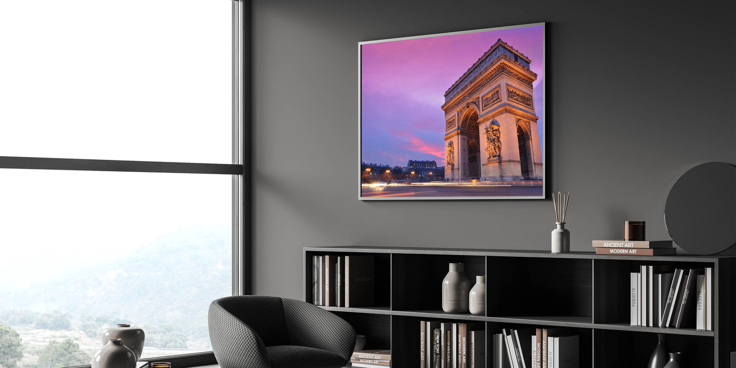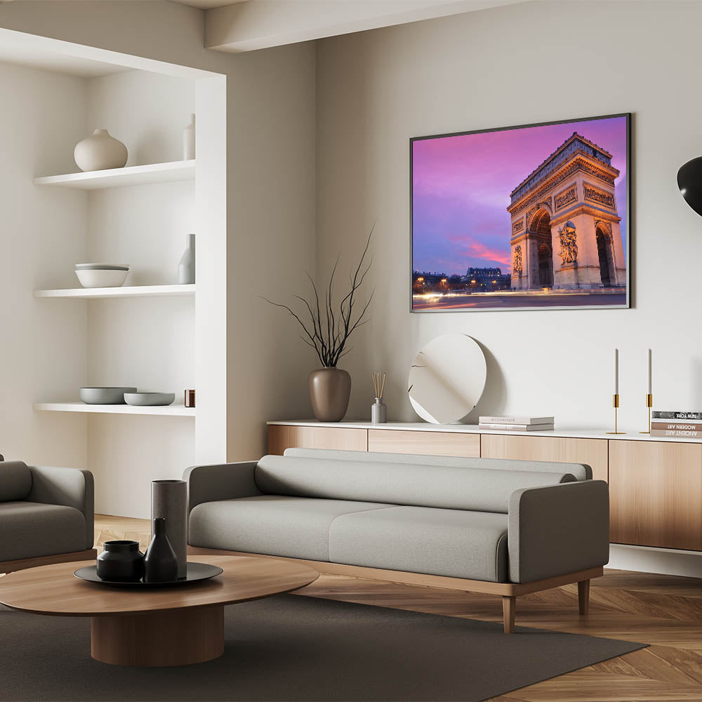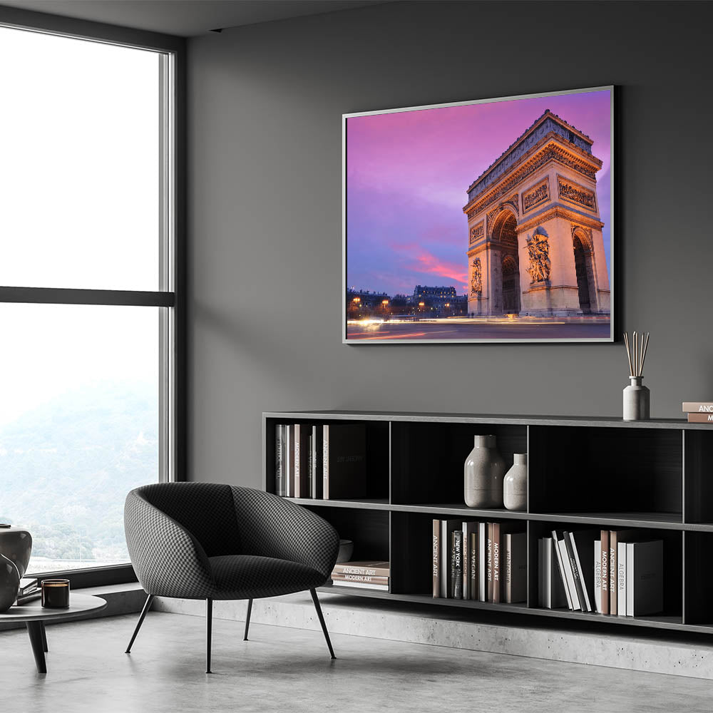 Transform your living space with this beautiful Paris artwork, featuring the iconic Arc de Triomphe at dusk. The Paris cityscape in this piece captures the romance and charm of the French capital, with sunset hues painting the sky in stunning pink and purple tones. Whether you're looking for high-quality Paris prints for your home or office, this captivating piece will make a statement in any room.