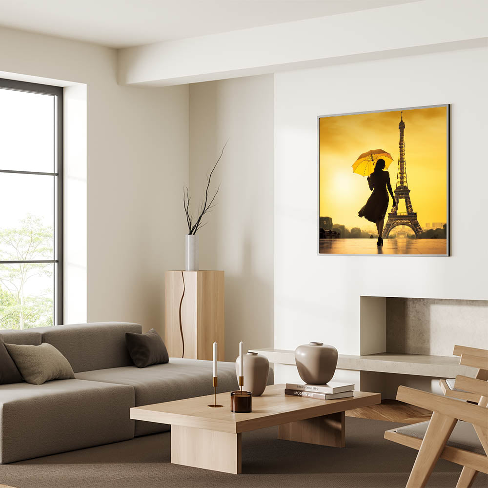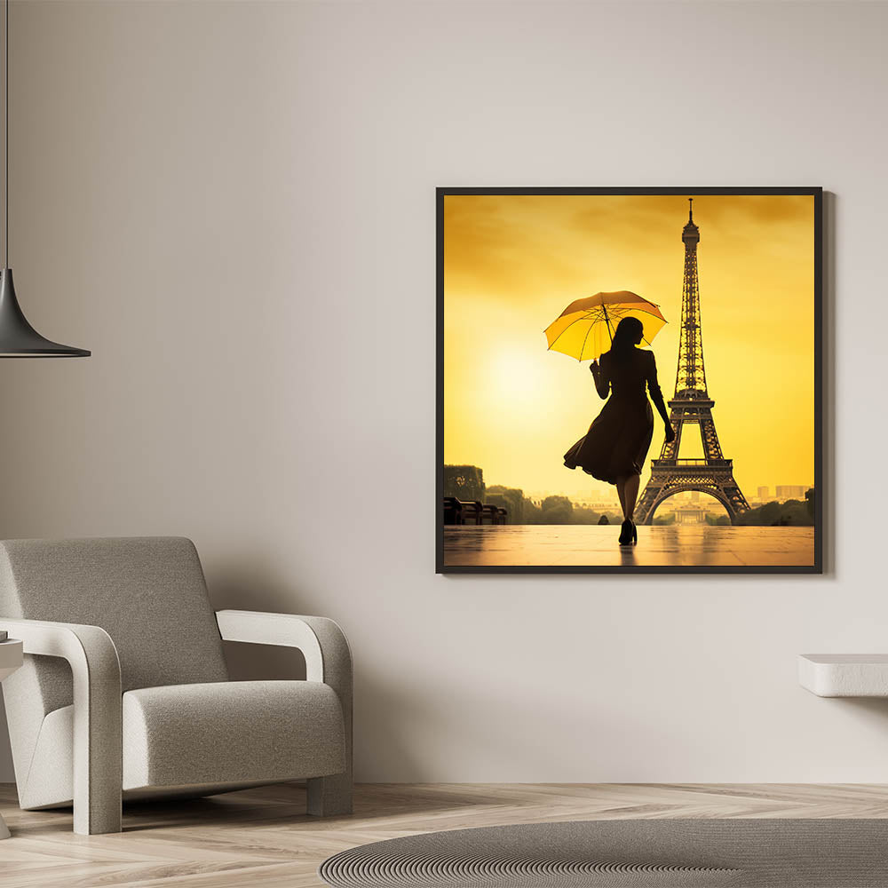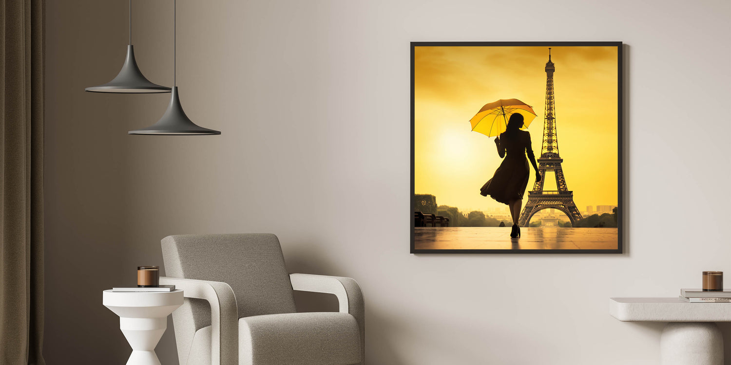 This striking Paris canvas print features a captivating silhouette of a woman with an umbrella, walking gracefully toward the Eiffel Tower. The vivid yellow background casts a warm glow, making this artwork a perfect blend of elegance and romance. Ideal for anyone looking to add a touch of Parisian charm to their space, this piece is a great example of Paris photography and romantic wall art.