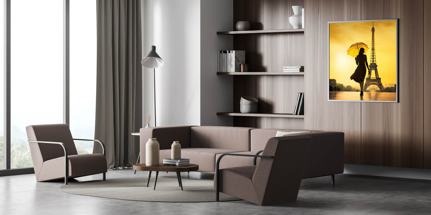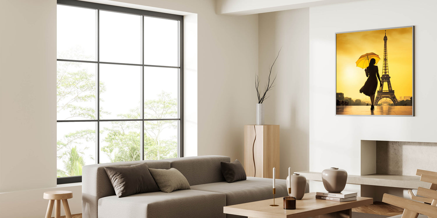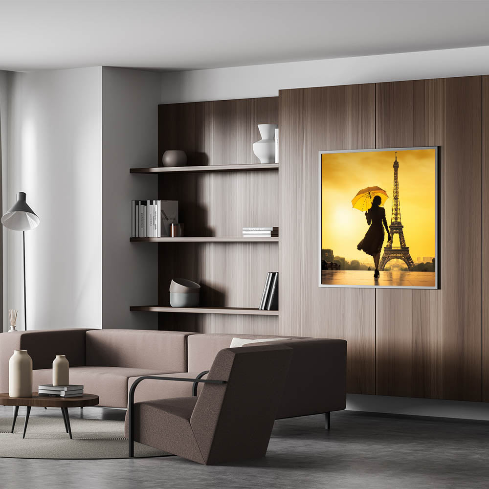 This striking Paris canvas print features a captivating silhouette of a woman with an umbrella, walking gracefully toward the Eiffel Tower. The vivid yellow background casts a warm glow, making this artwork a perfect blend of elegance and romance. Ideal for anyone looking to add a touch of Parisian charm to their space, this piece is a great example of Paris photography and romantic wall art.