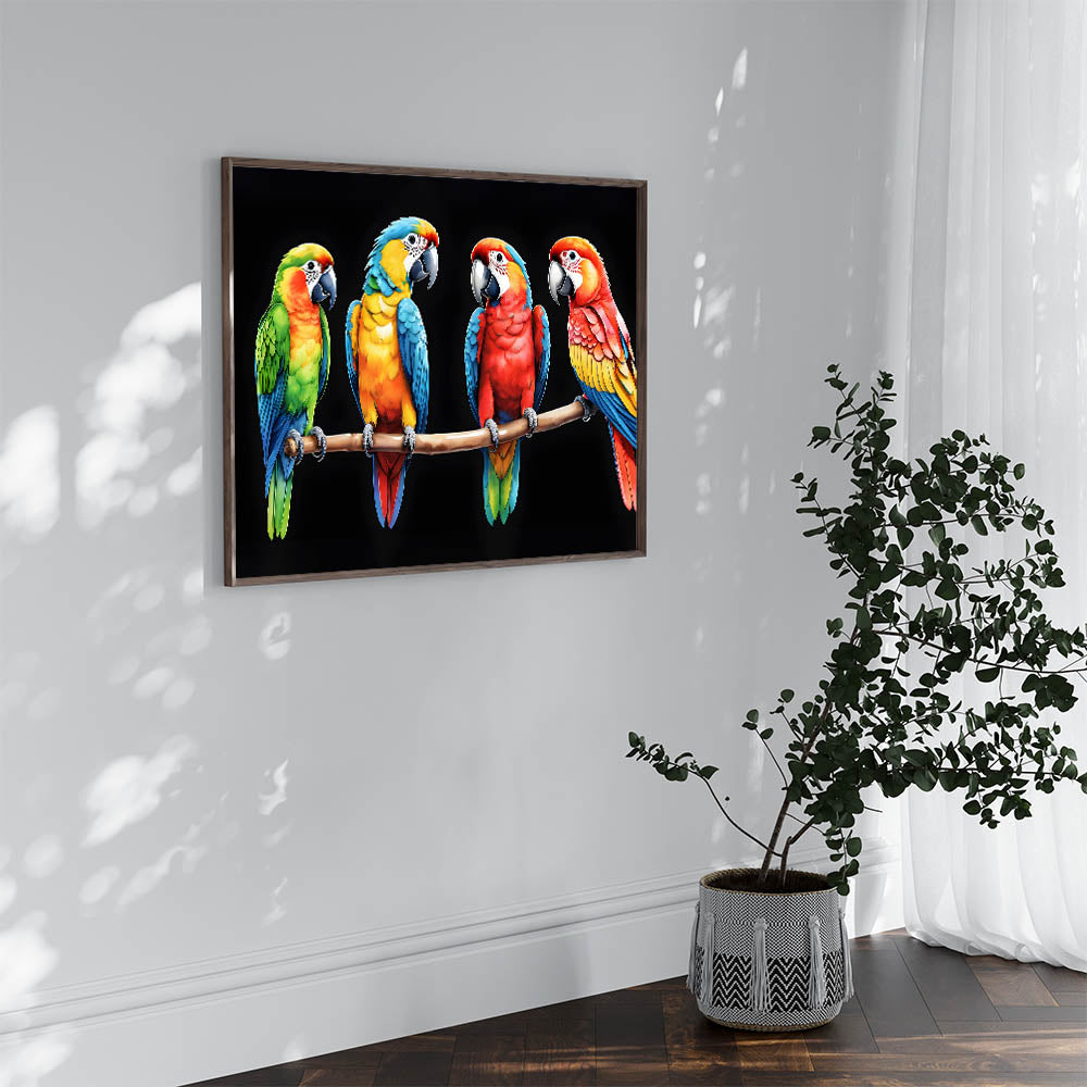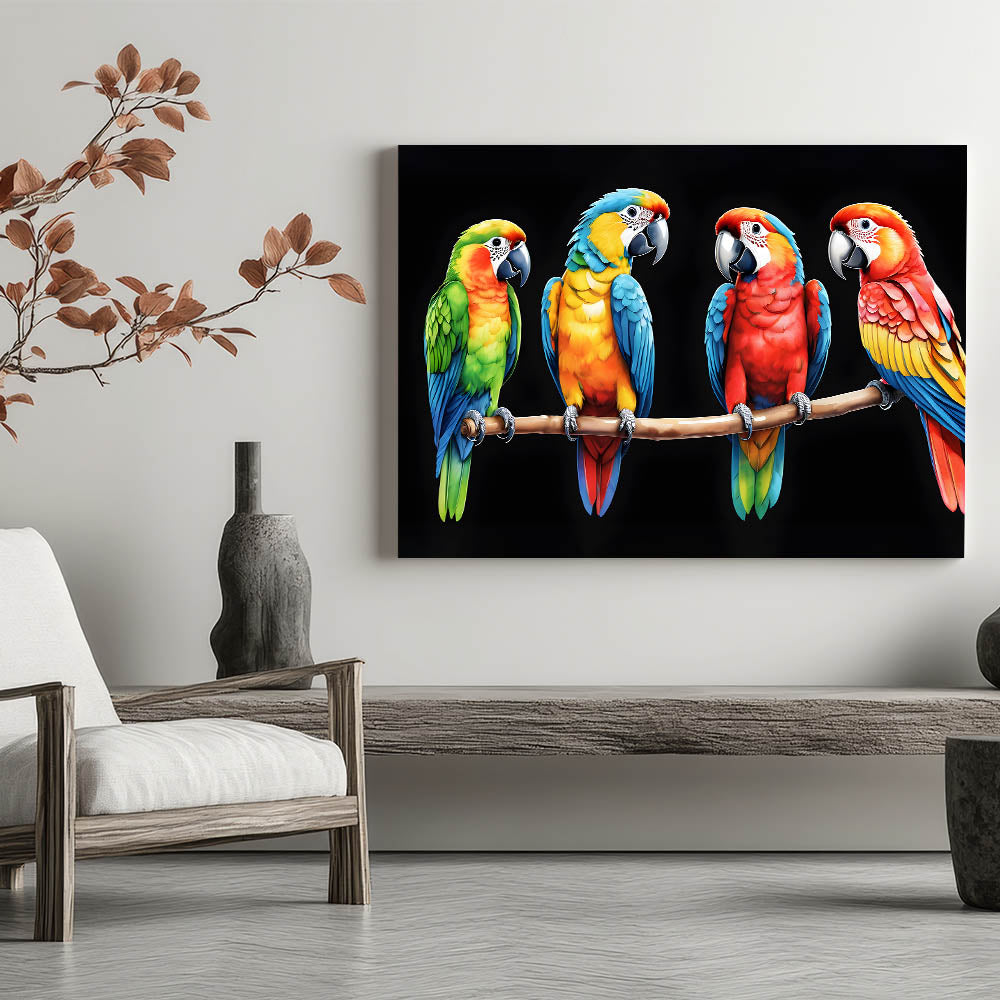 Brighten up your space with the lively energy of this Colorful Parrot Quartet Wall Art. This artwork features four vividly colored parrots perched together against a striking black background. The vibrant green, yellow, blue, and red feathers of the parrots pop with intensity, making this piece a dazzling focal point in any room. Perfect for those who love bold and tropical decor, this parrot canvas print brings a splash of the wild into your home.