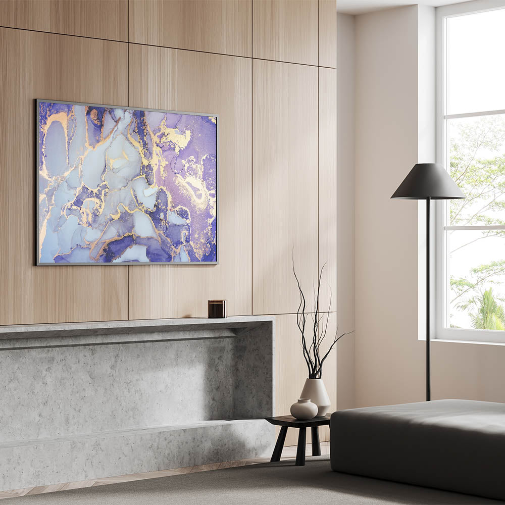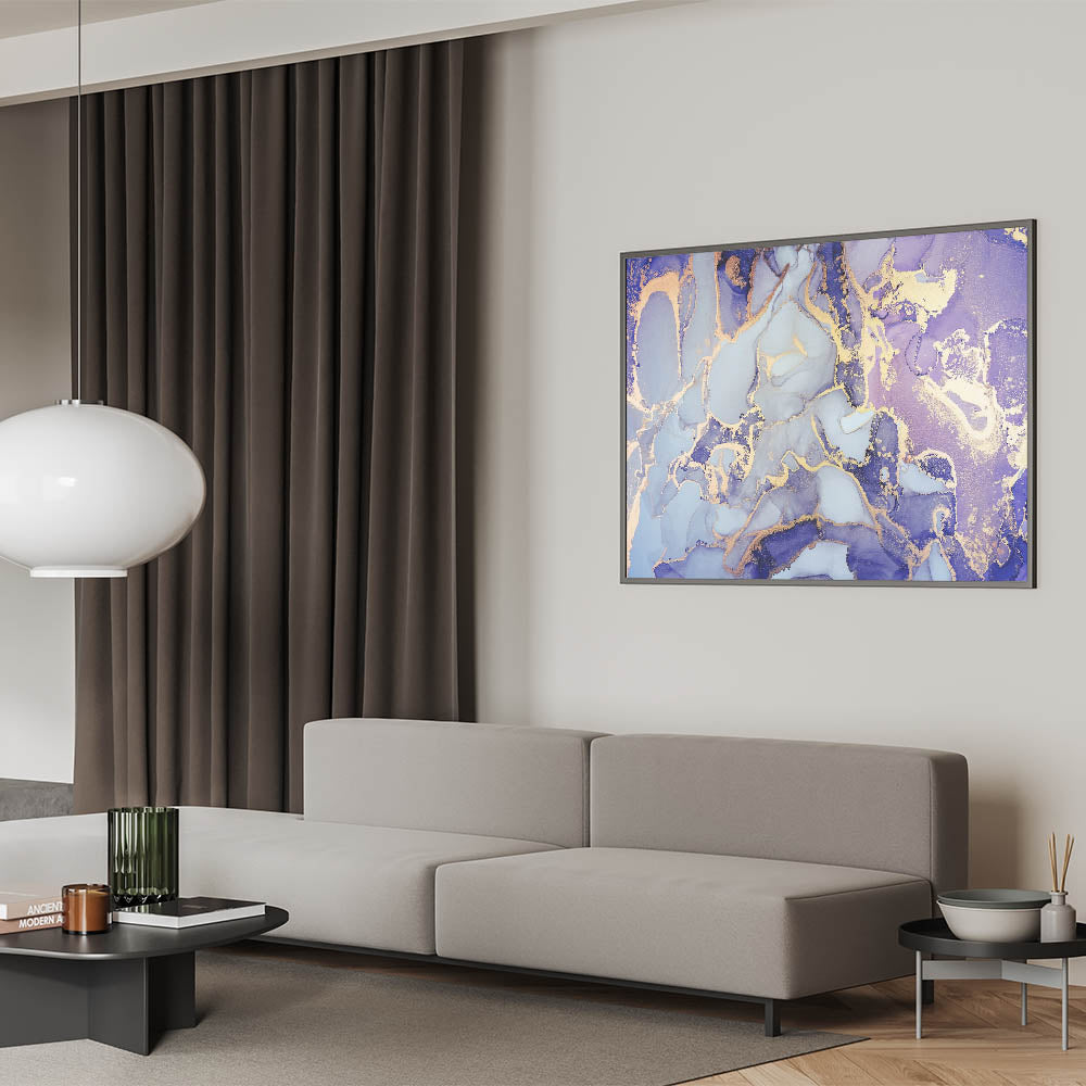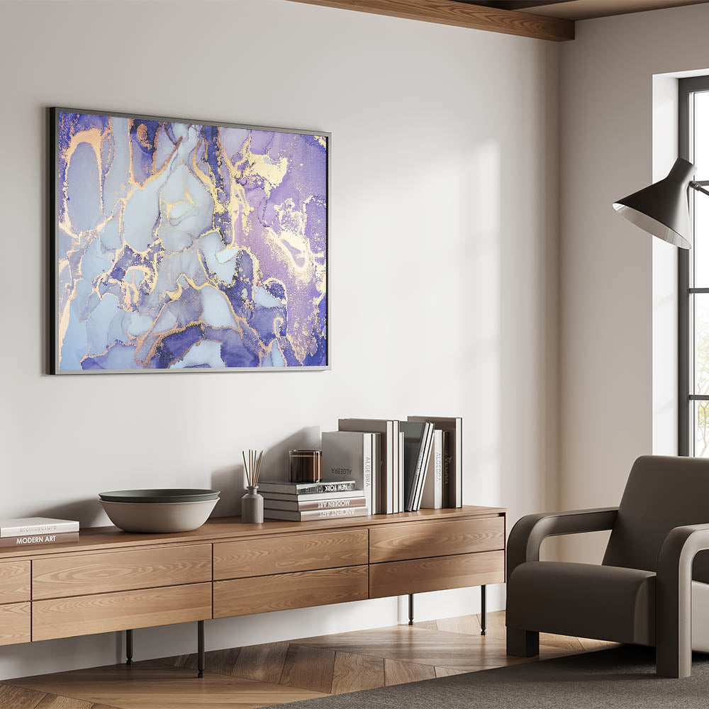 - High-end abstract canvas print featuring royal blue, lilac, and gold tones