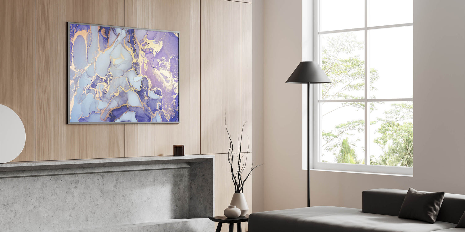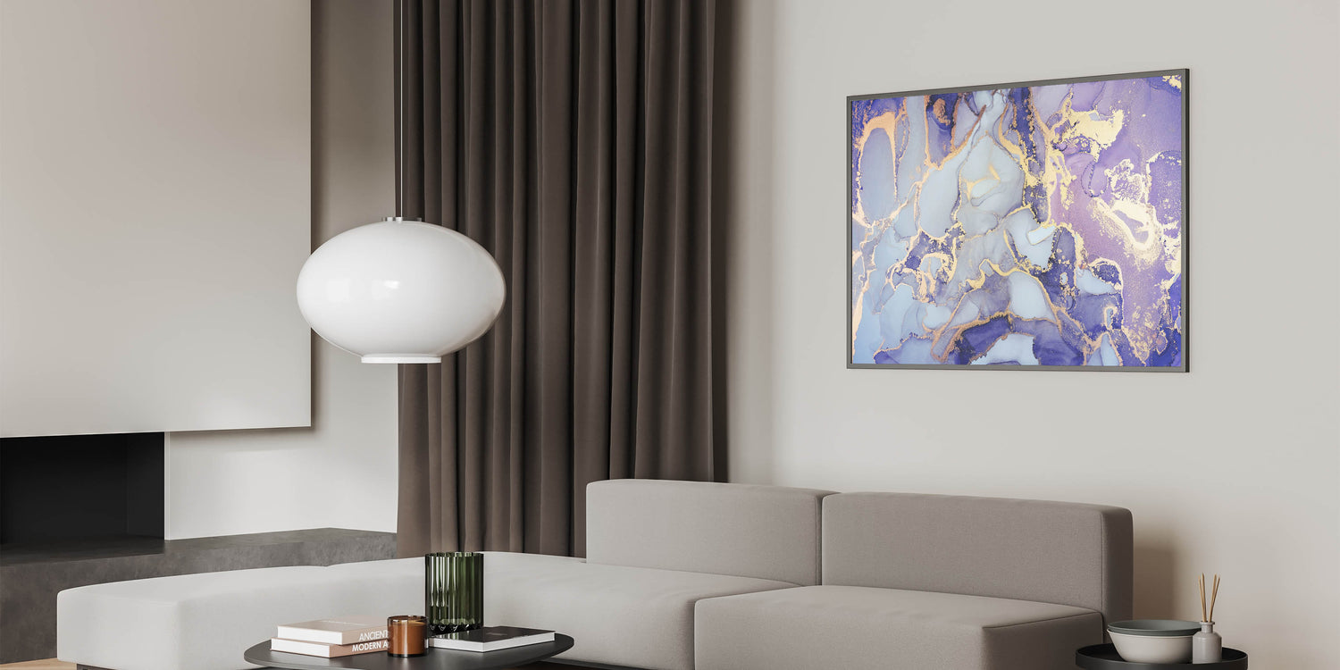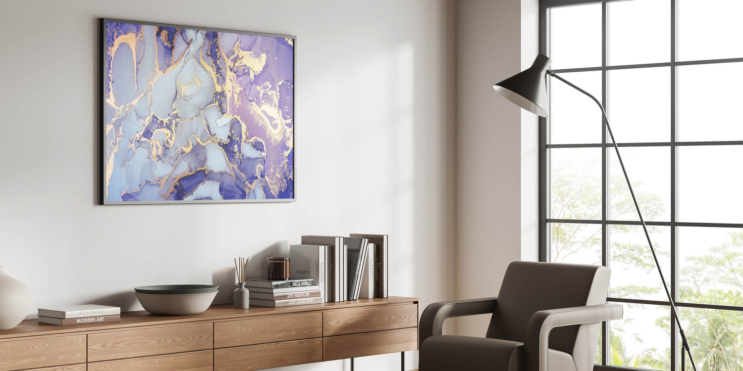 - High-end abstract canvas print featuring royal blue, lilac, and gold tones