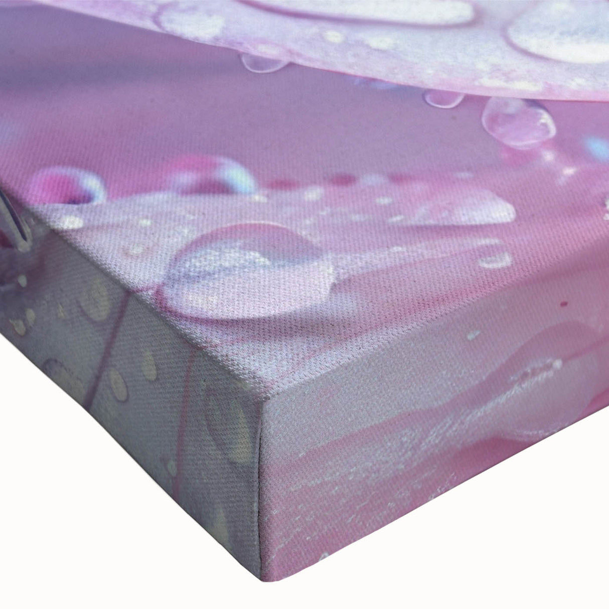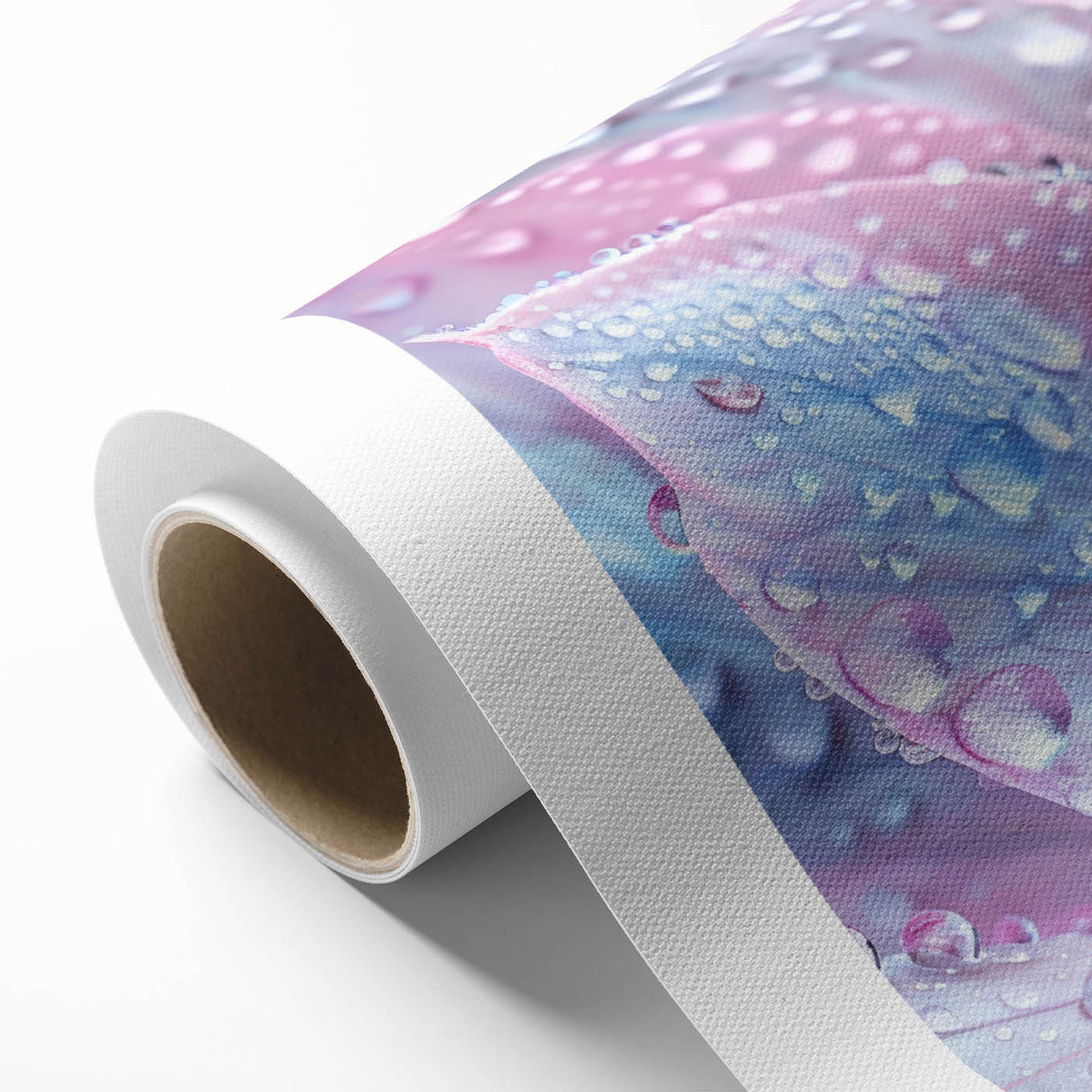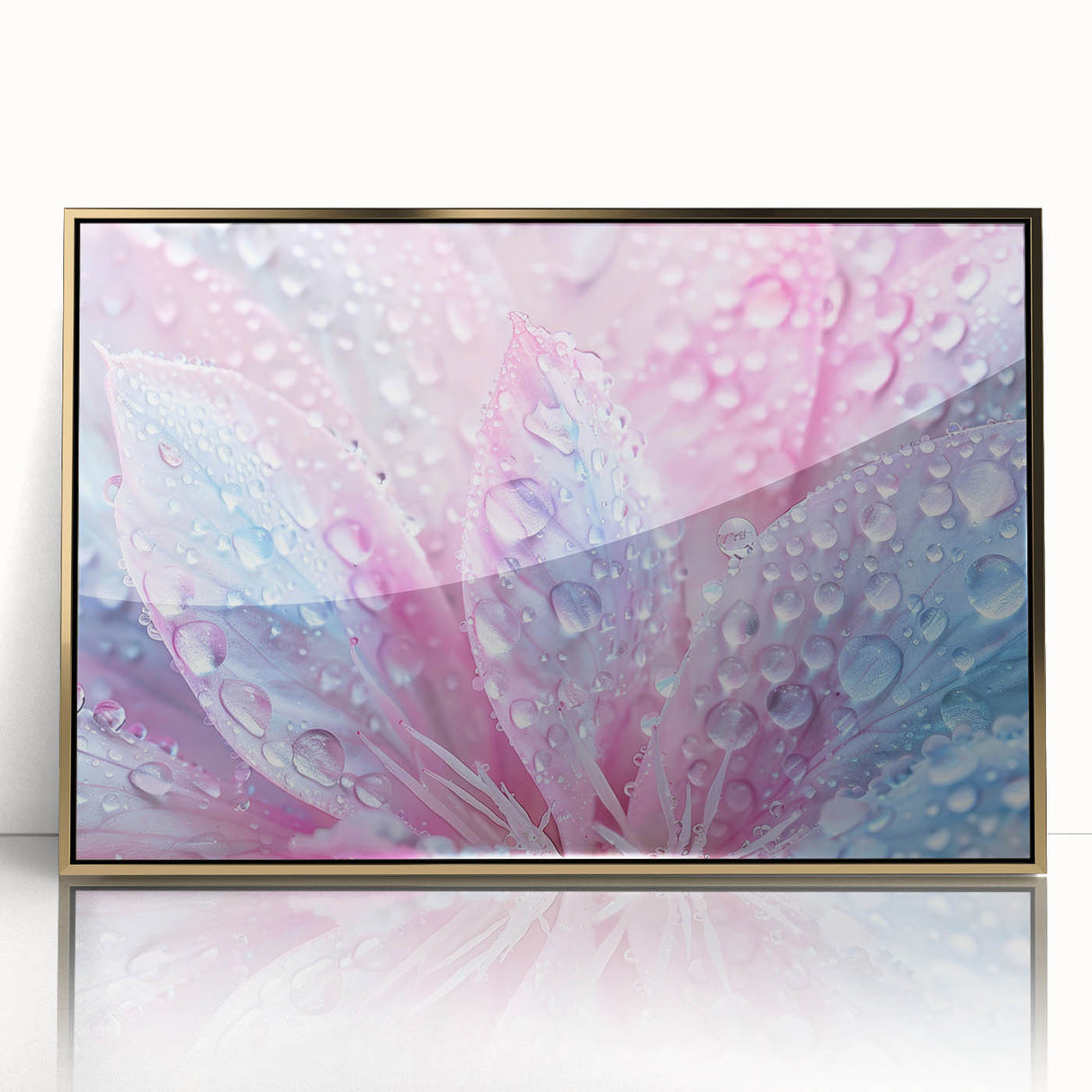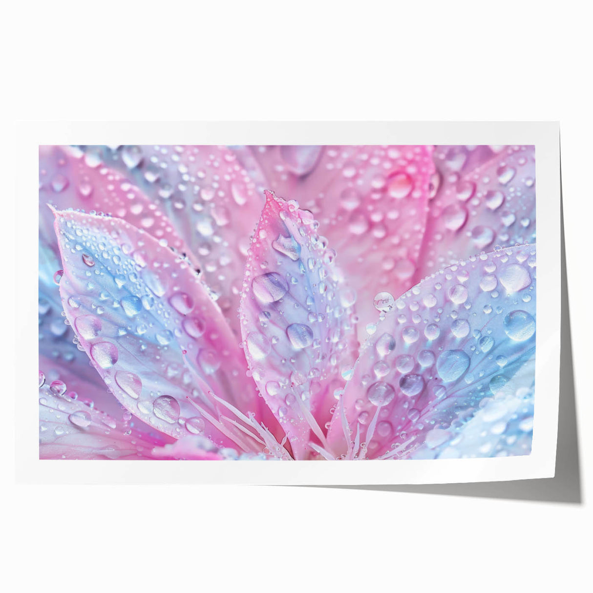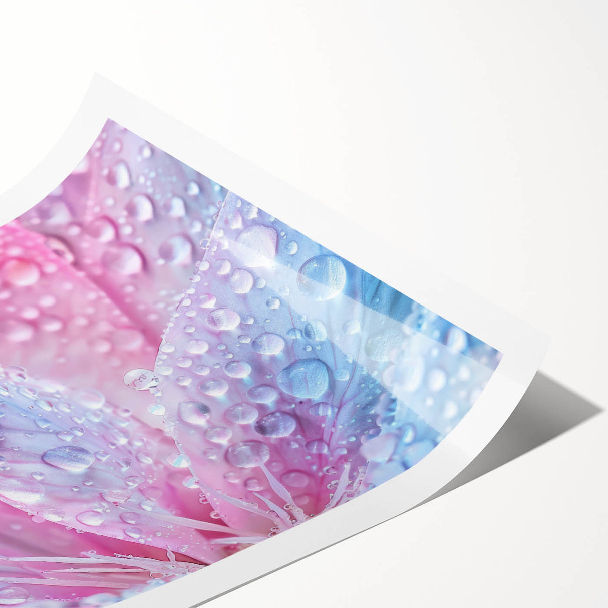 Brighten your living space with the elegance of this floral water-inspired wall art. This mesmerizing nature close-up features delicate water droplets on pastel-colored petals, blending soft pink and blue hues for a calming and soothing aesthetic. The intricate details and refreshing colors make this piece the perfect addition to any room, infusing your space with beauty and tranquility.