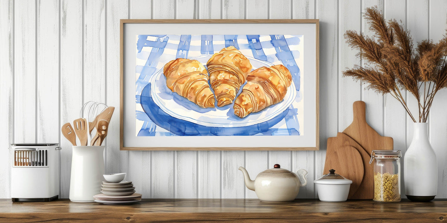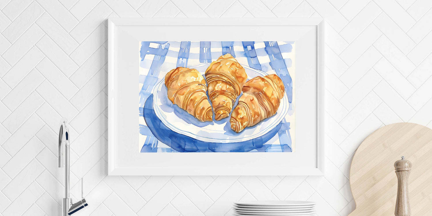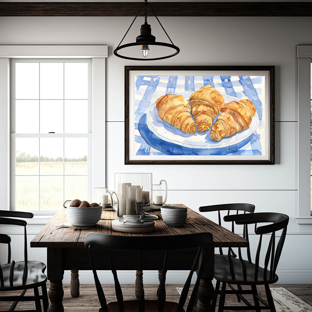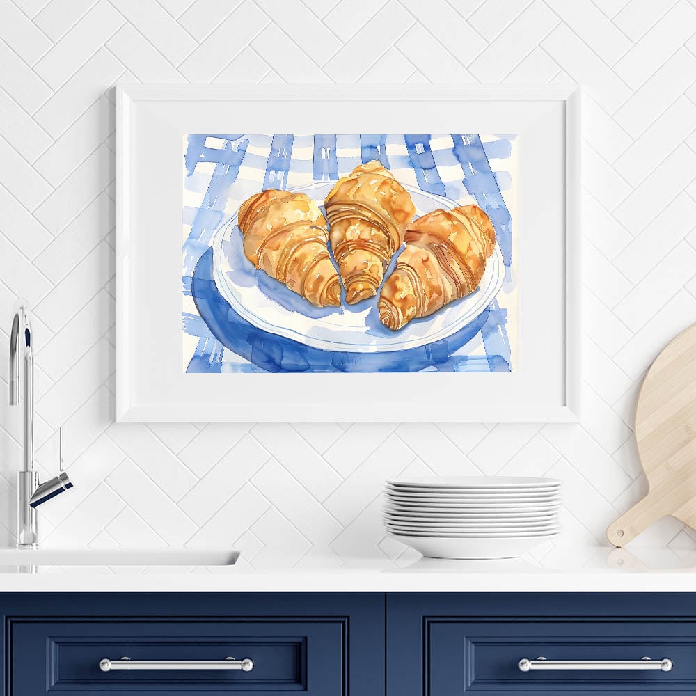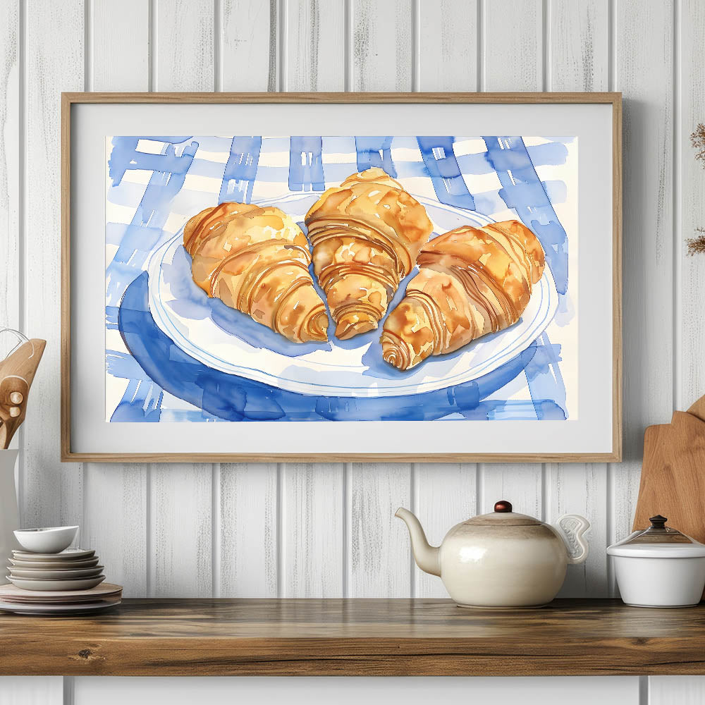 Add a touch of French café charm to your space with this vibrant bakery wall art, featuring a beautifully detailed watercolor painting of golden croissants on a plate. The soft blue checkered background enhances the cozy and inviting feel, making this pastry art print a perfect addition to kitchens, cafés, or bakeries.
