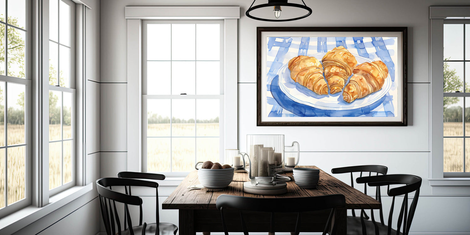 • Stunning pastry art print featuring a delicate watercolor croissant scene.