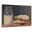Celebrate the nostalgia of a classic treat with this beautifully detailed bakery art print, featuring a rich oil painting of a peanut butter and jelly sandwich alongside a rustic mason jar of milk. The deep, moody tones and lifelike textures bring warmth to any kitchen, bakery, or café setting.