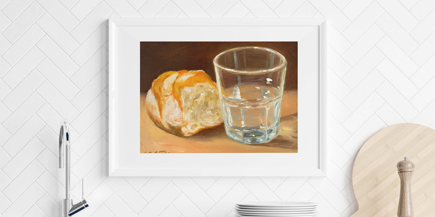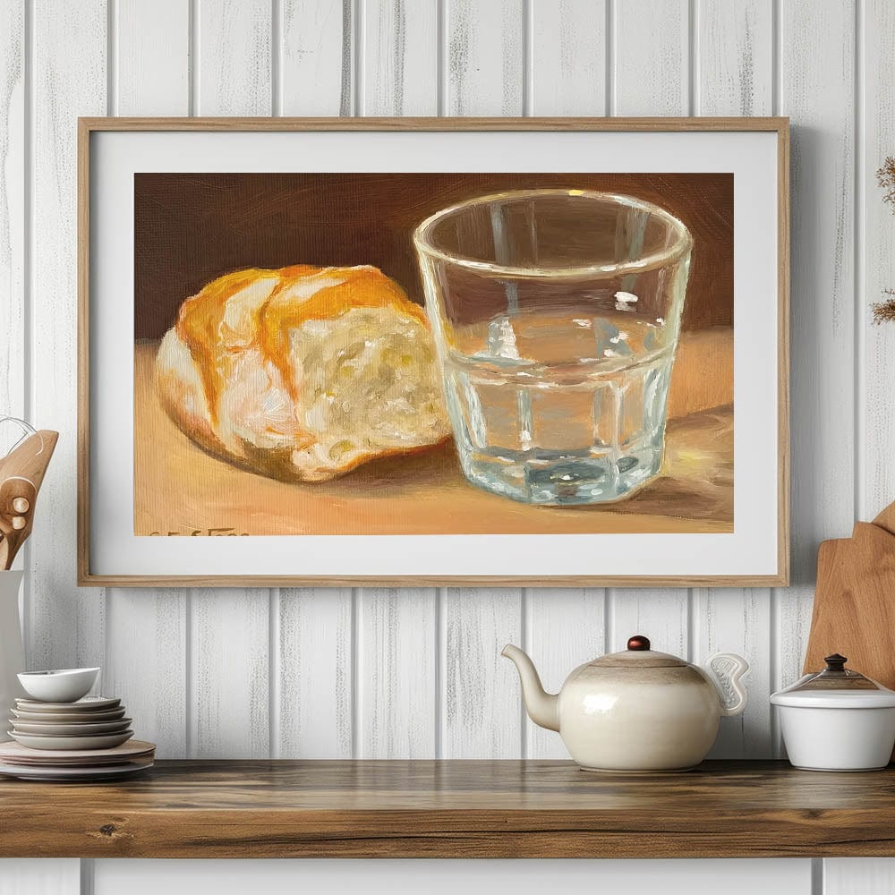 Rustic Bread & Water Oil Painting – Bakery Kitchen Wall Art
