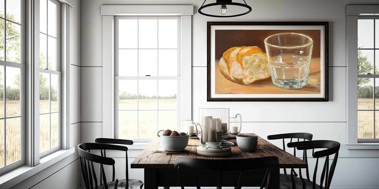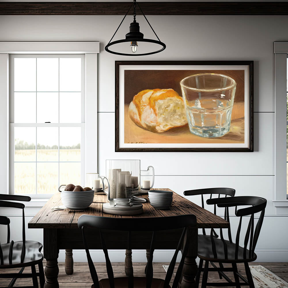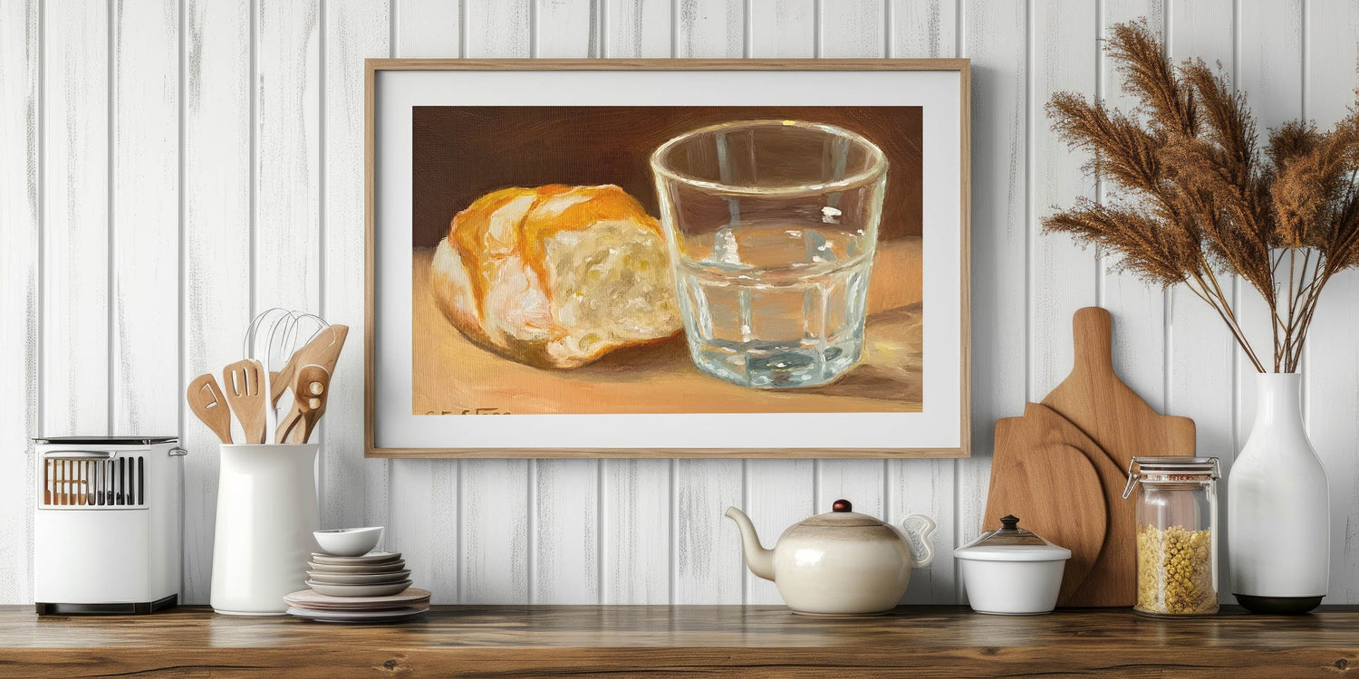 Capture the simplicity of everyday life with this exquisite oil painting of a rustic loaf of bread and a glass of water. This bakery wall art showcases rich textures, warm tones, and a timeless still-life composition, making it a perfect addition to kitchens, cafés, or dining areas.
