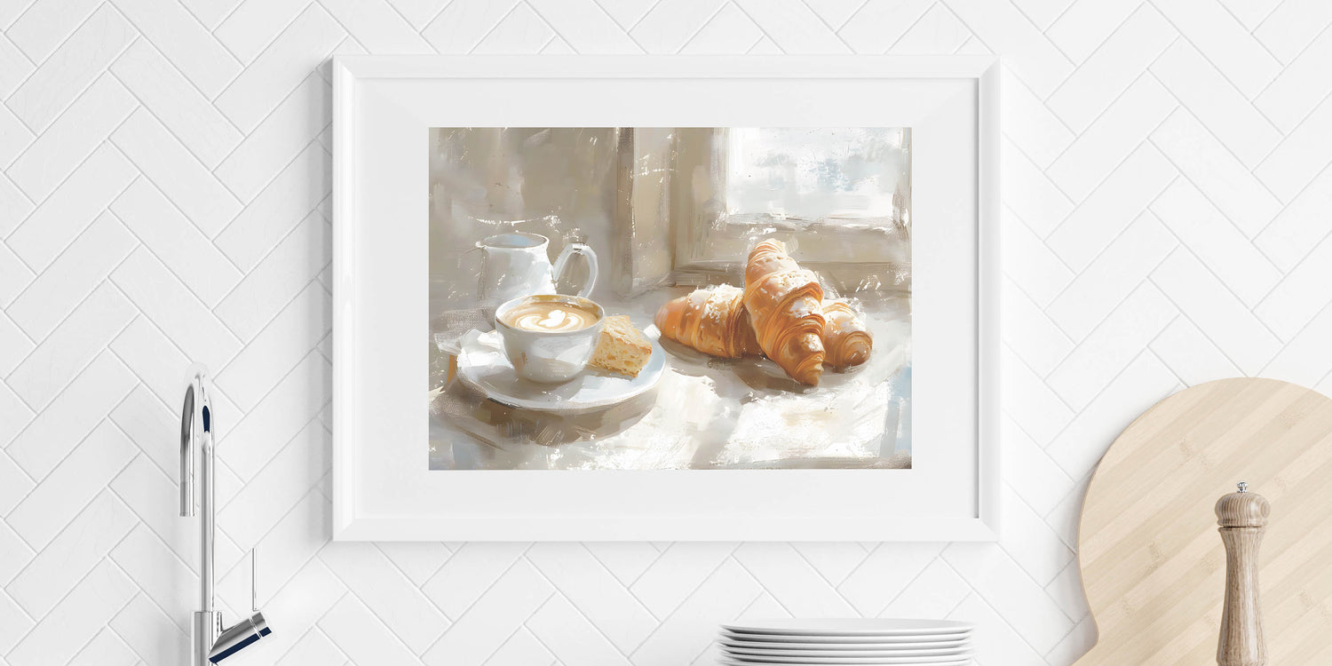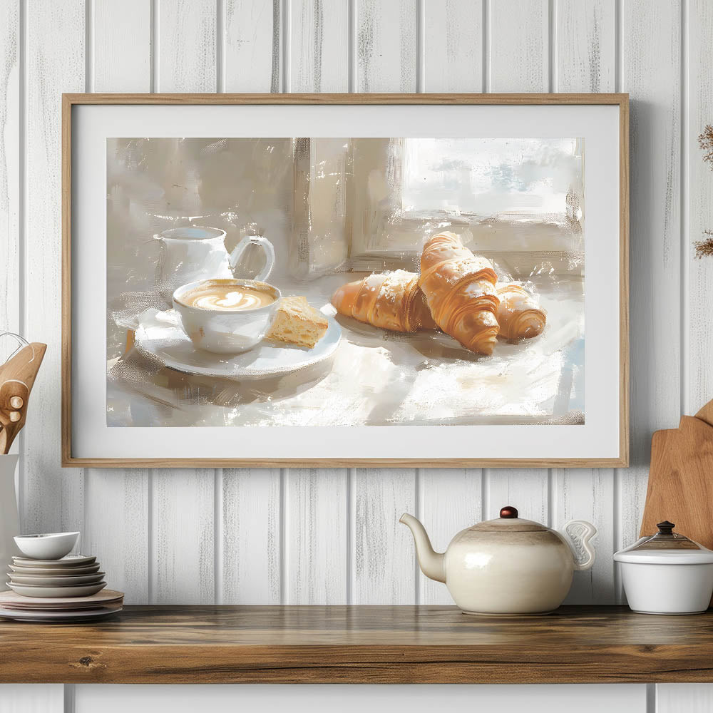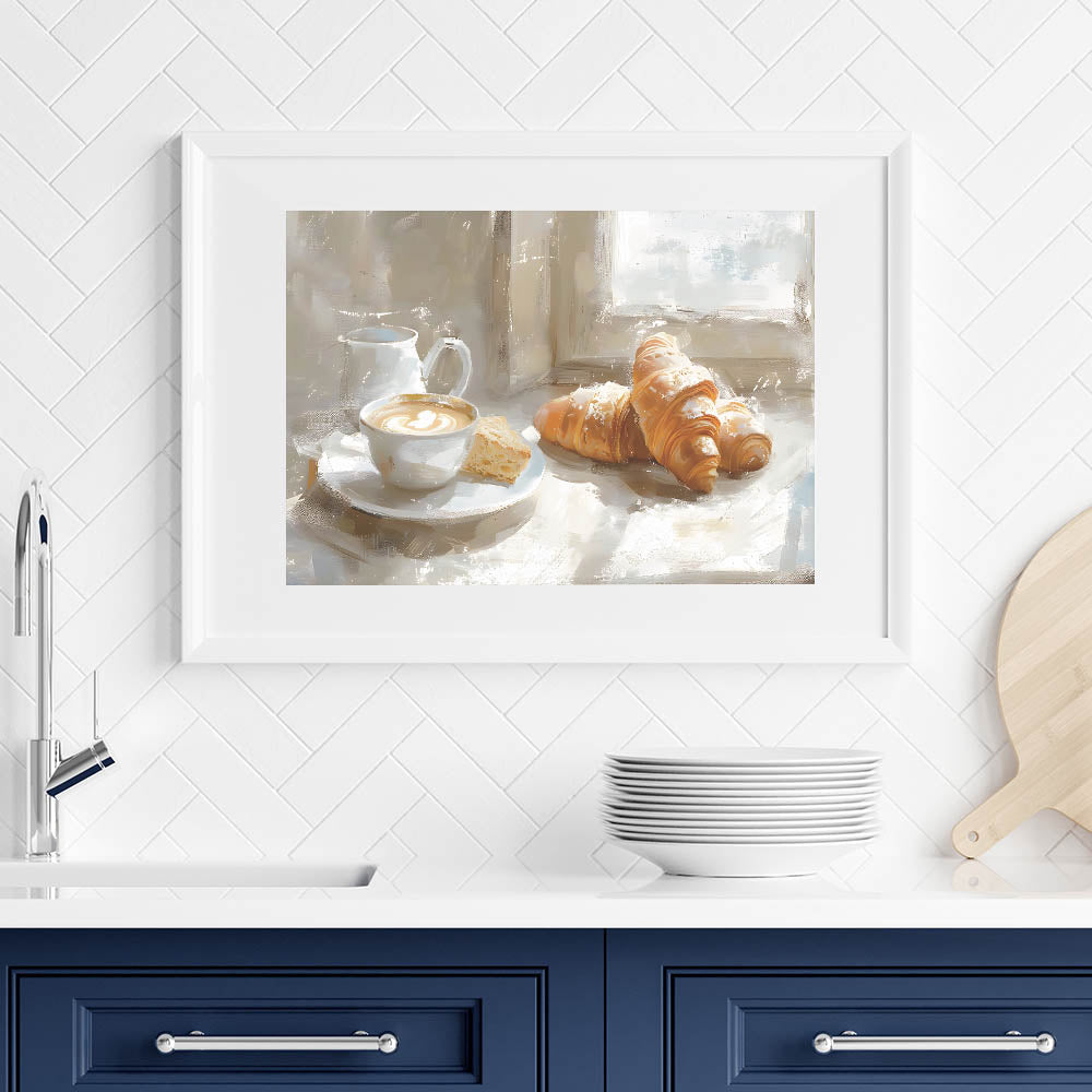 Add a sophisticated touch to your space with this bakery art print, capturing the essence of a tranquil morning with fresh croissants and a perfectly brewed coffee.