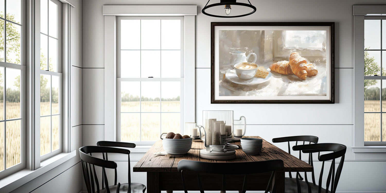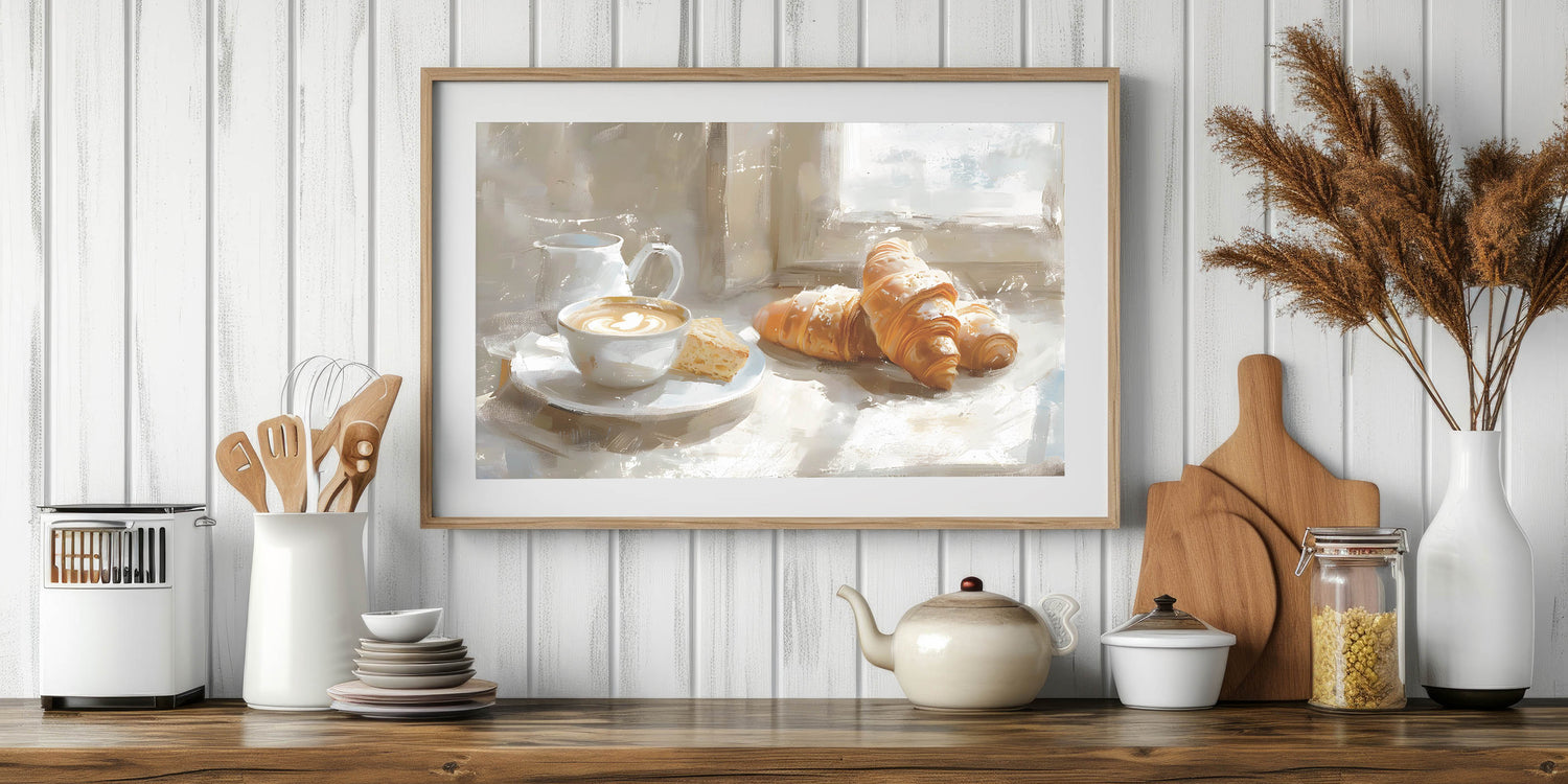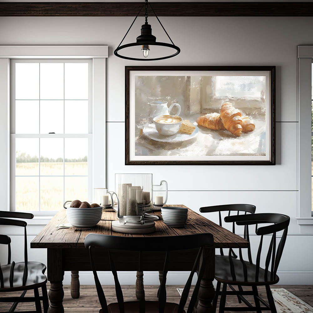 Add a sophisticated touch to your space with this bakery art print, capturing the essence of a tranquil morning with fresh croissants and a perfectly brewed coffee.