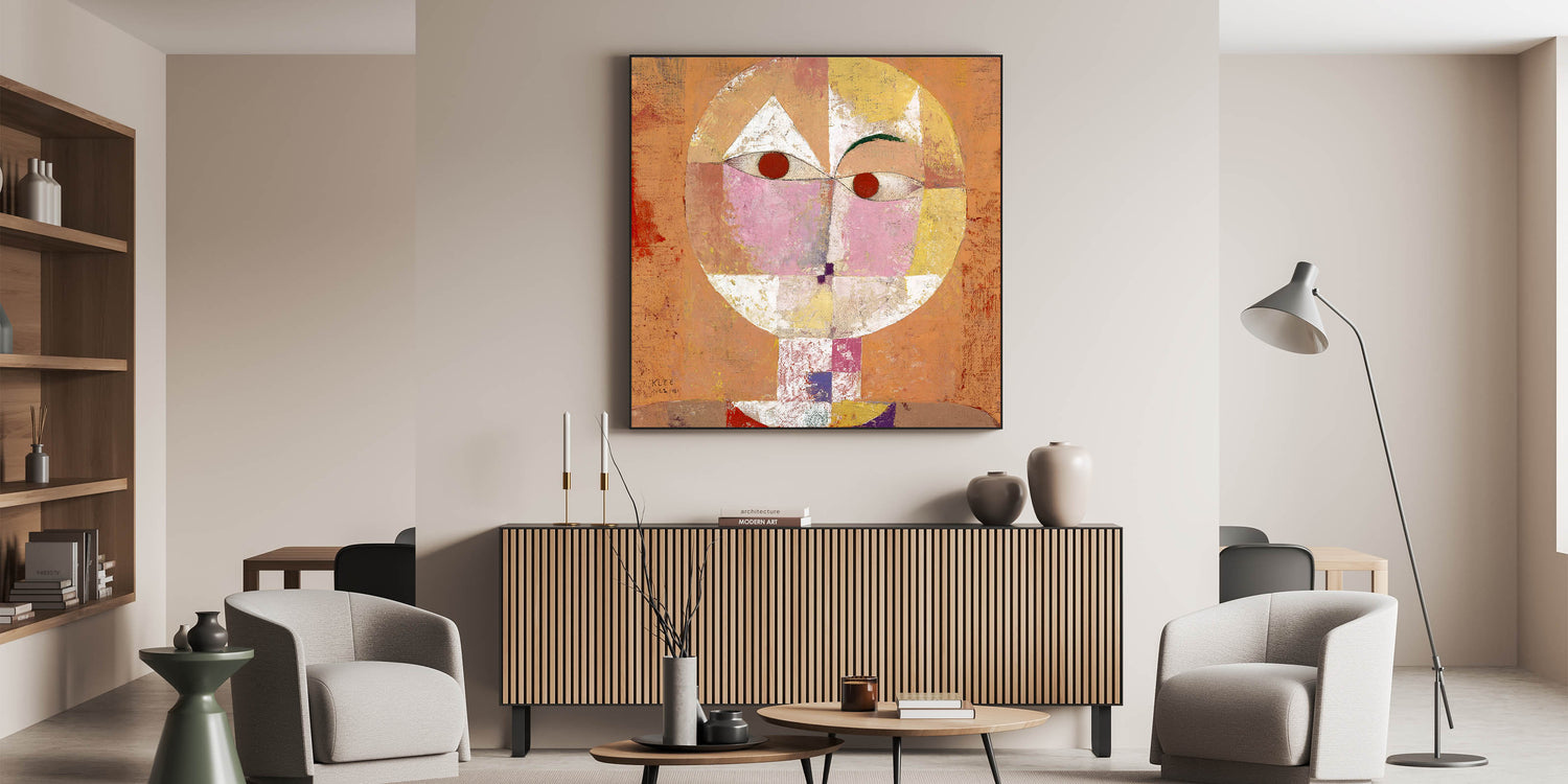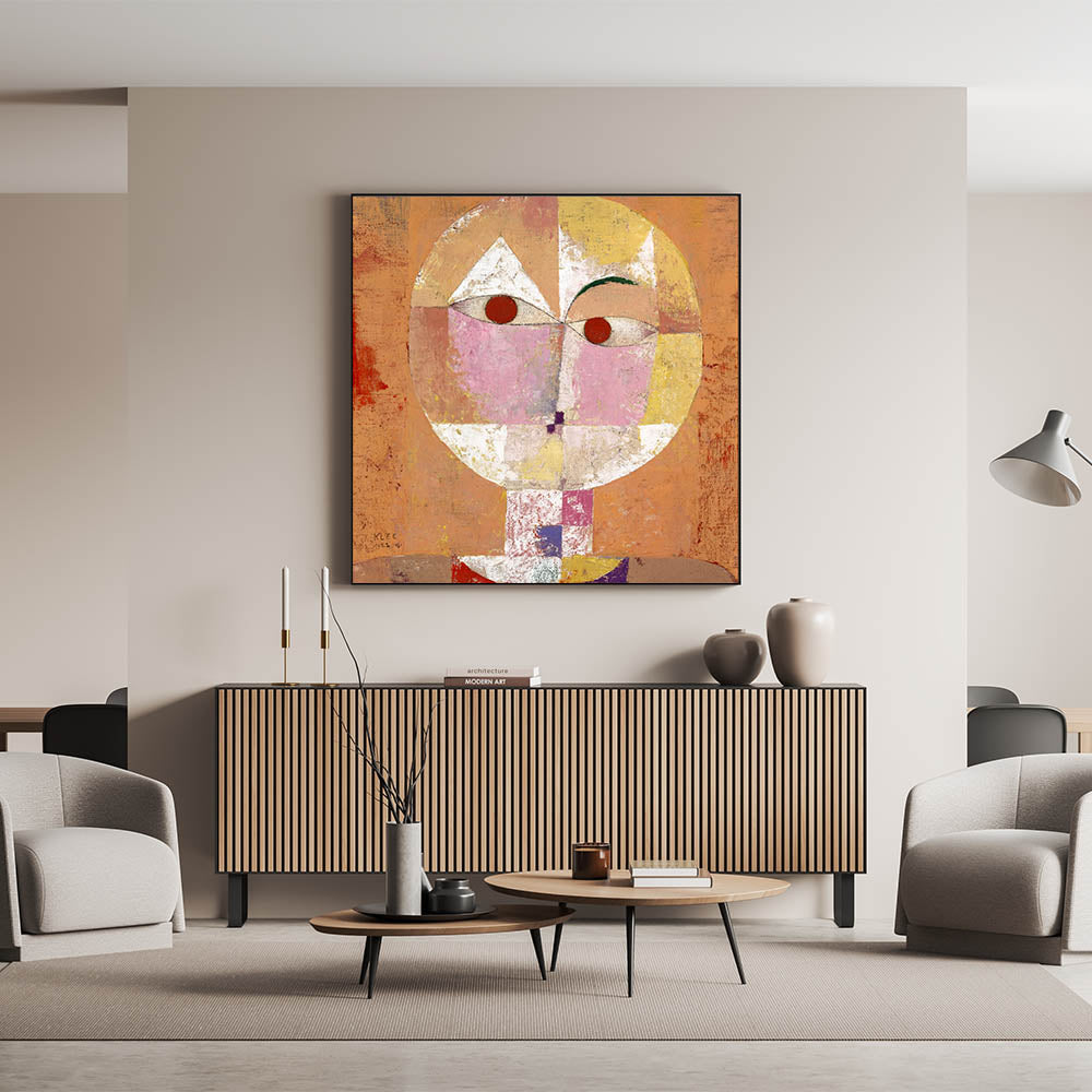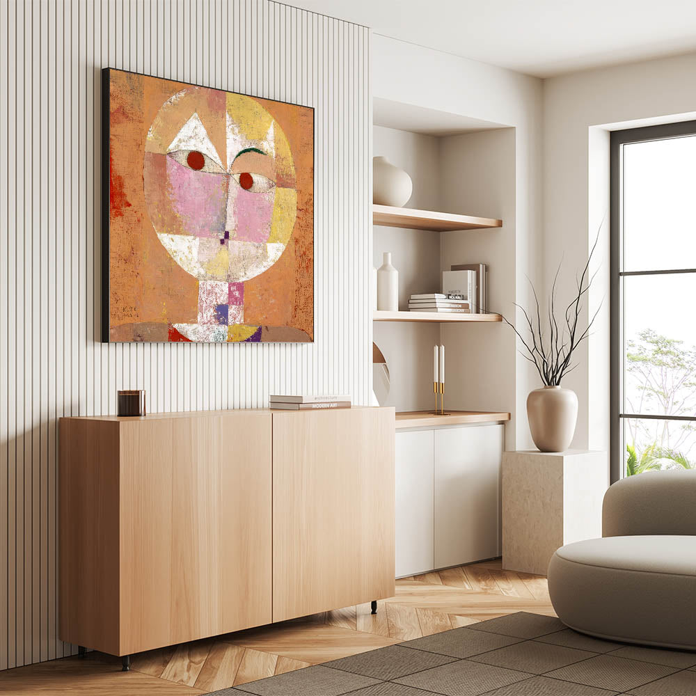 Own one of Paul Klee’s most iconic works, "Senecio," created in 1922. This abstract portrait, with its geometric shapes and vibrant colors, represents Klee’s mastery of modernist and avant-garde techniques. The captivating blend of warm oranges, reds, and soft pinks creates a visually stunning composition that’s both playful and thought-provoking. Whether you’re a seasoned art collector or just looking to add a touch of modernist sophistication to your space, this print is a timeless addition to any room. Our Paul Klee artworks for sale are available in various formats such as stretched canvas, framed prints, and acrylic glass.